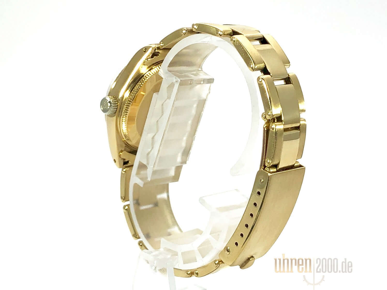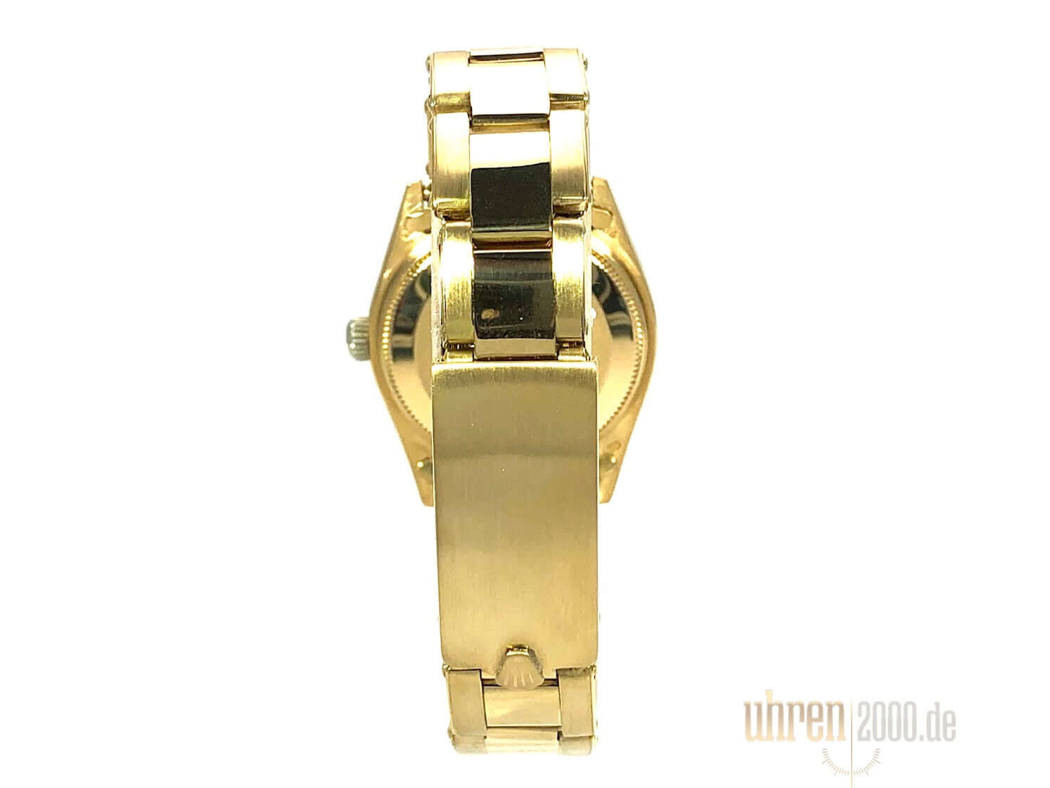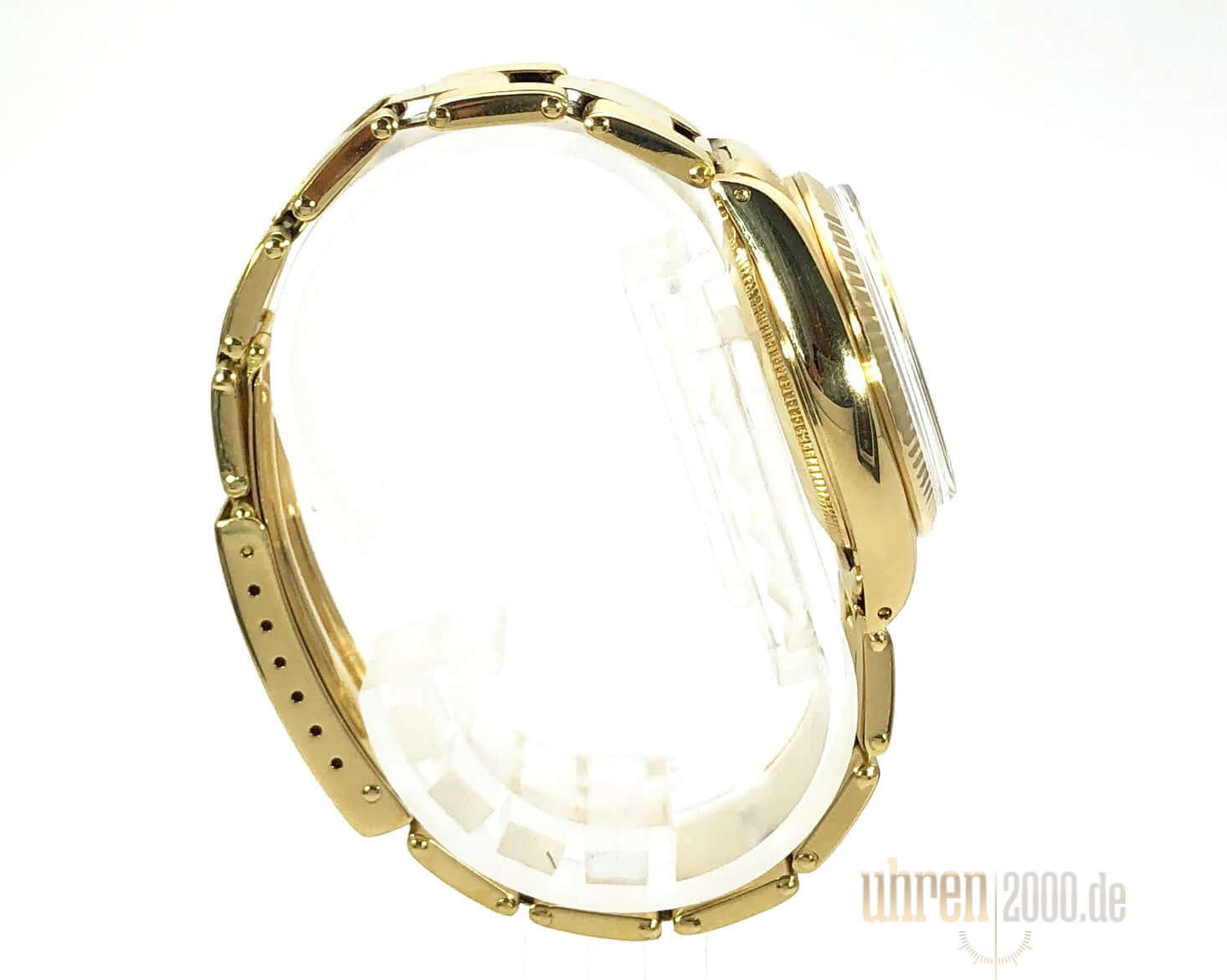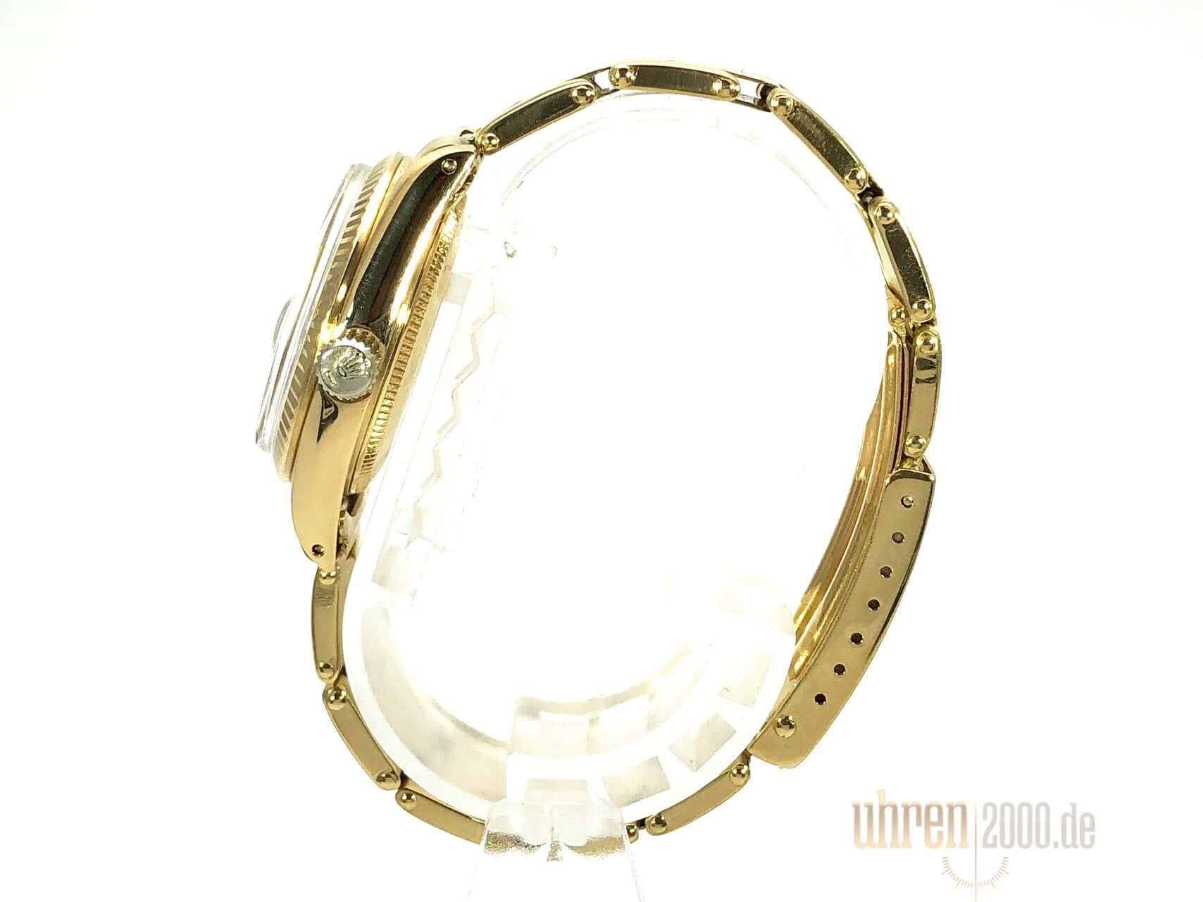 Gehäuse aus Gelbgold poliert und satiniert, Gehäusedurchmesser 31 mm, geriffelte Lünette aus Gelbgold, Gelbgold Band poliert und satiniert mit Faltschließe, Champagner Zifferblatt, goldene Zeiger, Automatikwerk, Datum, Plexiglas, verschraubter Boden aus Gelbgold, Wasserdicht bis zu 10 bar.