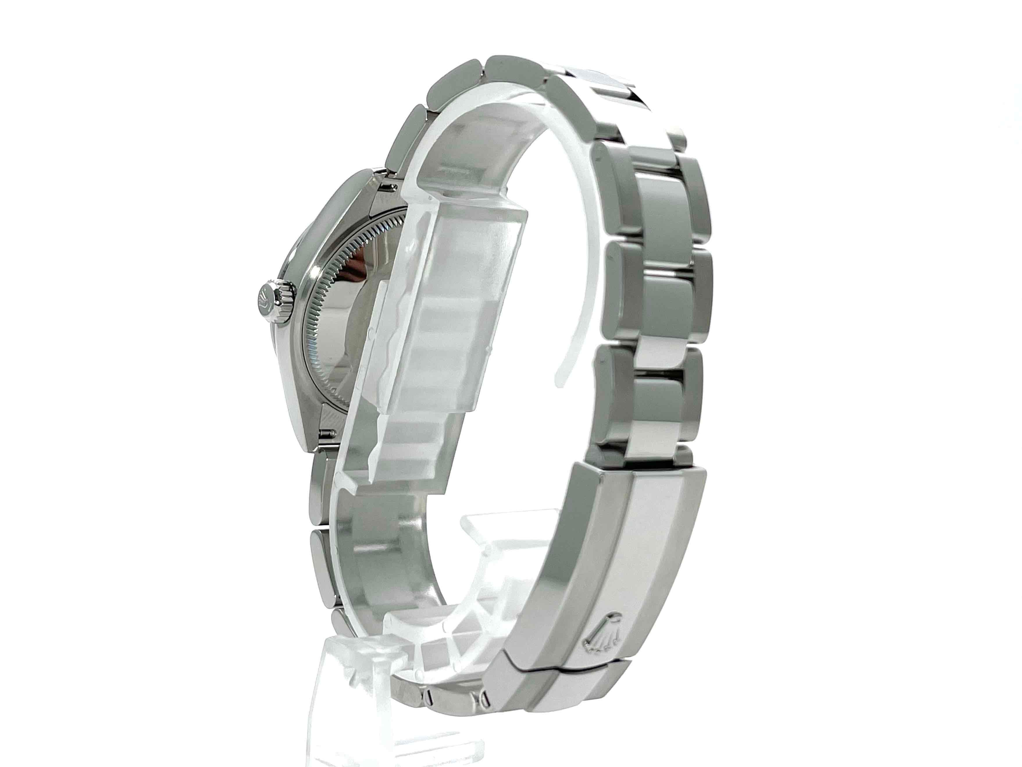 Gehäuse aus Edelstahl poliert und satiniert, Gehäusedurchmesser 31 mm, Lünette aus Edelstahl poliert, Oyster Edelstahlband poliert und satiniert mit Faltschließe, mintgrünes Zifferblatt mit aufgesetzten Leuchtindizes, Leuchtzeiger, Automatik, Rolex Manufakturkaliber 2236, 55 Stunden Gangreserve, Datum, Chronometer, Saphirglas, Krone verschraubt, Edelstahlboden verschraubt, Wasserdicht bis 10 bar.