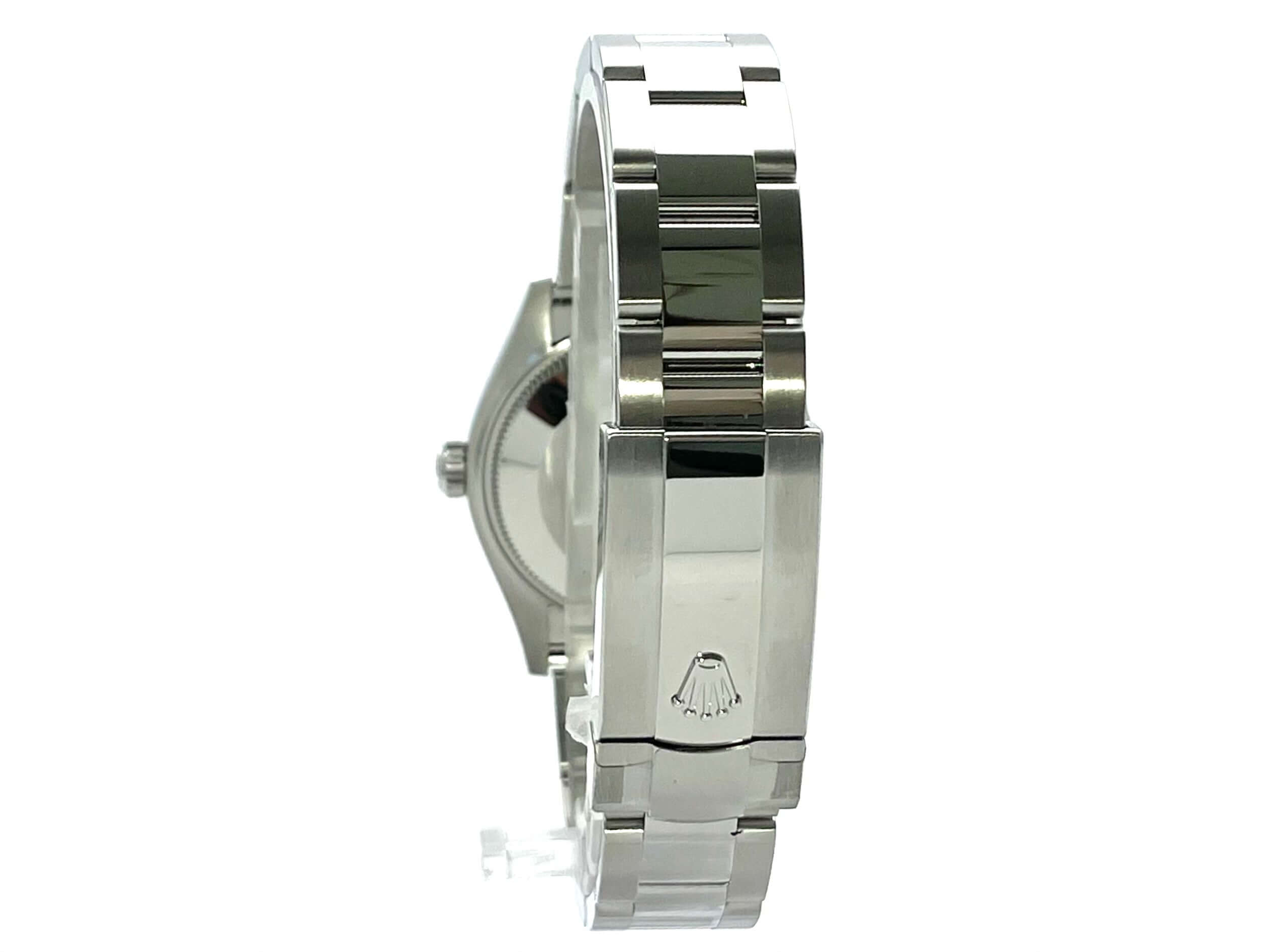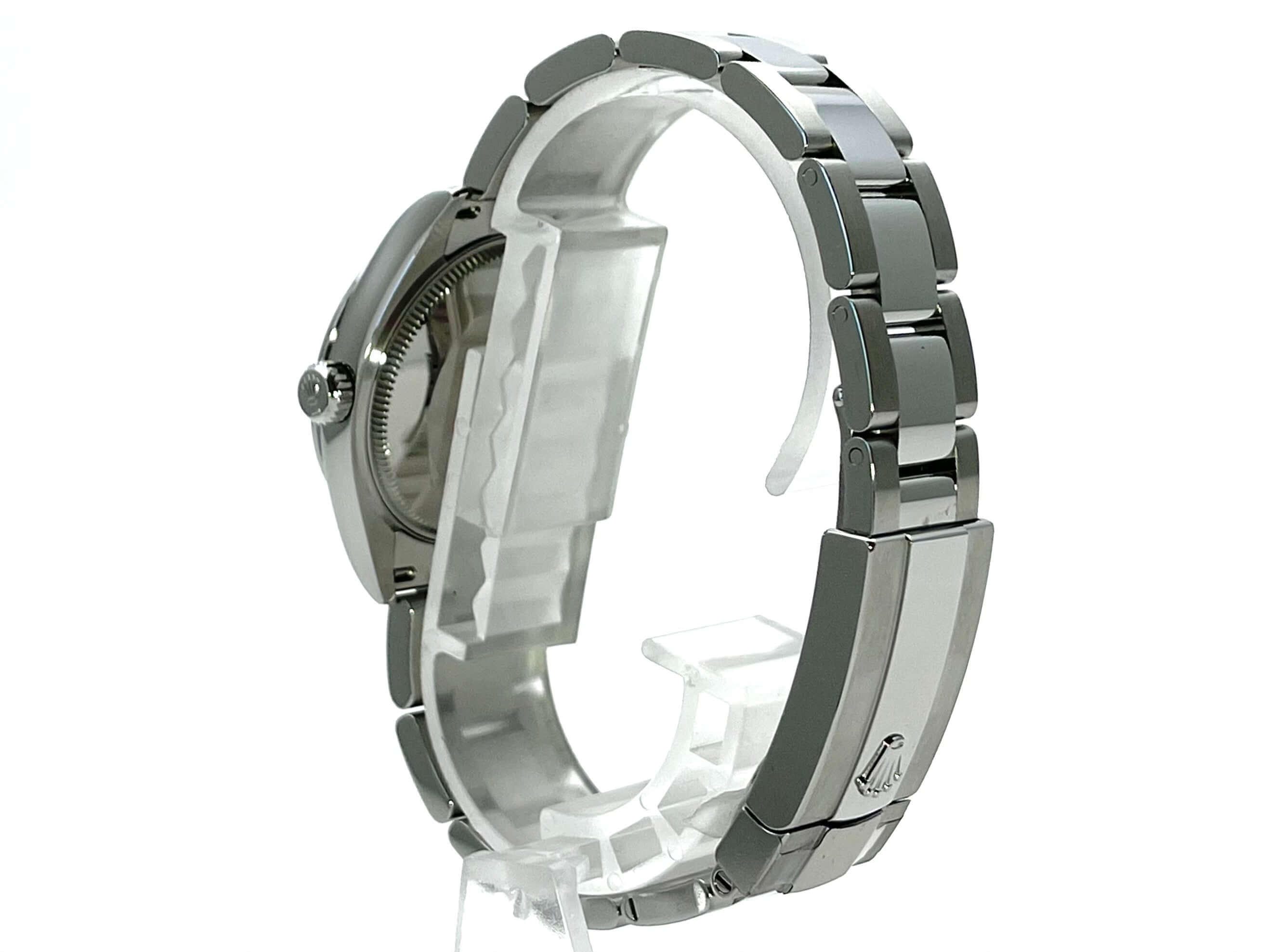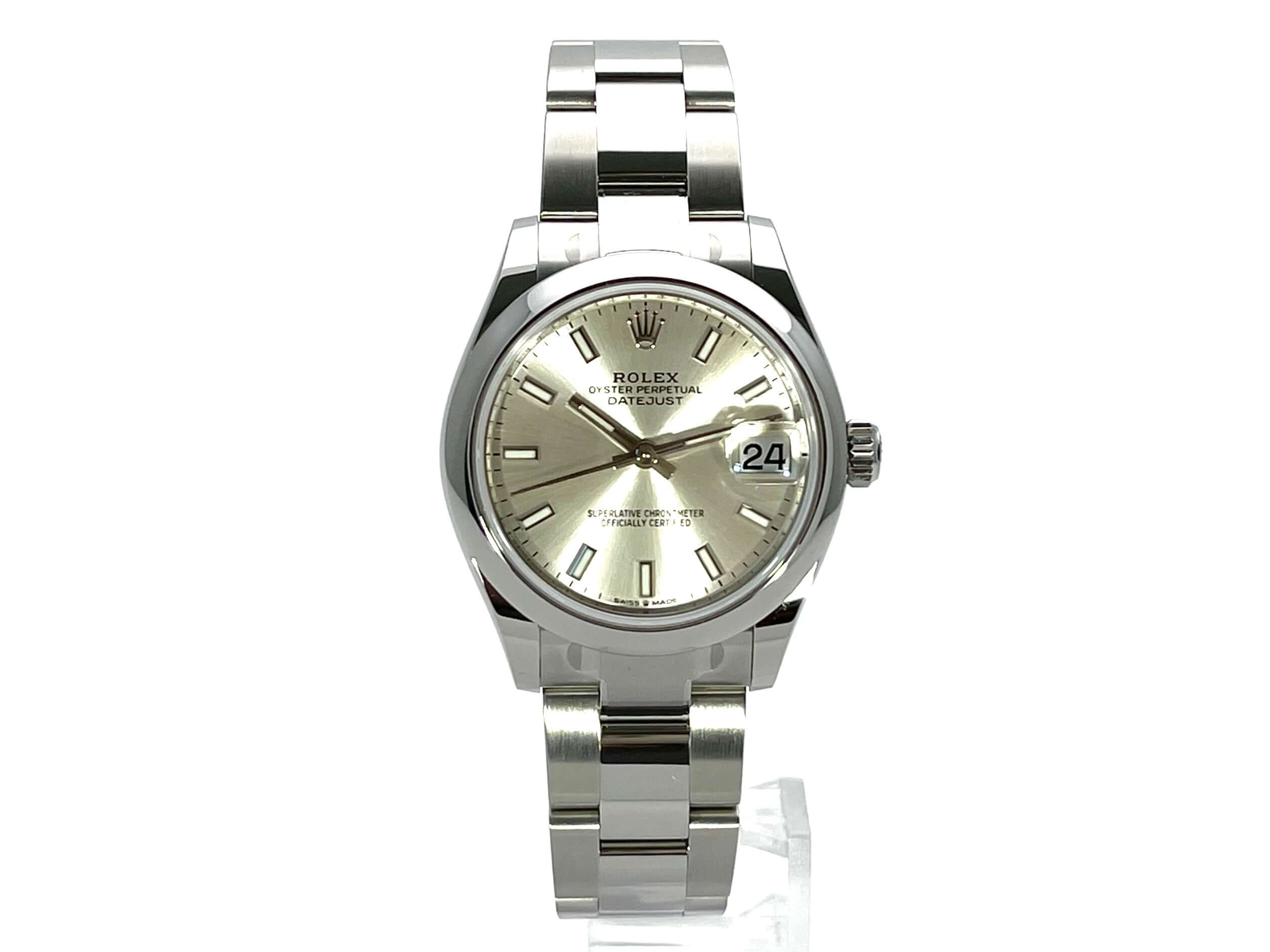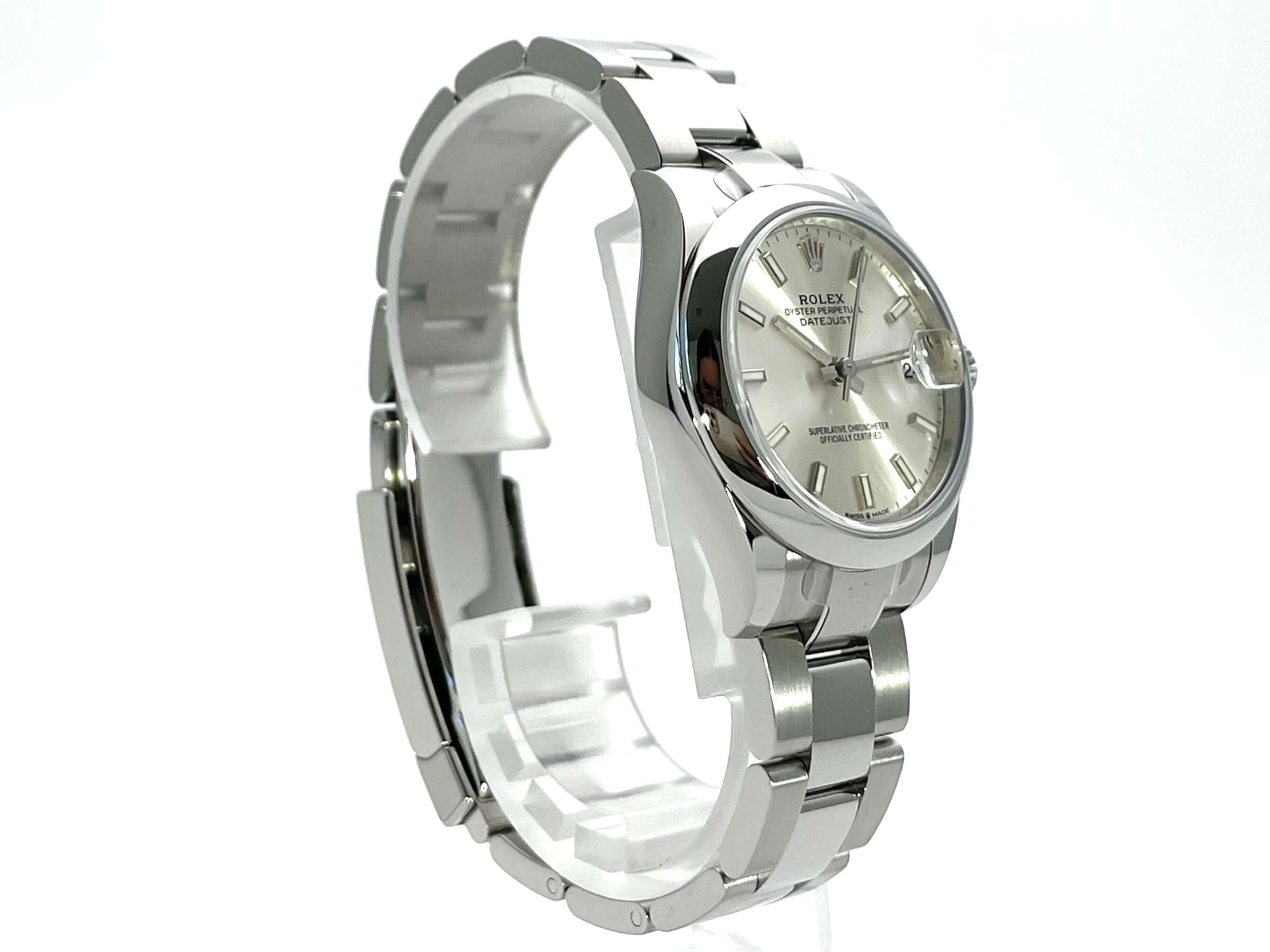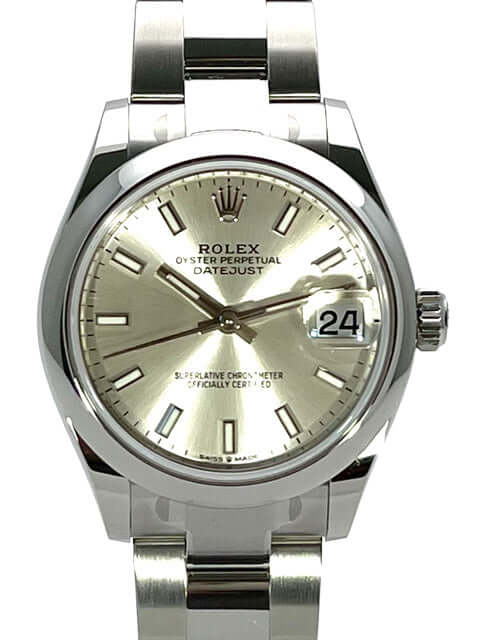 Gehäuse aus Edelstahl poliert und satiniert, Gehäusedurchmesser 31 mm, Lünette aus Edelstahl poliert, Oyster Edelstahlband poliert und satiniert mit Faltschließe, silberfarbenes Zifferblatt mit aufgesetzten Leuchtindizes, Leuchtzeiger, Automatik, Rolex Manufakturkaliber 2236, 55 Stunden Gangreserve, Datum, Chronometer, Saphirglas, Krone verschraubt, Edelstahlboden verschraubt, Wasserdicht bis 10 bar.