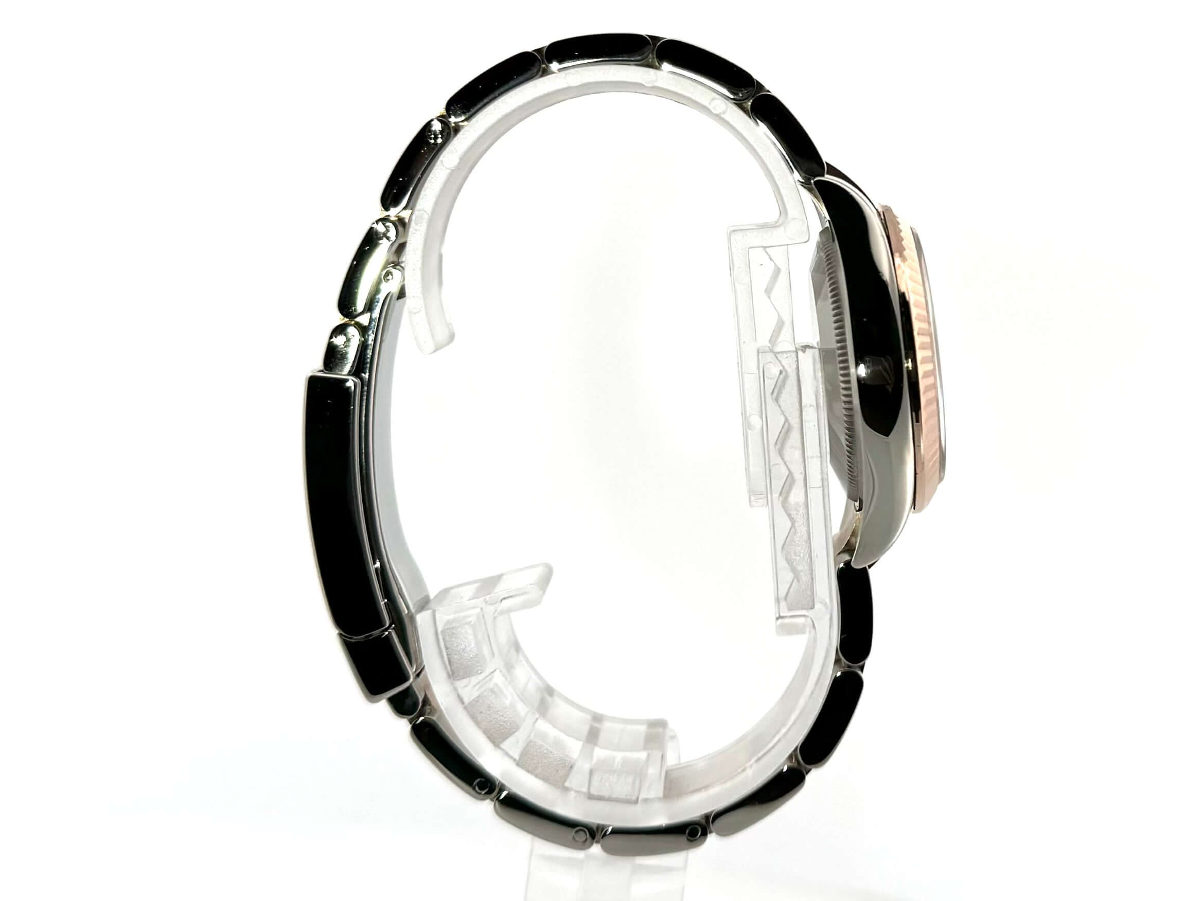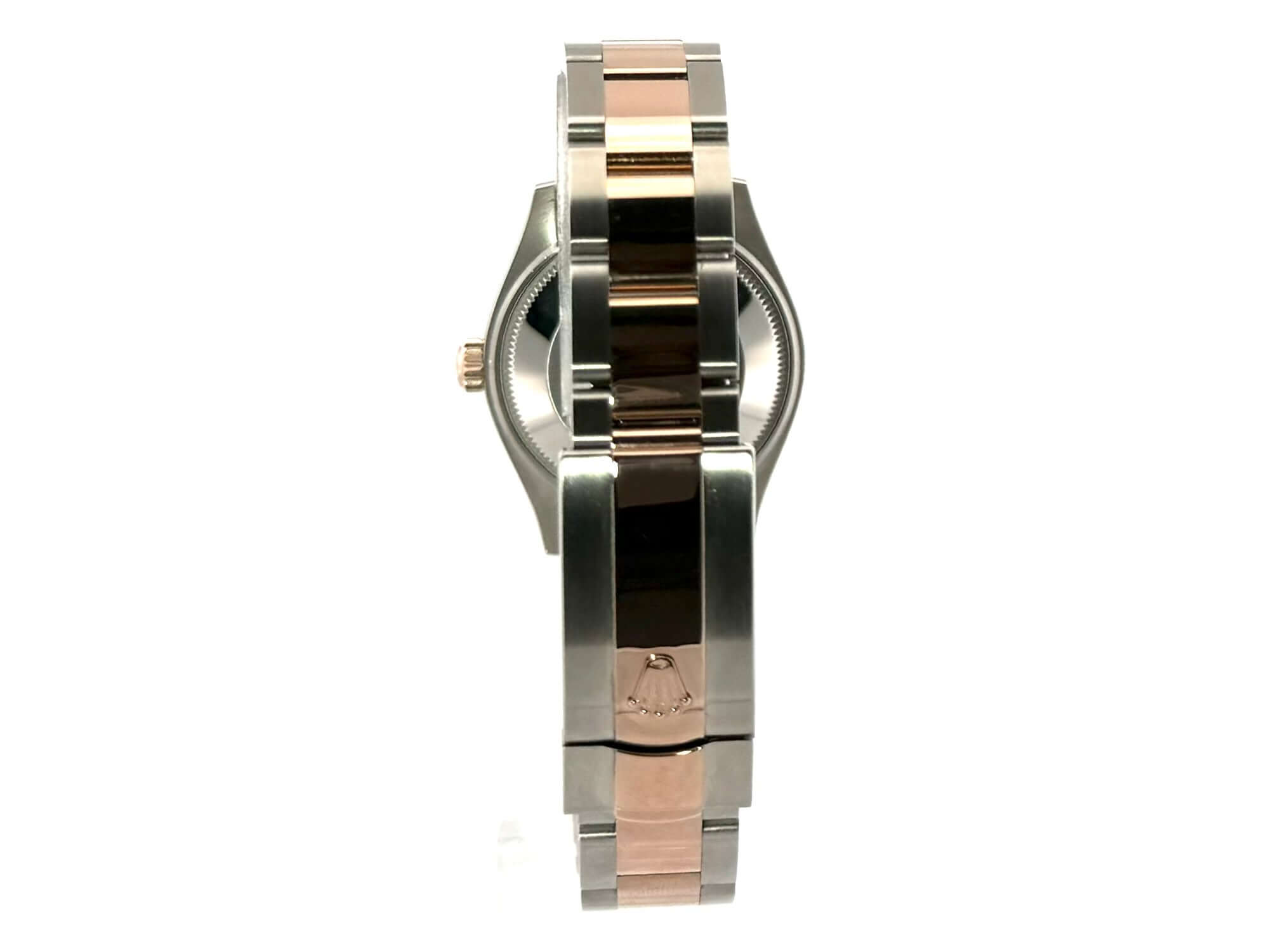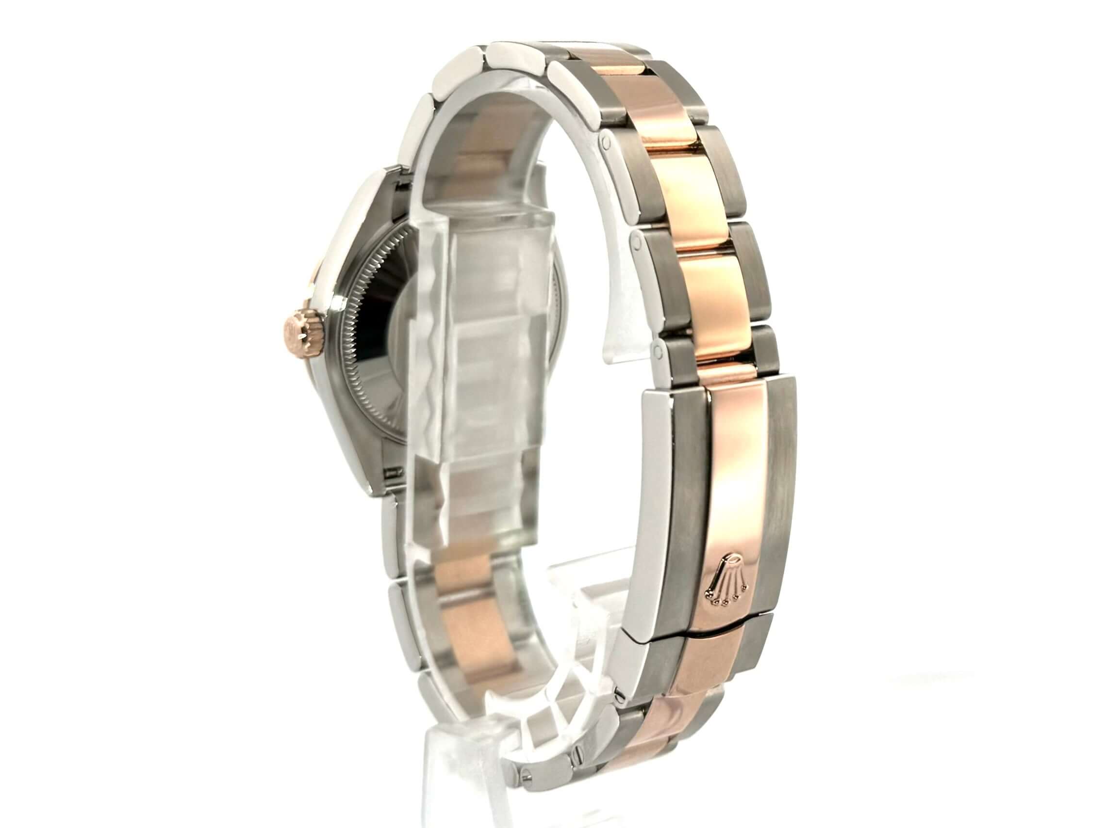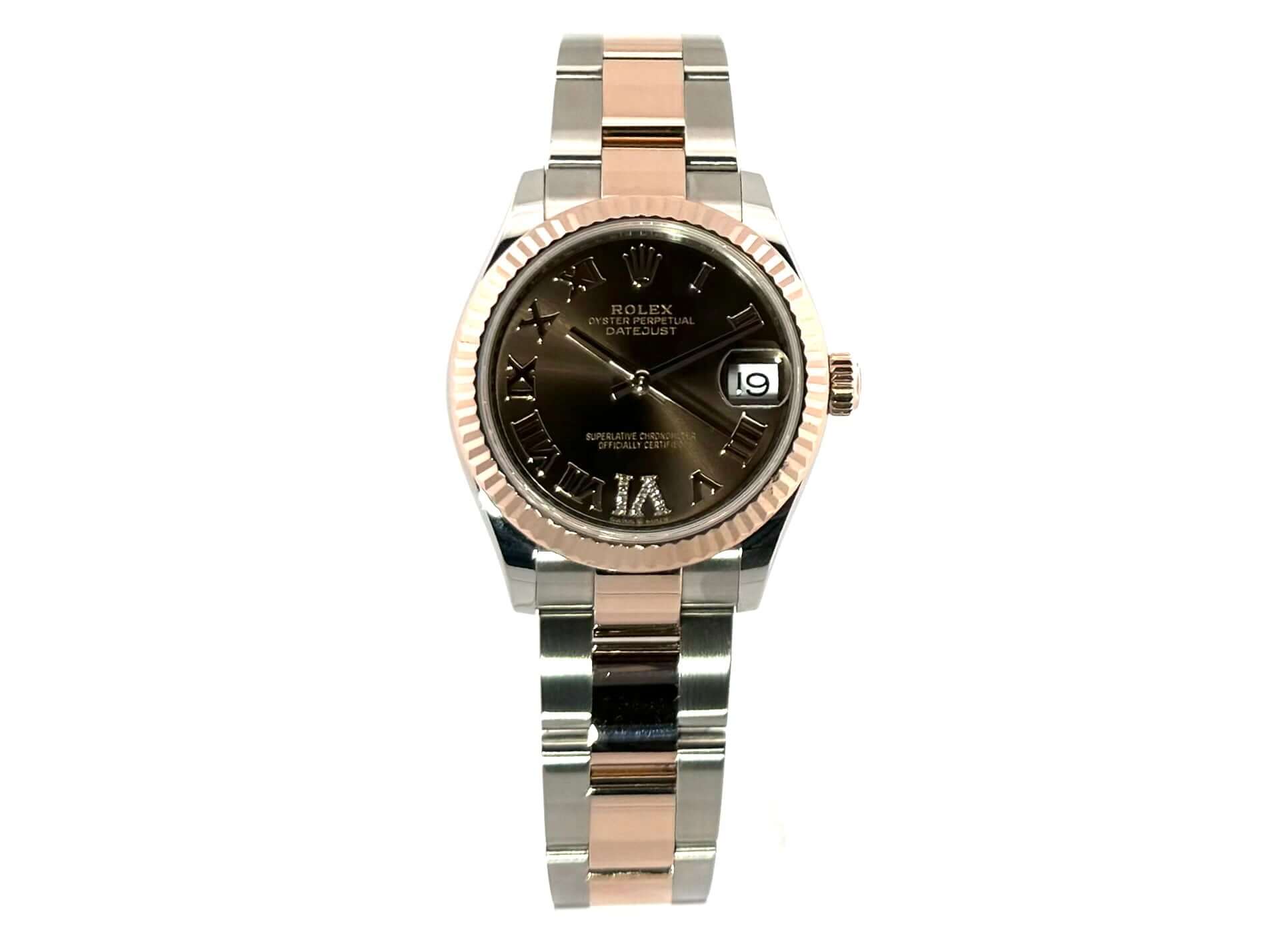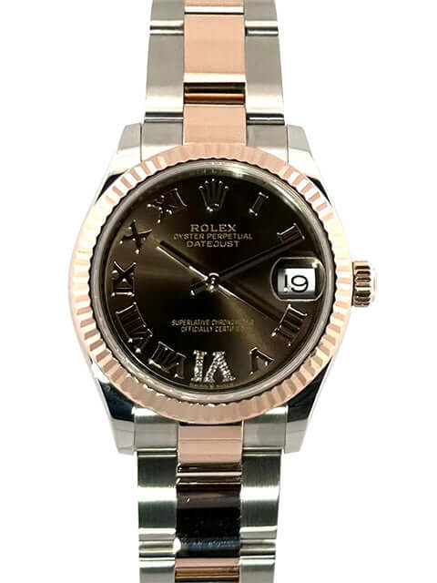 Gehäuse aus Edelstahl poliert und satiniert, Gehäusedurchmesser 31 mm, geriffelte Lünette aus 18 kt Everose-Gold, Oyster Edelstahl / 18 kt Everose-Gold Armband poliert und satiniert mit Faltschließe, braunes Zifferblatt mit römischen Ziffern und Diamanten in der römischen VI, Everose-Gold Zeiger, Automatikwerk, Rolex Manufakturkaliber 2236 mit 31 Steine, 28.800 A/h, 55 Stunden Gangreserve, Datum, Chronometer, kratzfestes Saphirglas, verschraubte Krone aus 18 kt Everose-Gold, Edelstahlboden verschraubt, Wasserdicht bis zu 10 bar.