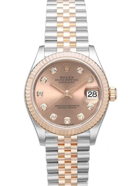 Gehäuse aus Edelstahl poliert und satiniert, Gehäusedurchmesser 31 mm, geriffelte Lünette aus 18 kt Everose-Gold, Jubile Edelstahl / 18 kt Everose-Gold Armband poliert und satiniert mit Faltschließe, Pinkfarbenes Zifferblatt mit 10 Diamanten besetzt, Everose-Gold Zeiger, Automatikwerk, Rolex Manufakturkaliber 2236 mit 31 Steine, 28.800 A/h, 55 Stunden Gangreserve, Datum, Chronometer, kratzfestes Saphirglas, verschraubte Krone aus 18 kt Everose-Gold, Edelstahlboden verschraubt, Wasserdicht bis zu 10 bar.