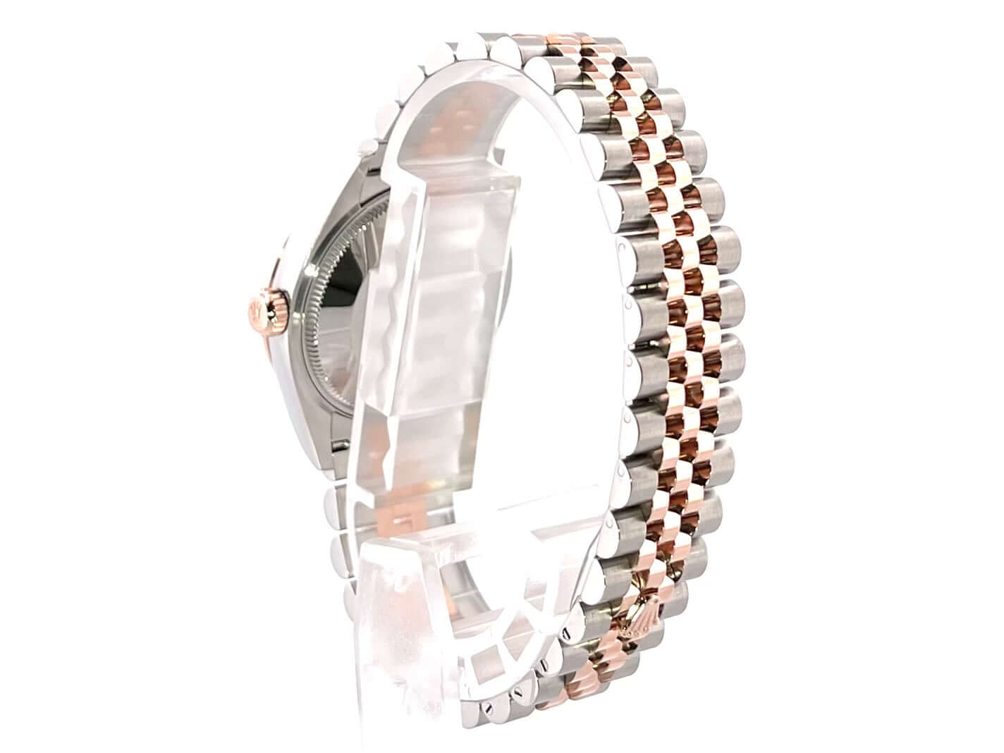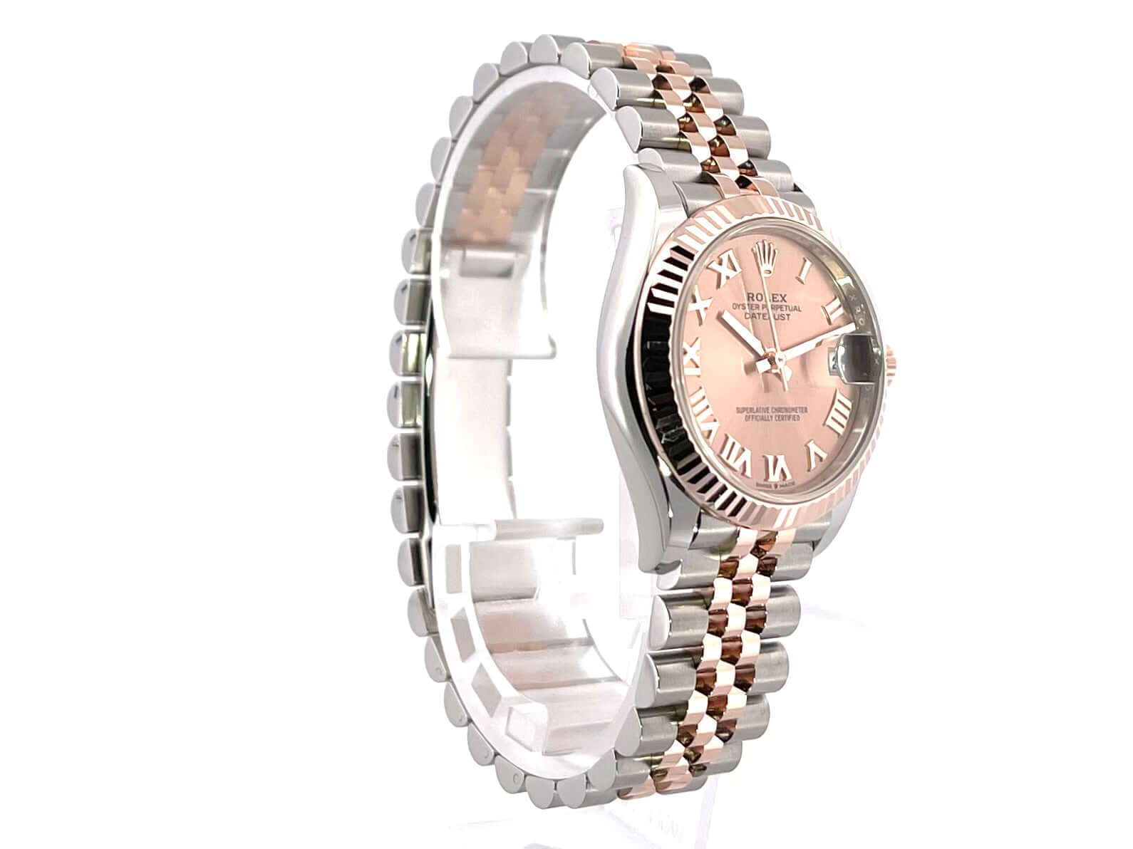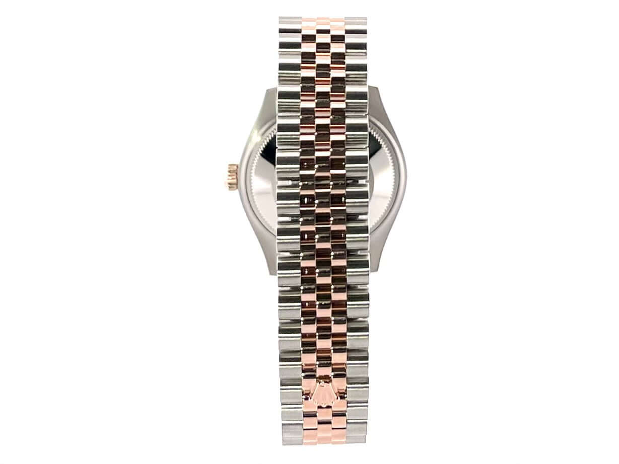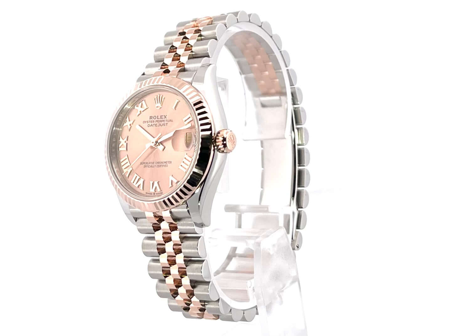 Gehäuse aus Edelstahl poliert und satiniert, Gehäusedurchmesser 31 mm, geriffelte Lünette aus 18 kt Everose-Gold, Jubile Edelstahl / 18 kt Everose-Gold Armband poliert und satiniert mit Faltschließe, roséfarbenes Zifferblatt mit römischen Ziffern, Everose-Gold Zeiger, Automatikwerk, Rolex Manufakturkaliber 2236 mit 31 Steine, 28.800 A/h, 55 Stunden Gangreserve, Datum, Chronometer, kratzfestes Saphirglas, verschraubte Krone aus 18 kt Everose-Gold, Edelstahlboden verschraubt, Wasserdicht bis zu 10 bar.