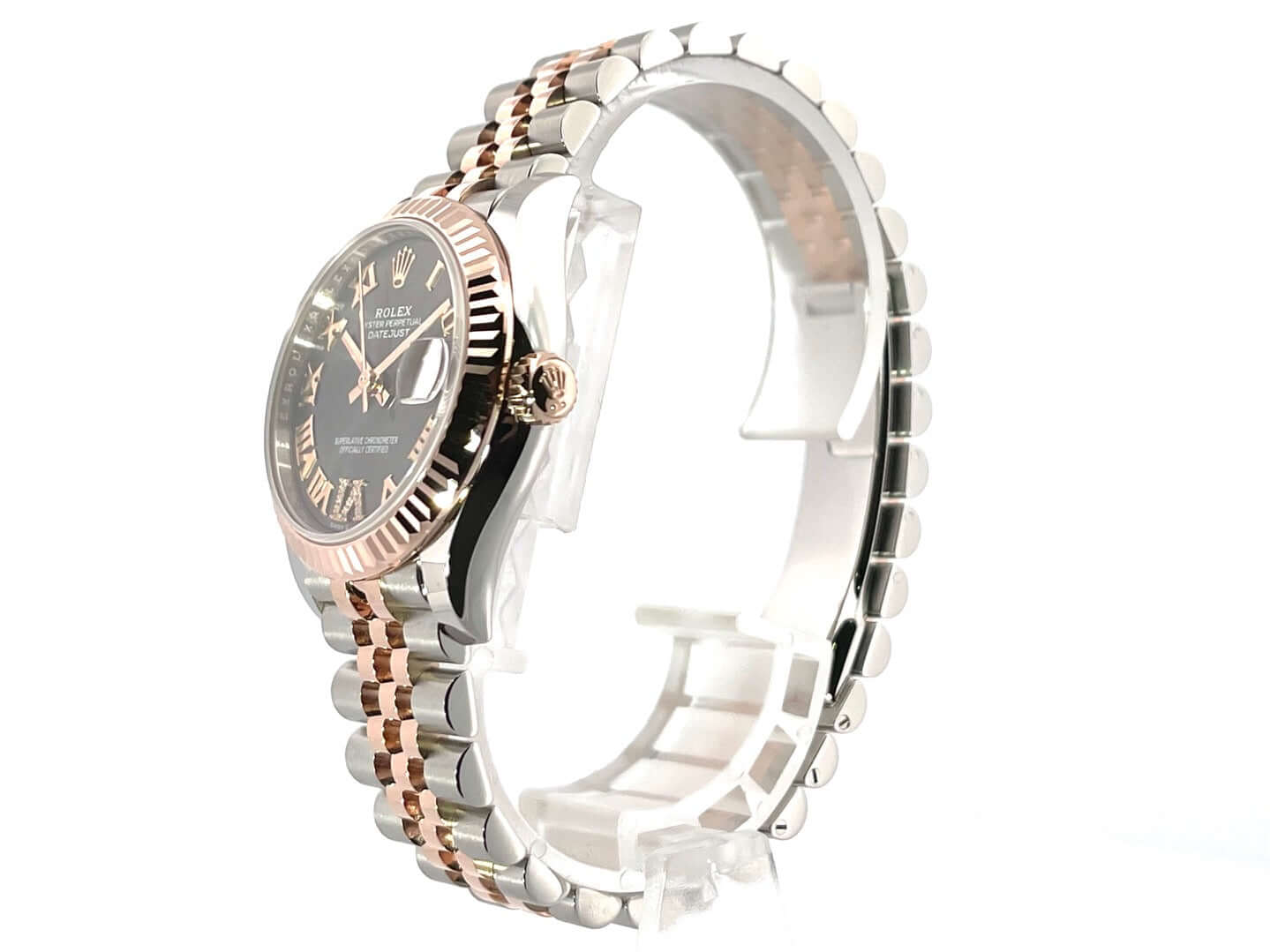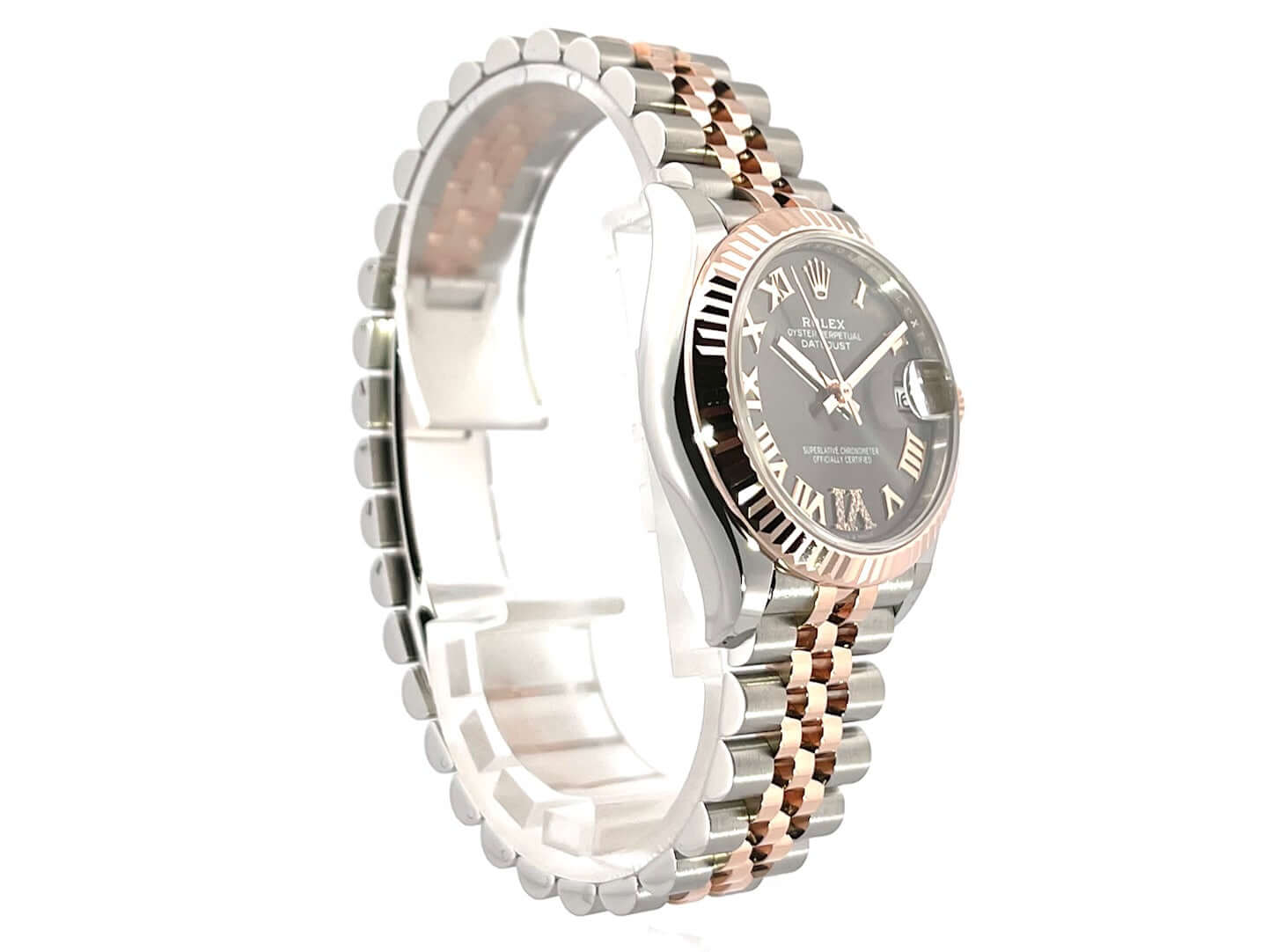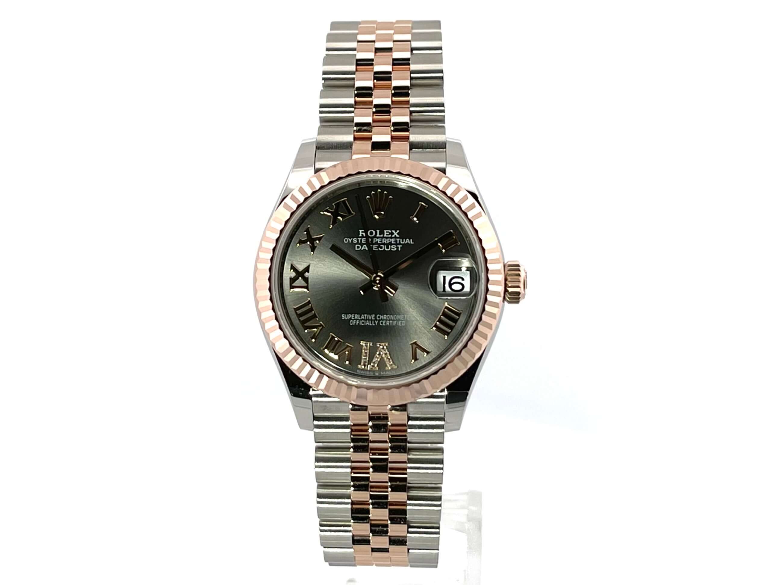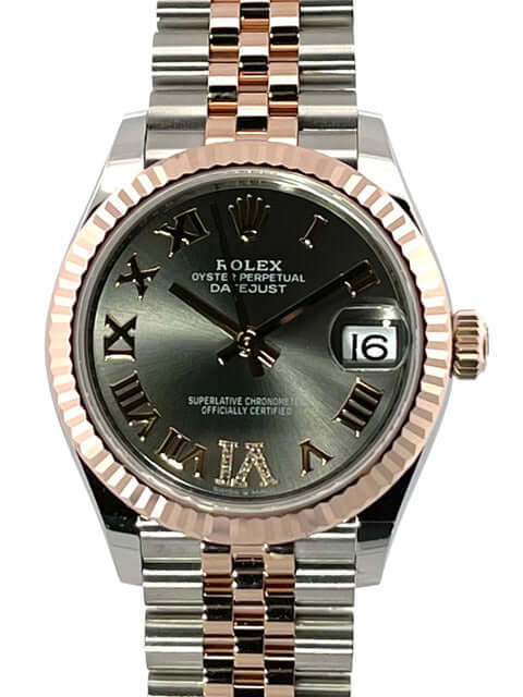 Gehäuse aus Edelstahl poliert und satiniert, Gehäusedurchmesser 31 mm, geriffelte Lünette aus 18 kt Everose-Gold, Jubile Edelstahl / 18 kt Everose-Gold Armband poliert und satiniert mit Faltschließe, schiefergraues Zifferblatt mit römischen Ziffern und Diamanten in der römischen VI, Everose-Gold Zeiger, Automatikwerk, Rolex Manufakturkaliber 2236 mit 31 Steine, 28.800 A/h, 55 Stunden Gangreserve, Datum, Chronometer, kratzfestes Saphirglas, verschraubte Krone aus 18 kt Everose-Gold, Edelstahlboden verschraubt, Wasserdicht bis zu 10 bar.
