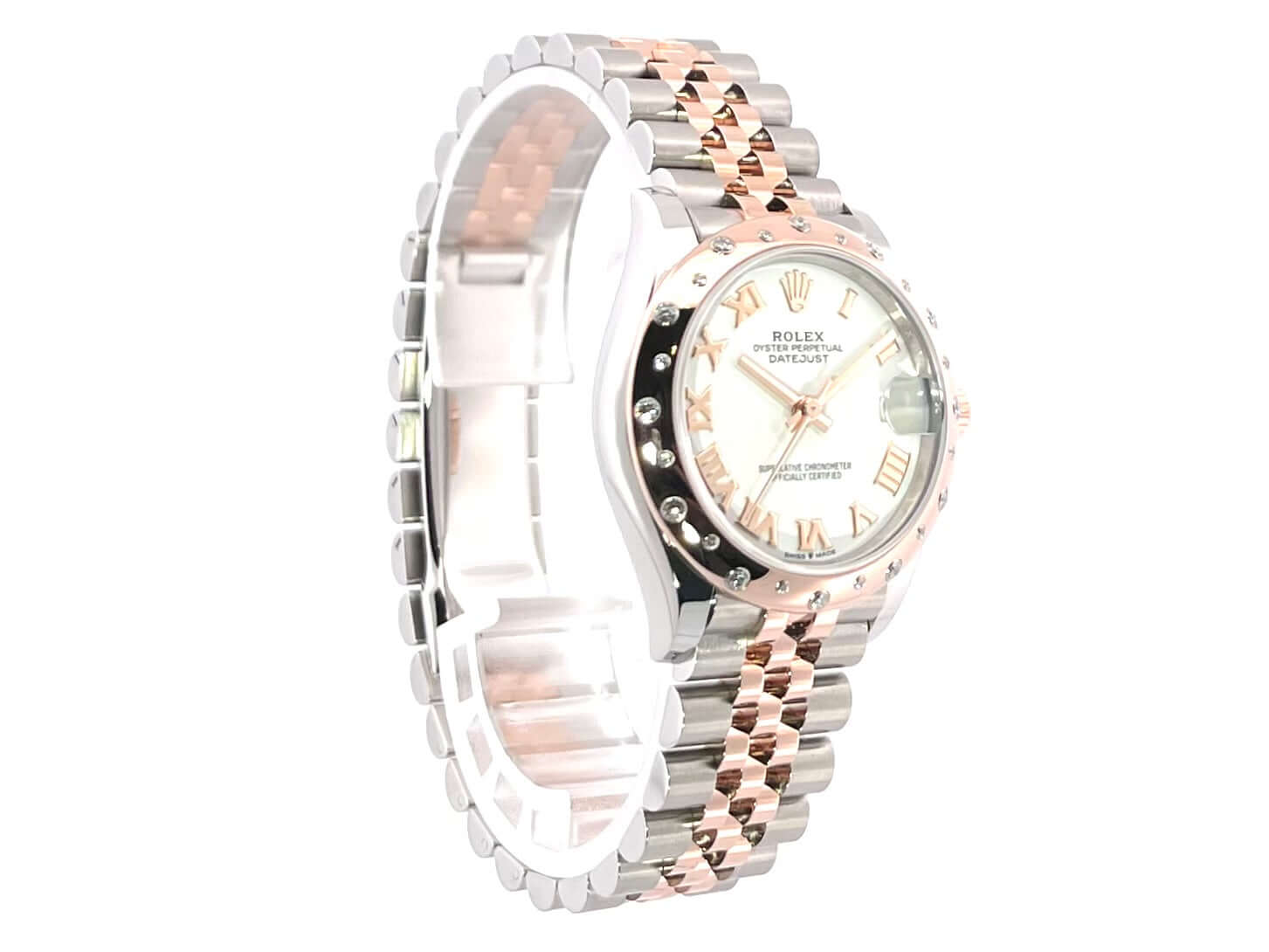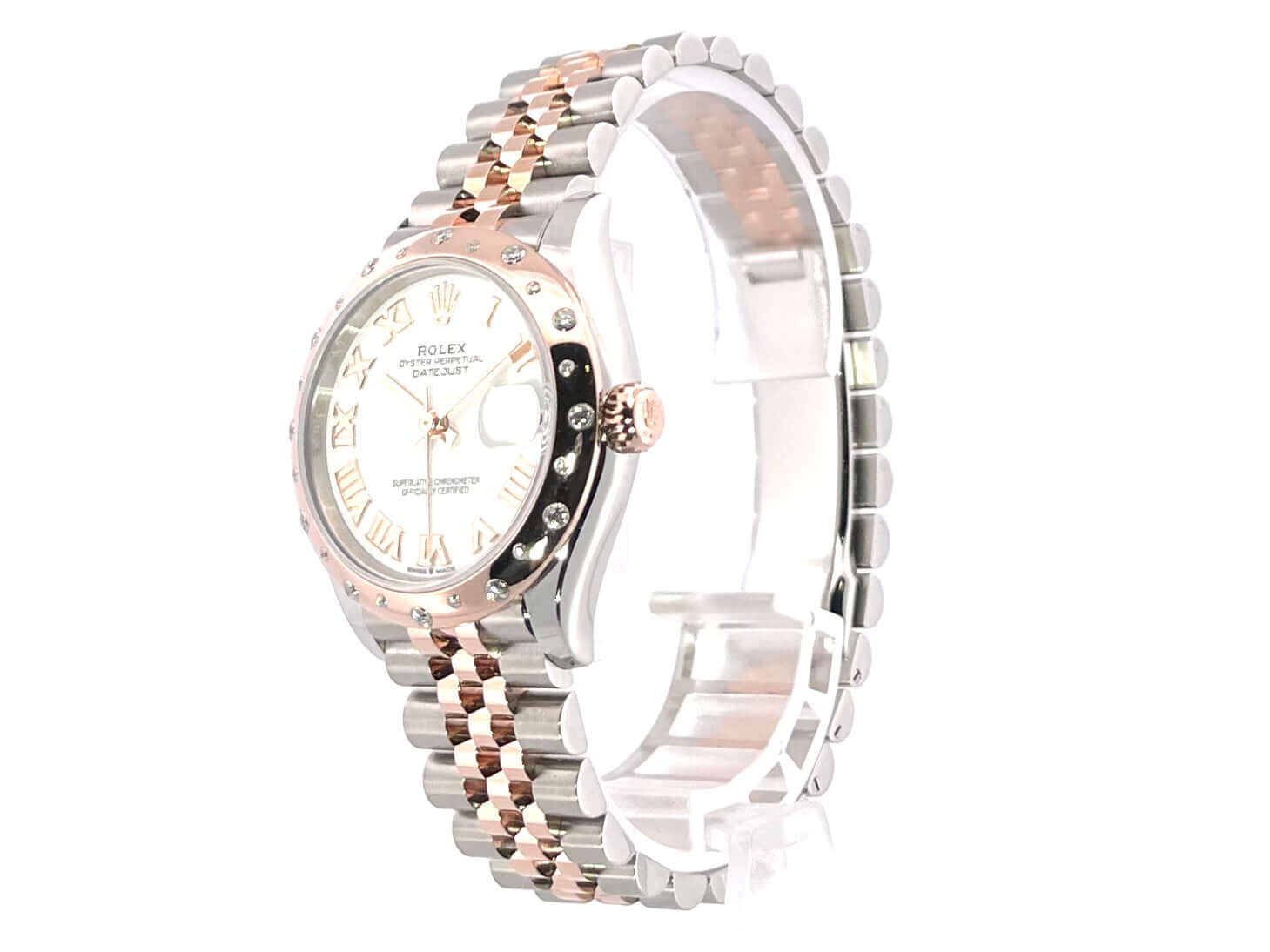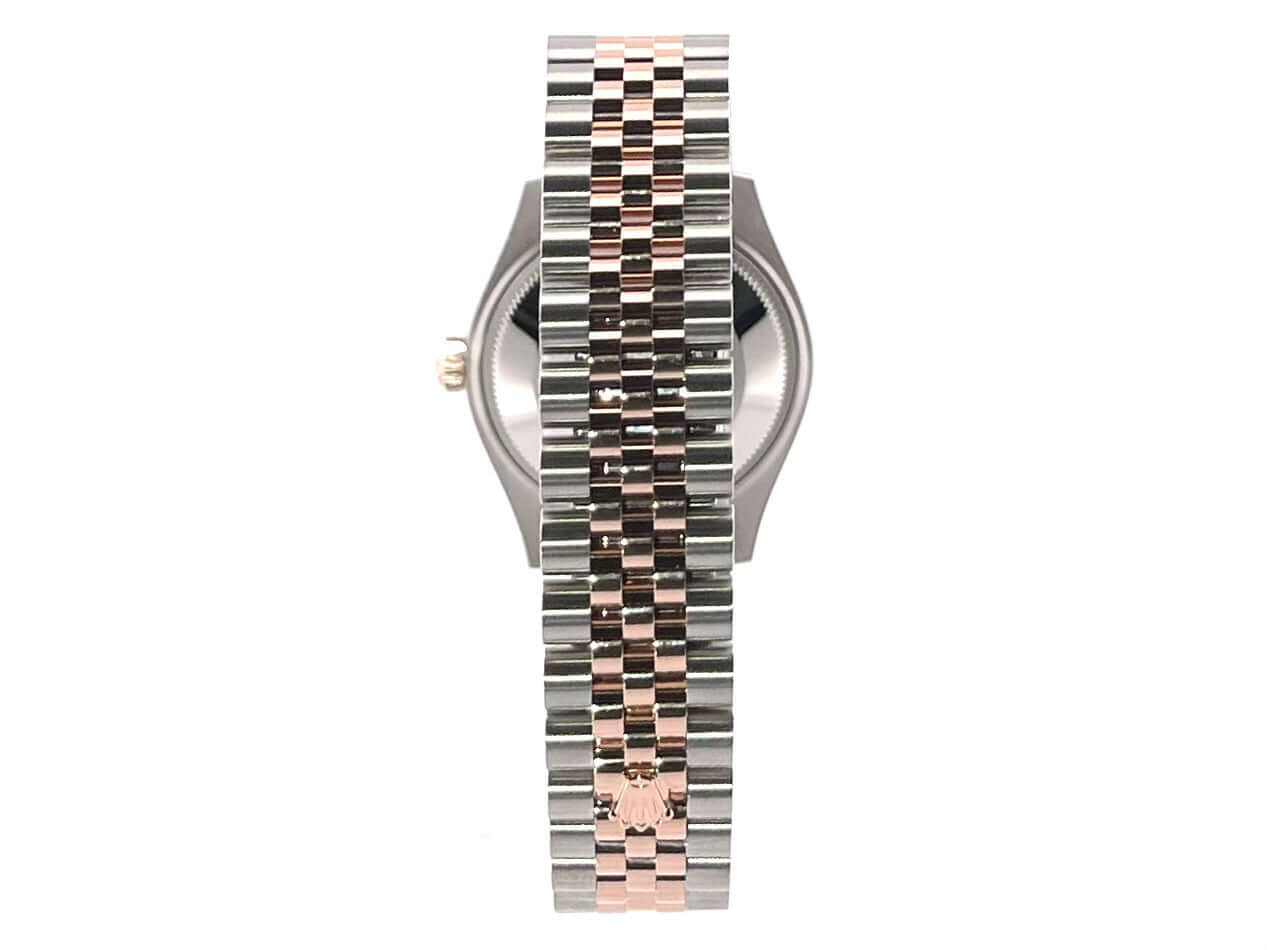 Gehäuse aus Edelstahl poliert und satiniert, Gehäusedurchmesser 31 mm, polierte Lünette aus 18 kt Everose-Gold mit Diamanten besetzt, Jubile Edelstahl / 18 kt Everose-Gold Armband poliert und satiniert mit Faltschließe, weißes Zifferblatt mit römischen Ziffern, Everose-Gold Zeiger, Automatikwerk, Rolex Manufakturkaliber 2236 mit 31 Steine, 28.800 A/h, 55 Stunden Gangreserve, Datum, Chronometer, kratzfestes Saphirglas, verschraubte Krone aus 18 kt Everose-Gold, Edelstahlboden verschraubt, Wasserdicht bis zu 10 bar.