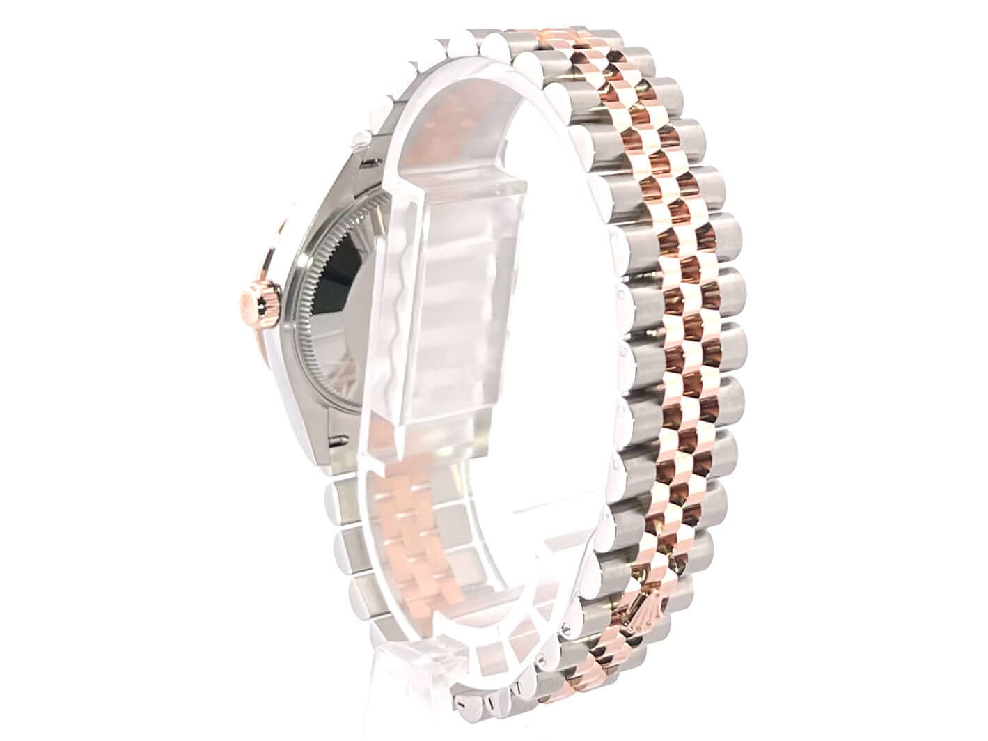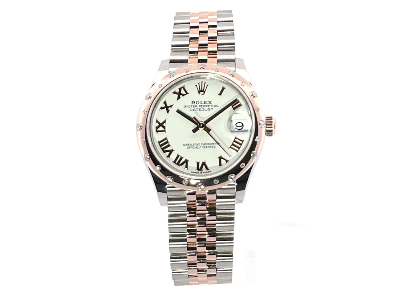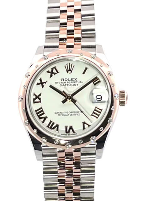Gehäuse aus Edelstahl poliert und satiniert, Gehäusedurchmesser 31 mm, polierte Lünette aus 18 kt Everose-Gold mit Diamanten besetzt, Jubile Edelstahl / 18 kt Everose-Gold Armband poliert und satiniert mit Faltschließe, weißes Zifferblatt mit römischen Ziffern, Everose-Gold Zeiger, Automatikwerk, Rolex Manufakturkaliber 2236 mit 31 Steine, 28.800 A/h, 55 Stunden Gangreserve, Datum, Chronometer, kratzfestes Saphirglas, verschraubte Krone aus 18 kt Everose-Gold, Edelstahlboden verschraubt, Wasserdicht bis zu 10 bar.