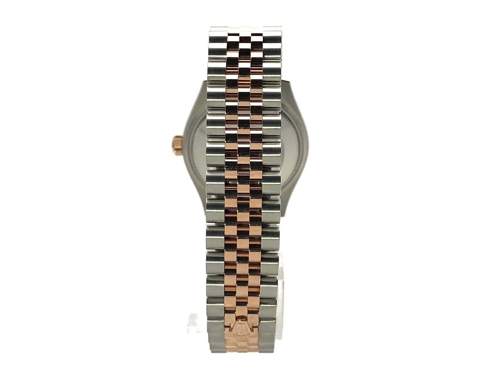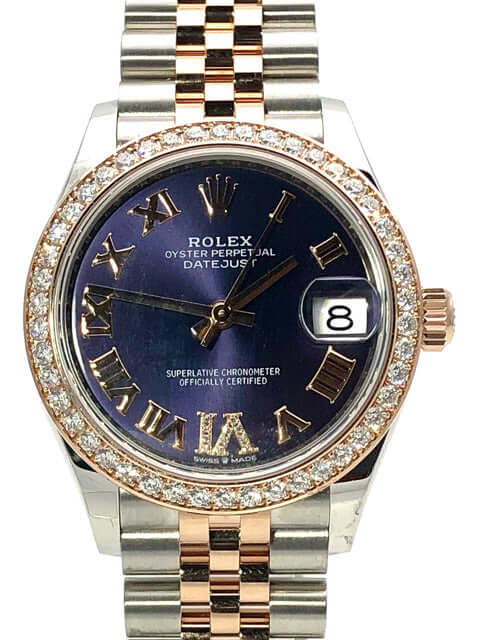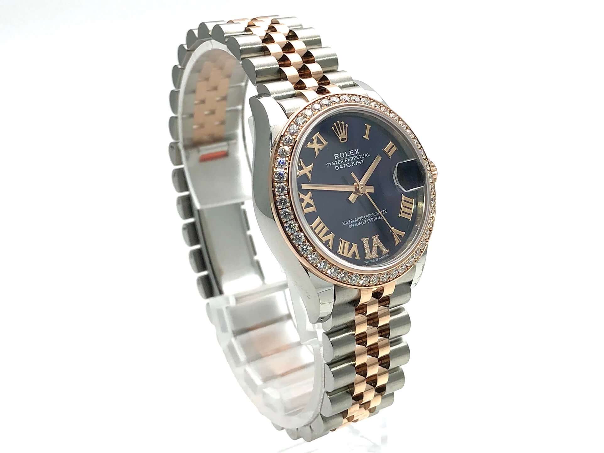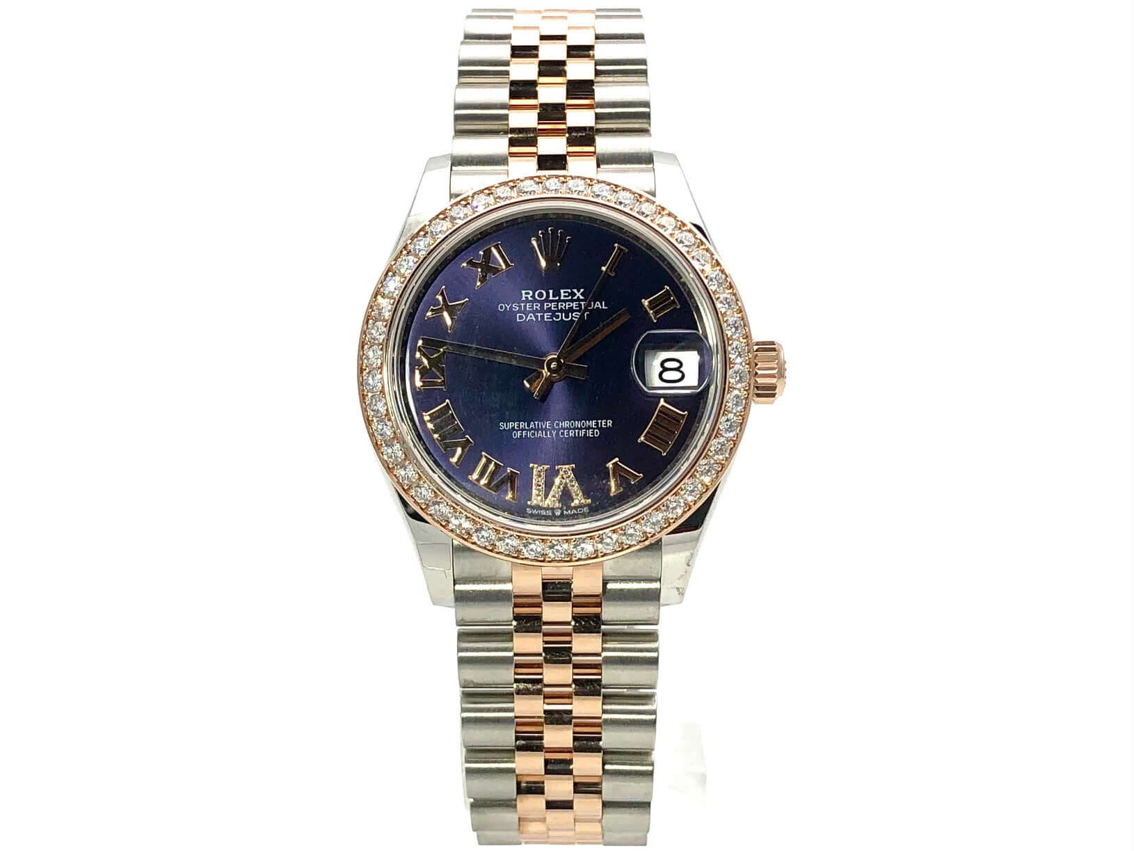 Gehäuse aus Edelstahl poliert und satiniert, Gehäusedurchmesser 31 mm, Lünette aus 18 kt Everose-Gold mit Diamanten besetzt, Jubile Edelstahl / 18 kt Everose-Gold Armband poliert und satiniert mit Faltschließe, Auberginefarbenes Zifferblatt mit römischen Ziffern und Diamanten in der Römisch VI, Everose-Gold Zeiger, Automatikwerk, Rolex Manufakturkaliber 2236 mit 31 Steine, 28.800 A/h, 55 Stunden Gangreserve, Datum, Chronometer, kratzfestes Saphirglas, verschraubte Krone aus 18 kt Everose-Gold, Edelstahlboden verschraubt, Wasserdicht bis zu 10 bar.