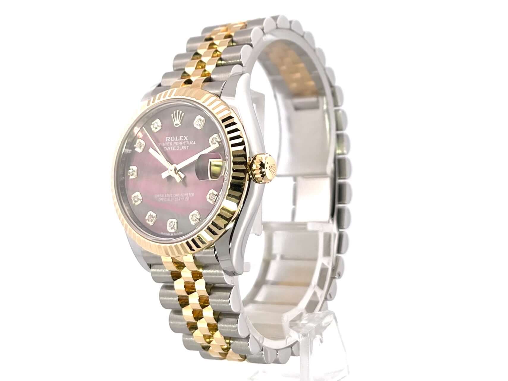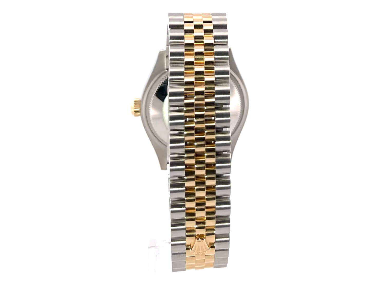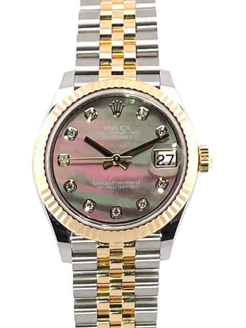 Gehäuse aus Edelstahl poliert und satiniert, Gehäusedurchmesser 31 mm, geriffelte Lünette aus 18 kt Gelbgold, Jubile Edelstahl / 18 kt Gelbgold Armband poliert und satiniert mit Faltschließe, dunkles Perlmutt Zifferblatt mit 10 Diamanten, goldene Zeiger, Automatikwerk, Rolex Manufakturkaliber 2236 mit 31 Steine, 28.800 A/h, 55 Stunden Gangreserve, Datum, Chronometer, kratzfestes Saphirglas, verschraubte Krone aus 18 kt Gelbgold, Edelstahlboden verschraubt, Wasserdicht bis zu 10 bar.