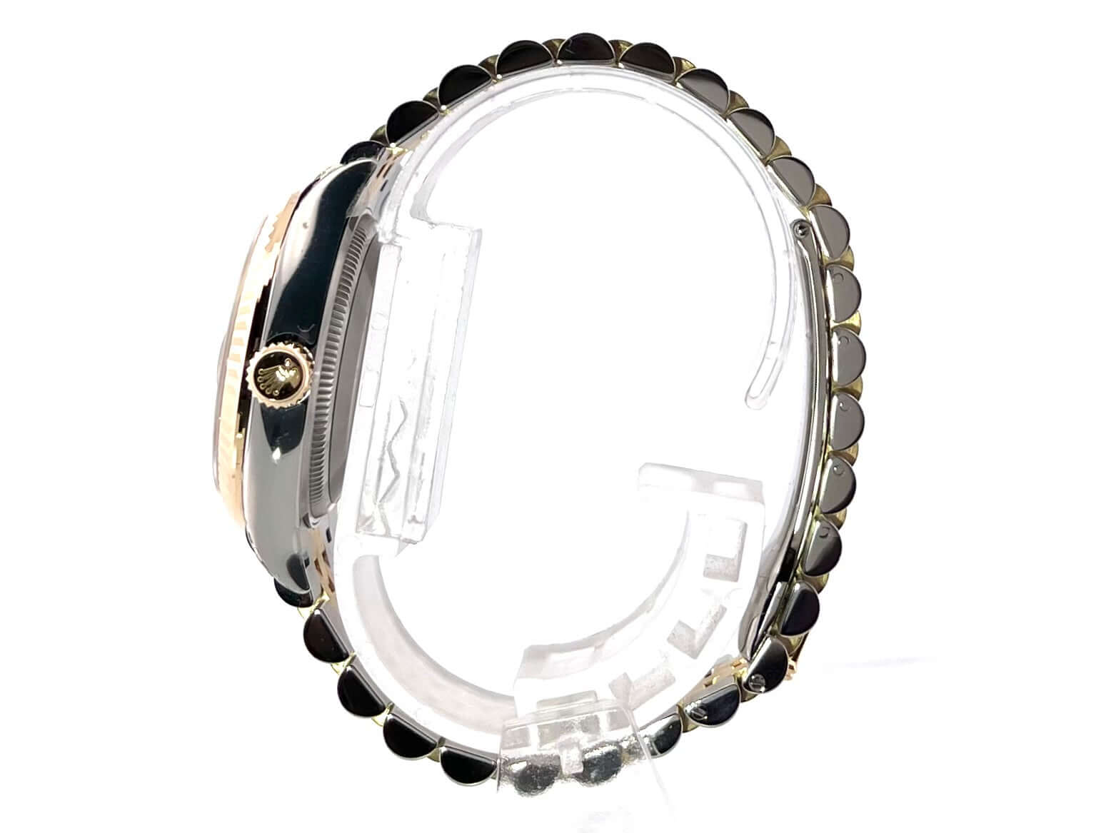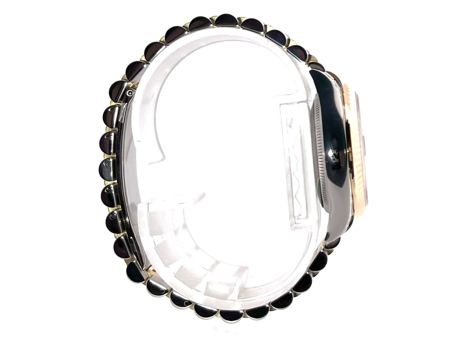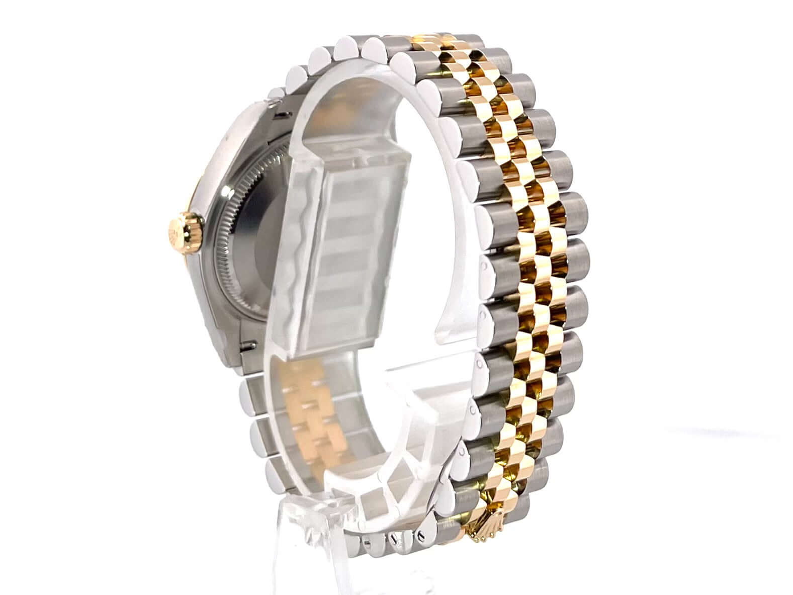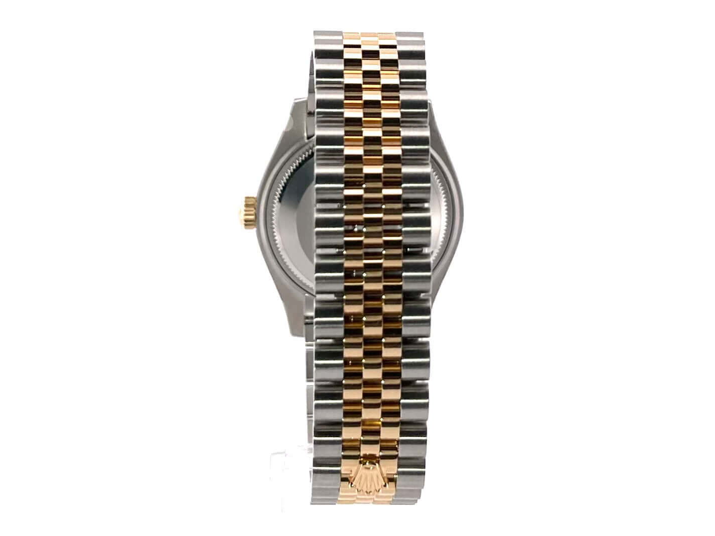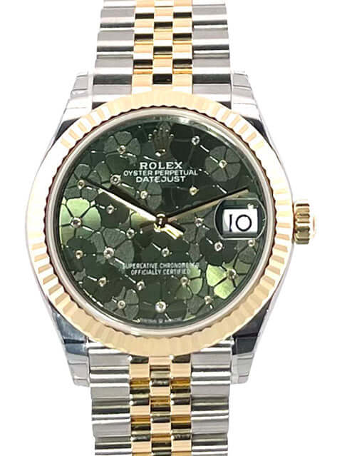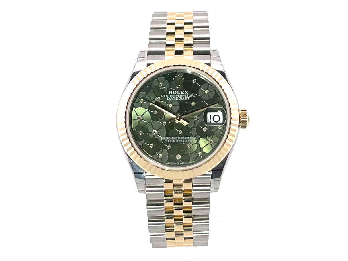 Gehäuse aus Edelstahl poliert und satiniert, Gehäusedurchmesser 31 mm, geriffelte Lünette aus 18 kt Gelbgold, Jubile Edelstahl / 18 kt Gelbgold Armband poliert und satiniert mit Faltschließe, Olivgrünes Floralmuster Zifferblatt mit 24 Diamanten, goldene Zeiger, Automatikwerk, Rolex Manufakturkaliber 2236 mit 31 Steine, 28.800 A/h, 55 Stunden Gangreserve, Datum, Chronometer, kratzfestes Saphirglas, verschraubte Krone aus 18 kt Gelbgold, Edelstahlboden verschraubt, Wasserdicht bis zu 10 bar.