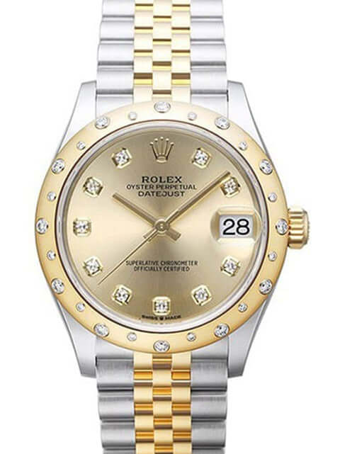 Gehäuse aus Edelstahl poliert und satiniert, Gehäusedurchmesser 31 mm, polierte Lünette aus 18 kt Gelbgold mit Diamanten besetzt, Jubile Edelstahl / 18 kt Gelbgold Armband poliert und satiniert mit Faltschließe, Champagnerfarbenes Zifferblatt mit 10 Diamanten besetzt, goldene Zeiger, Automatikwerk, Rolex Manufakturkaliber 2236 mit 31 Steine, 28.800 A/h, 55 Stunden Gangreserve, Datum, Chronometer, kratzfestes Saphirglas, verschraubte Krone aus 18 kt Gelbgold, Edelstahlboden verschraubt, Wasserdicht bis zu 10 bar.