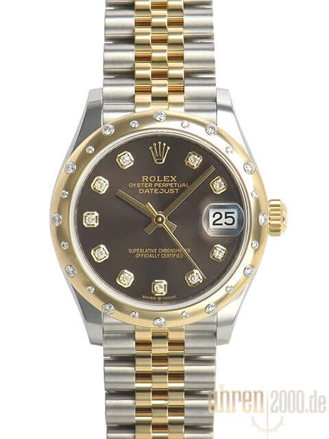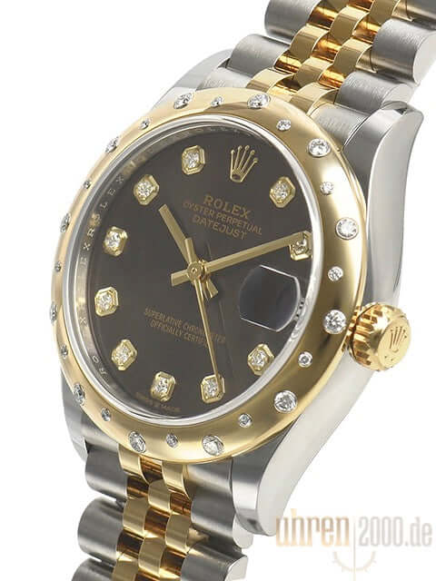 Gehäuse aus Edelstahl poliert und satiniert, Gehäusedurchmesser 31 mm, polierte Lünette aus 18 kt Gelbgold mit Diamanten besetzt, Jubile Edelstahl / 18 kt Gelbgold Armband poliert und satiniert mit Faltschließe, Dunkelgraues Zifferblatt mit 10 Diamanten besetzt, goldene Zeiger, Automatikwerk, Rolex Manufakturkaliber 2236 mit 31 Steine, 28.800 A/h, 55 Stunden Gangreserve, Datum, Chronometer, kratzfestes Saphirglas, verschraubte Krone aus 18 kt Gelbgold, Edelstahlboden verschraubt, Wasserdicht bis zu 10 bar.