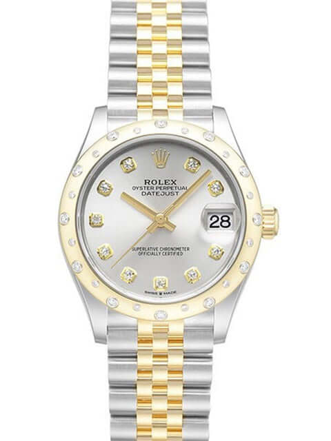 Gehäuse aus Edelstahl poliert und satiniert, Gehäusedurchmesser 31 mm, polierte Lünette aus 18 kt Gelbgold mit Diamanten besetzt, Jubile Edelstahl / 18 kt Gelbgold Armband poliert und satiniert mit Faltschließe, Silberfarbenes Zifferblatt mit 10 Diamanten besetzt, goldene Zeiger, Automatikwerk, Rolex Manufakturkaliber 2236 mit 31 Steine, 28.800 A/h, 55 Stunden Gangreserve, Datum, Chronometer, kratzfestes Saphirglas, verschraubte Krone aus 18 kt Gelbgold, Edelstahlboden verschraubt, Wasserdicht bis zu 10 bar.