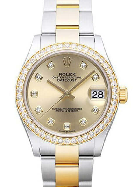 Gehäuse aus Edelstahl poliert und satiniert, Gehäusedurchmesser 31 mm, Lünette aus 18 kt Gelbgold mit Diamanten besetzt, Oyster Edelstahl / 18 kt Gelbgold Armband poliert und satiniert mit Faltschließe, Champagner Zifferblatt mit 10 Diamanten besetzt, goldene Leuchtzeiger, Automatikwerk, Rolex Manufakturkaliber 2236 mit 31 Steine, 28.800 A/h, 55 Stunden Gangreserve, Datum, Chronometer, kratzfestes Saphirglas, verschraubte Krone aus 18 kt Gelbgold, Edelstahlboden verschraubt, Wasserdicht bis zu 10 bar.