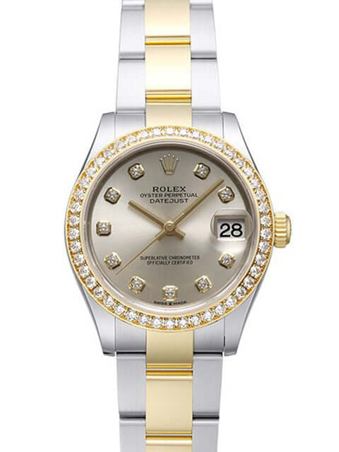 Gehäuse aus Edelstahl poliert und satiniert, Gehäusedurchmesser 31 mm, Lünette aus 18 kt Gelbgold mit Diamanten besetzt, Oyster Edelstahl / 18 kt Gelbgold Armband poliert und satiniert mit Faltschließe, silberfarbenes Zifferblatt mit 10 Diamanten besetzt, goldene Leuchtzeiger, Automatikwerk, Rolex Manufakturkaliber 2236 mit 31 Steine, 28.800 A/h, 55 Stunden Gangreserve, Datum, Chronometer, kratzfestes Saphirglas, verschraubte Krone aus 18 kt Gelbgold, Edelstahlboden verschraubt, Wasserdicht bis zu 10 bar.