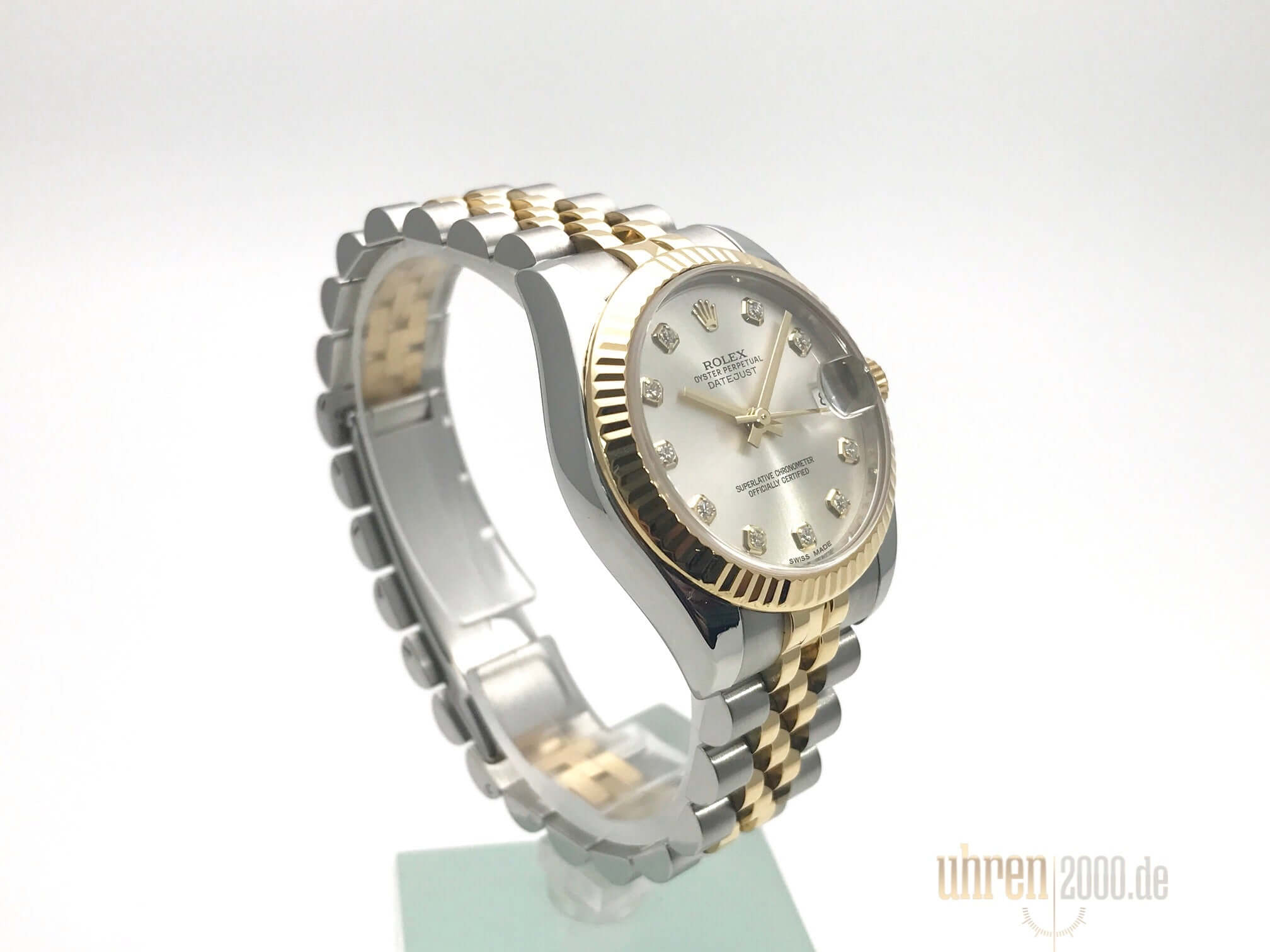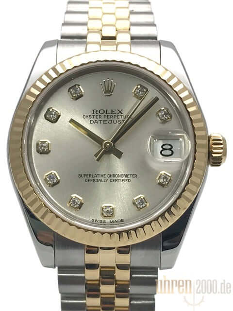 Gehäuse aus Edelstahl poliert und satiniert, Gehäusedurchmesser 31 mm, geriffelte Lünette aus 18 kt Gelbgold, Jubile Edelstahl / 18 kt Gelbgold Armband poliert und satiniert mit Faltschließe, silberfarbenes Diamantzifferblatt, Automatikwerk, Rolex Manufakturkaliber 2235 mit 31 Steine, 28.800 A/h, Datumsanzeige, Chronometer, kratzfestes Saphirglas, verschraubte Krone aus 18 kt Gelbgold, Edelstahlboden verschraubt, Wasserdicht bis zu 10 bar.