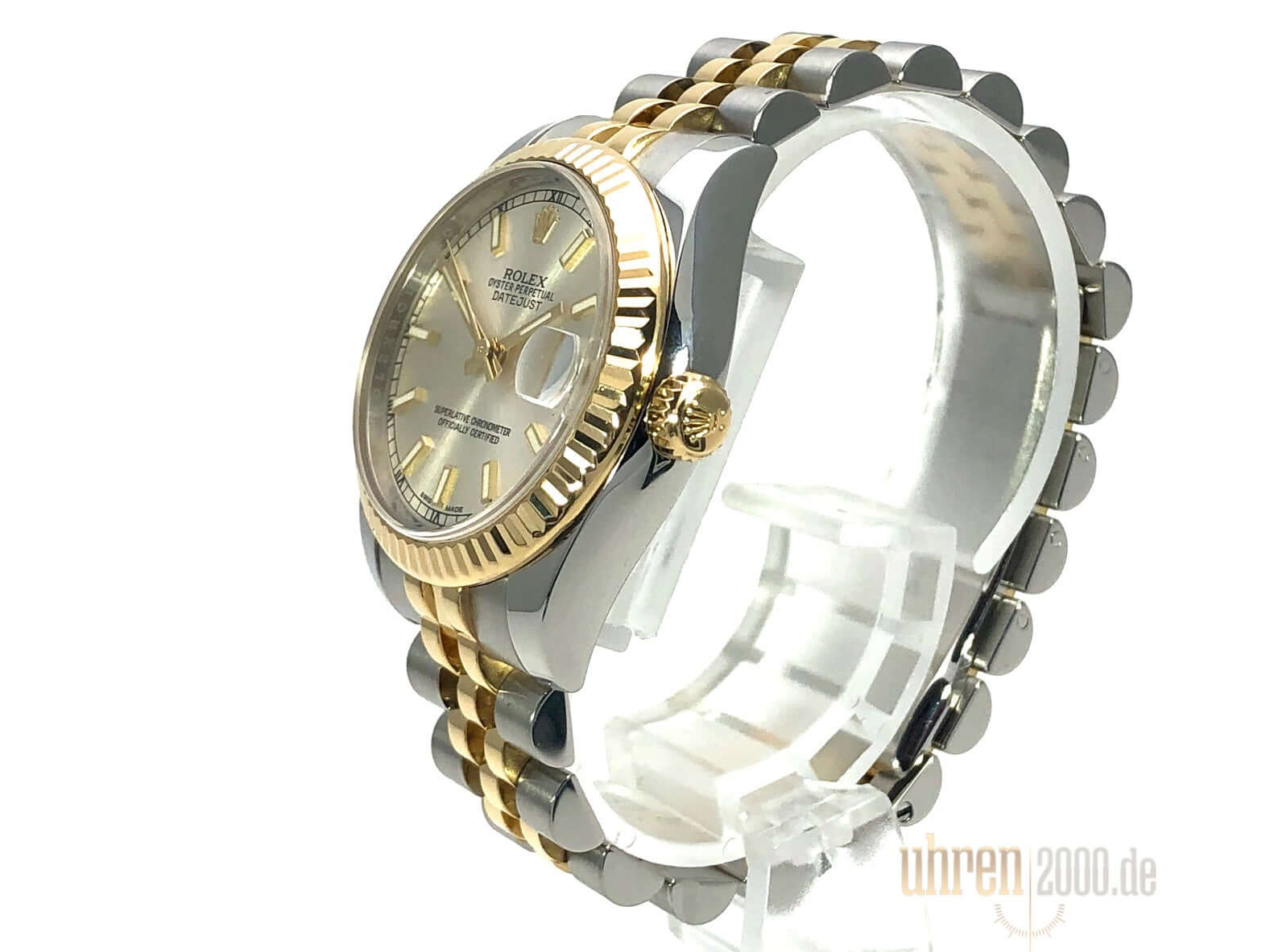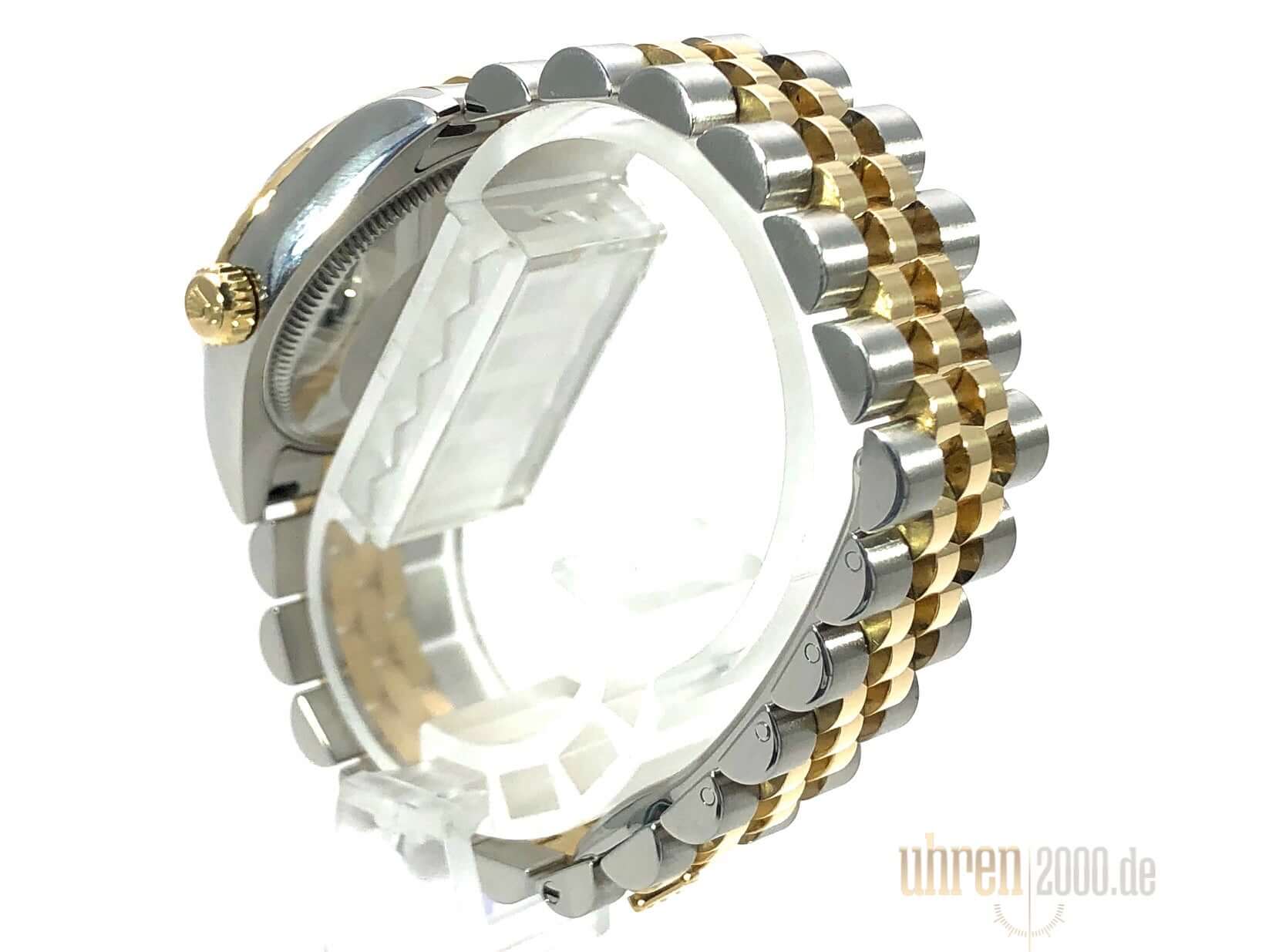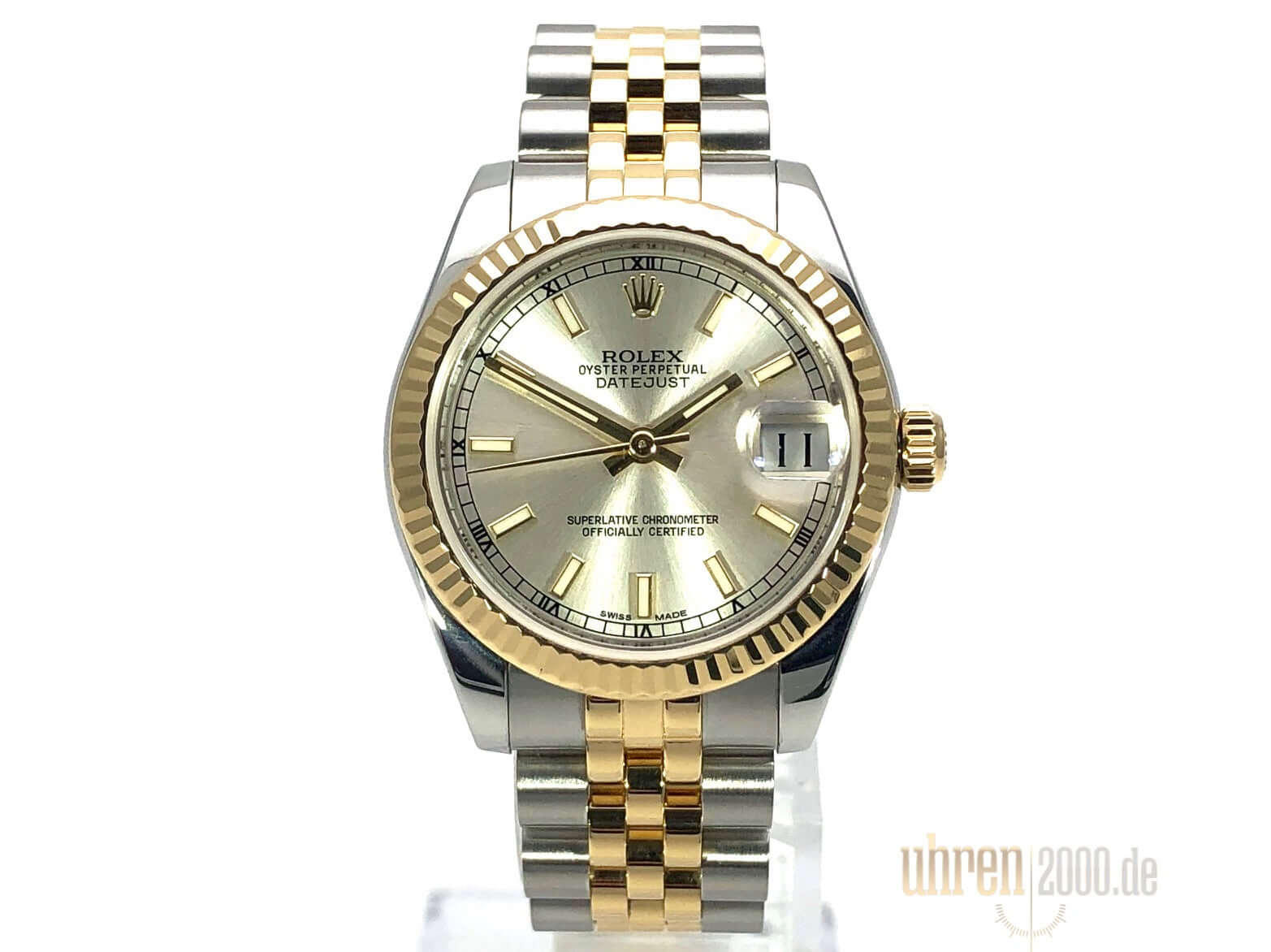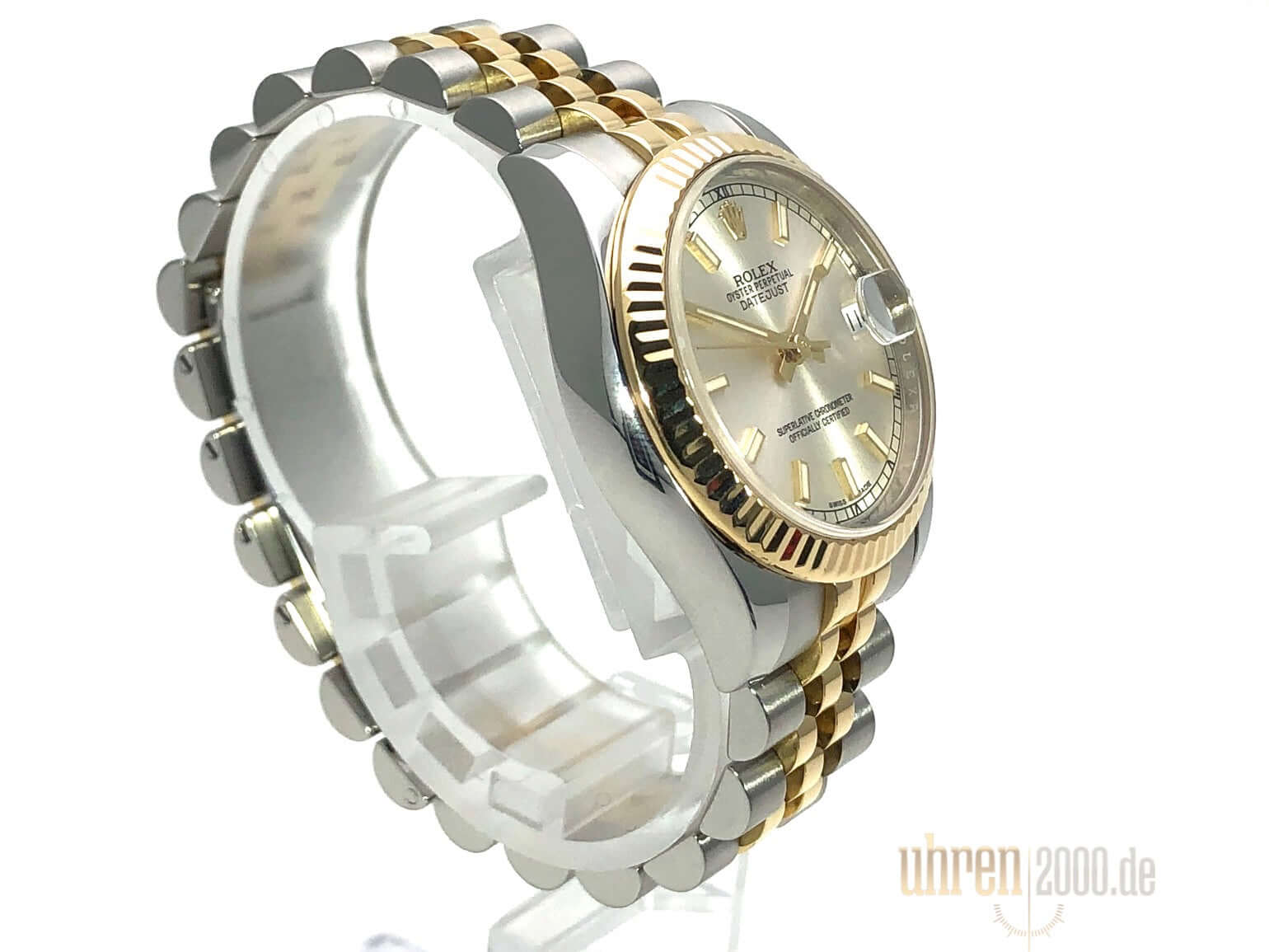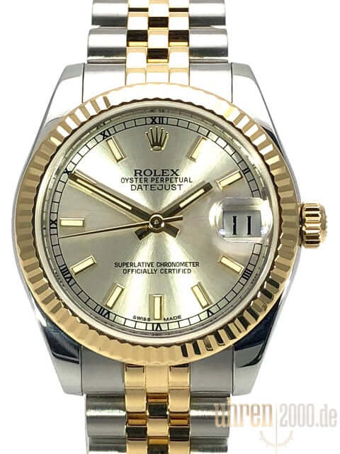 Gehäuse aus Edelstahl poliert und satiniert, Gehäusedurchmesser 31 mm, geriffelte Lünette aus 18 kt Gelbgold, Jubile Edelstahl / 18 kt Gelbgold Armband poliert und satiniert mit Faltschließe, Silberfarbenes Zifferblatt mit aufgesetzten Indizes, goldene Leuchtzeiger, Automatikwerk, Rolex Manufakturkaliber 2235 mit 31 Steine, 28.800 A/h, Datumsanzeige, Chronometer, kratzfestes Saphirglas, verschraubte Krone aus 18 kt Gelbgold, Edelstahlboden verschraubt, Wasserdicht bis zu 10 bar.