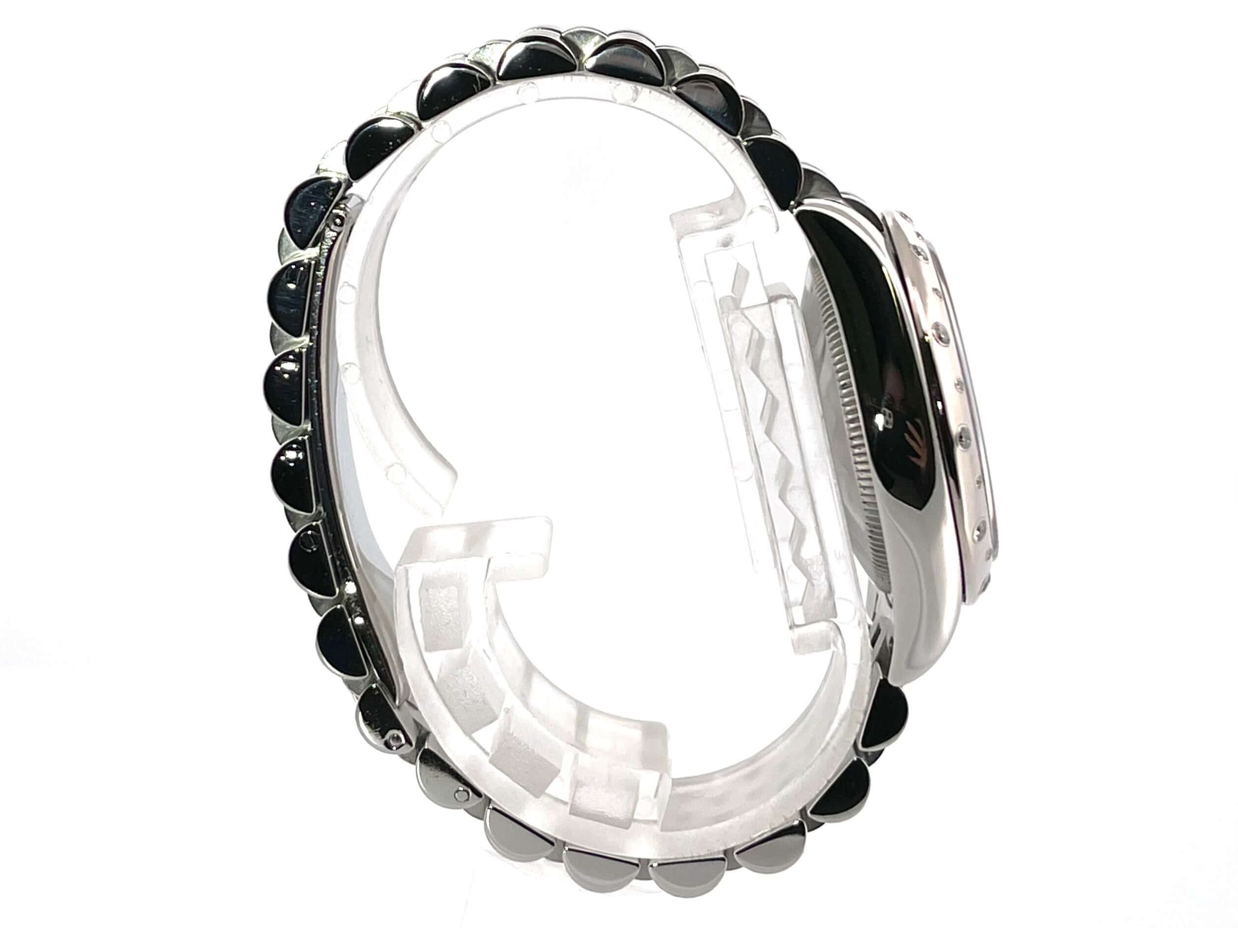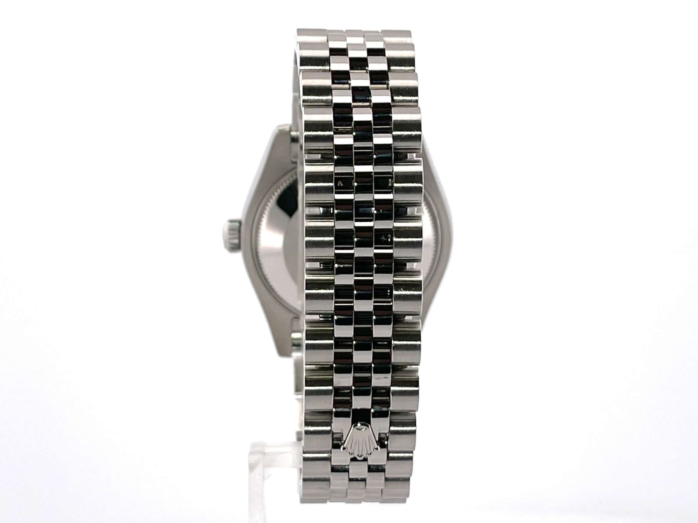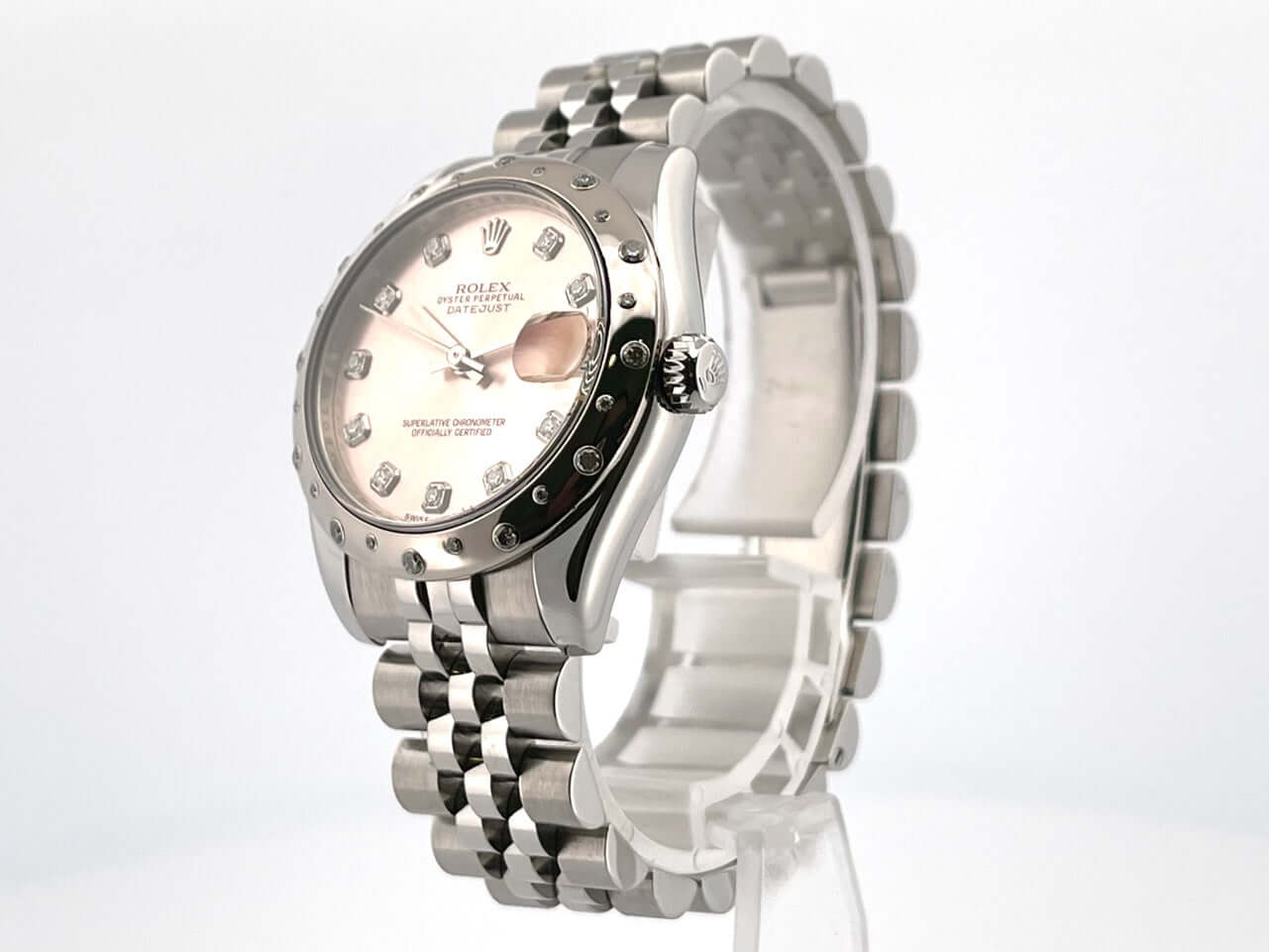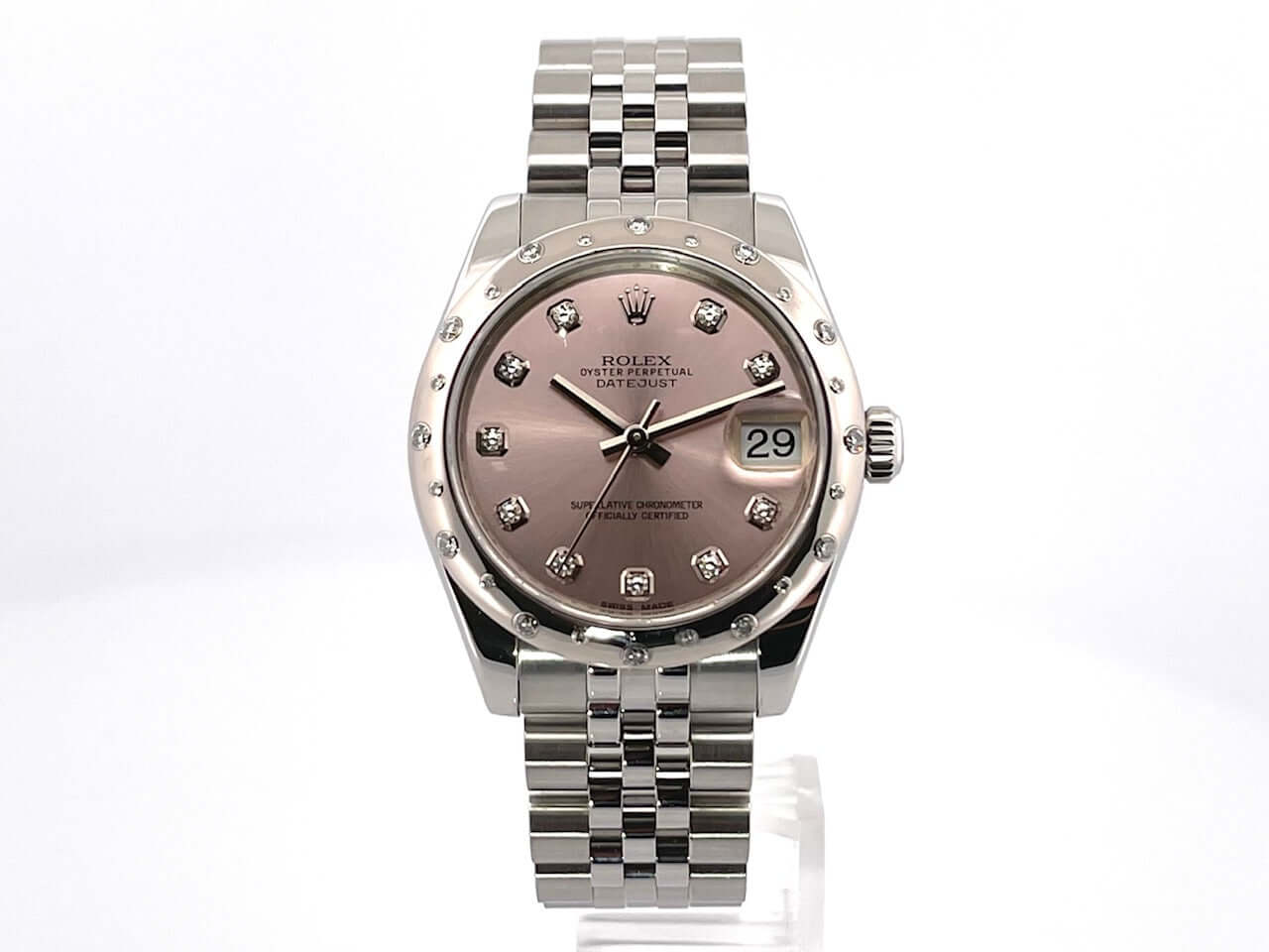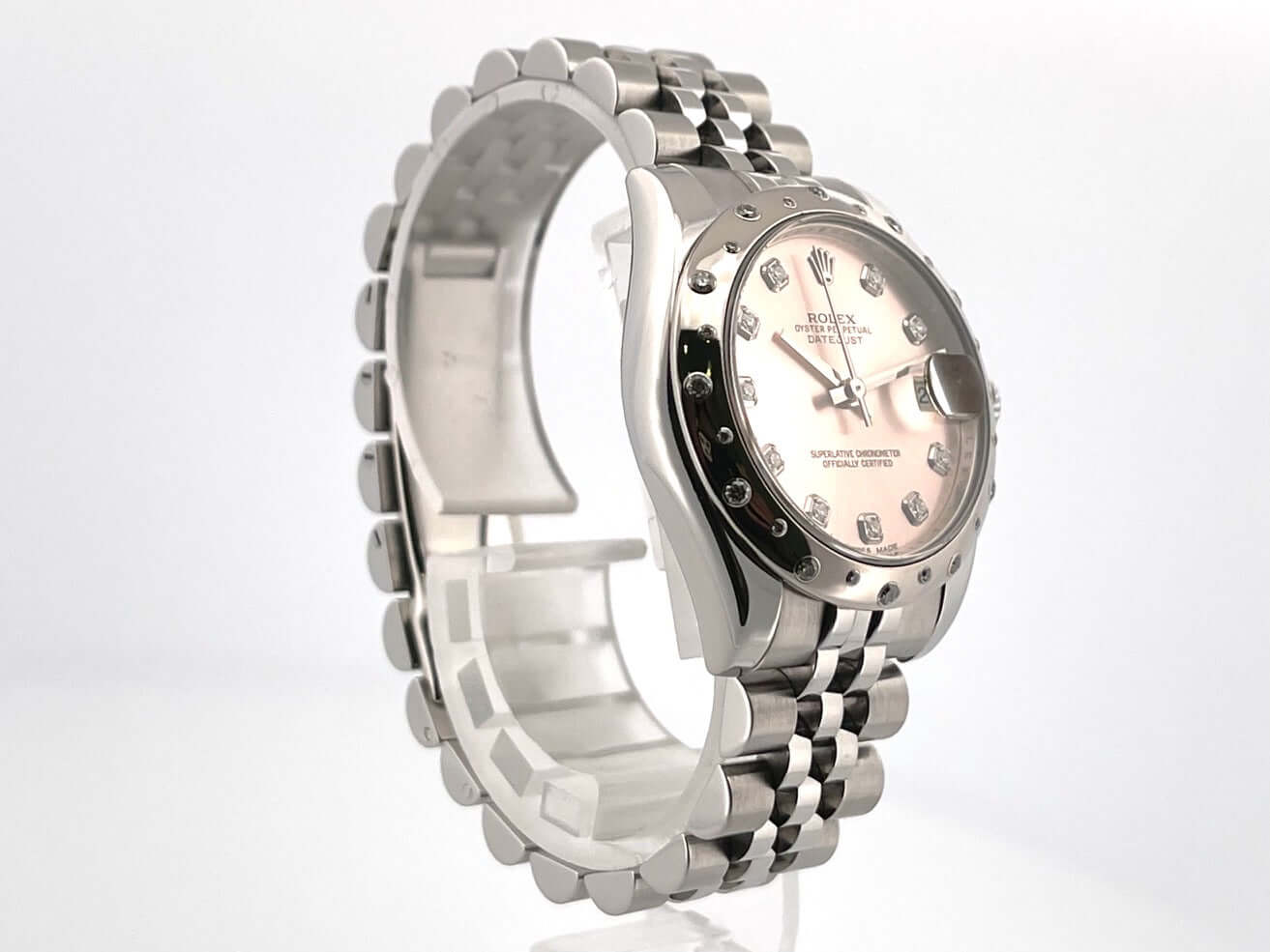 Gehäuse aus Edelstahl poliert und satiniert, Gehäusedurchmesser 31 mm, Lünette aus 18 kt Weißgold mit 24 Diamanten besetzt, Jubile Edelstahl Armband poliert und satiniert mit Faltschließe, pinkfarbenes Diamant Zifferblatt, Automatik, Rolex Manufakturkaliber 2235, Chronometer, Datum, Saphirglas, verschraubte Krone, Edelstahlboden verschraubt, Wasserdicht bis 10 bar.