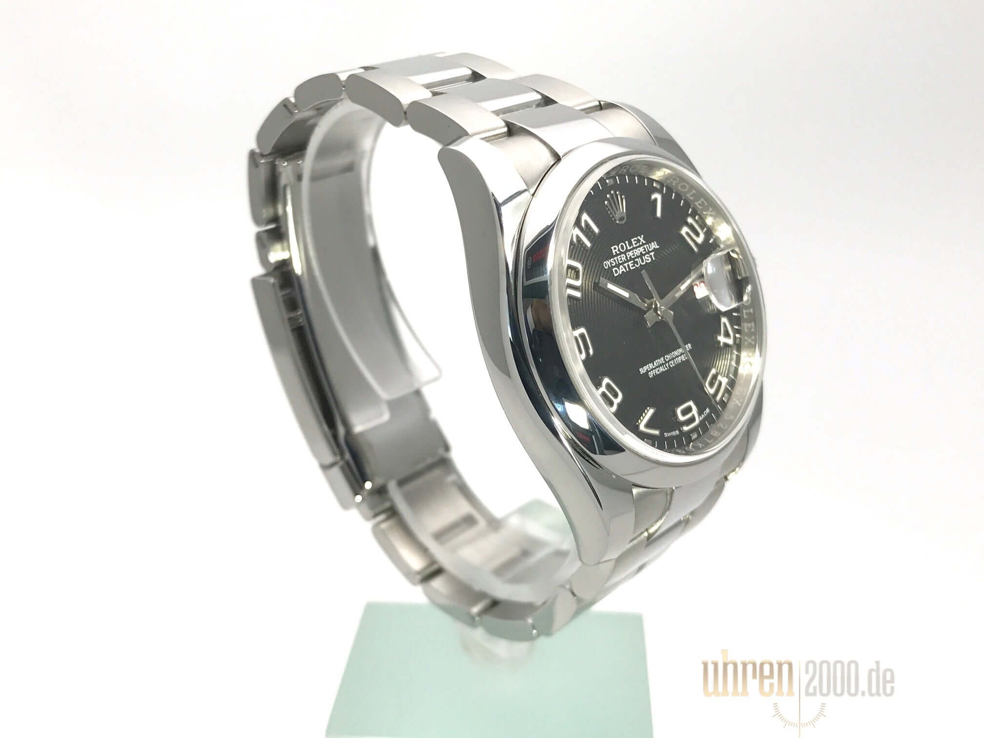 Gehäuse aus Edelstahl poliert und satiniert, Gehäusedurchmesser 36 mm, Oyster Edelstahlband mit Faltschließe, schwarzes Zifferblatt mit aufgesetzten arabischen Ziffern, Leuchtzeiger, Automatik Uhrwerk, Rolex Manufakturkaliber 3135, Datumsanzeige, Saphirglas, Krone verschraubbar, Edelstahlboden verschraubt, Wasserdicht bis 10 bar.
