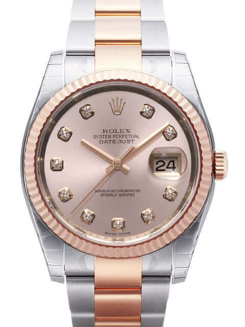 Gehäuse aus Edelstahl poliert und satiniert, Gehäusedurchmesser 36mm, geriffelte Lünette aus 18 kt Roségold Everose, Oyster Armband in Edelstahl / 18 kt Roségold Everose poliert und satiniert mit Faltschließe, pinkfarbenes Zifferblatt mit 10 aufgesetzten Diamanten, roségoldene Zeiger, roségoldene Zeiger, Automatikwerk, Chronometer mit C.O.S.C. Zertifizierung, Rolex Manufakturkaliber 3135 mit 31 Steine, 28.800 A/h, Datumsanzeige, kratzfestes Saphirglas, verschraubbare Krone 18 kt Roségold Everose, Edelstahlboden verschraubt, Wasserdicht bis zu 10 bar.