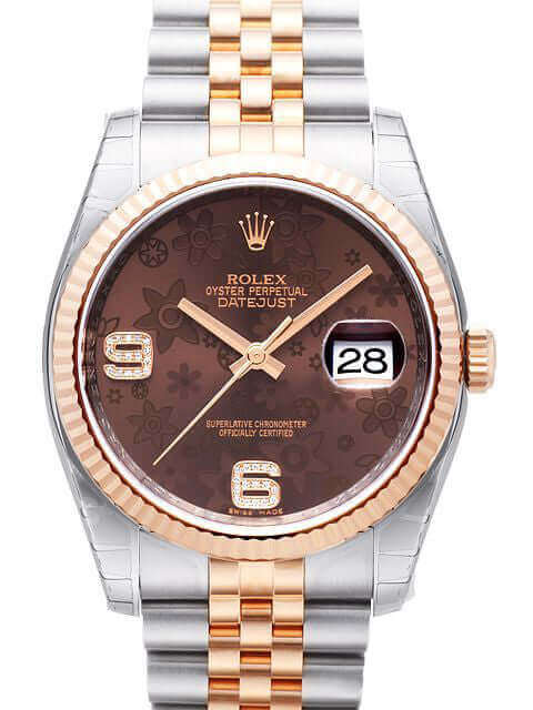 Gehäuse aus Edelstahl poliert und satiniert, Gehäusedurchmesser 36 mm, geriffelte 18 kt Roségold Everose Lünette, Jubilé Edelstahl / 18 kt Roségold Everose Armband poliert und satiniert mit Faltschließe, Zifferblatt Schoko Floral mit 32 aufgesetzten Diamanten bei 6 und 9, roségoldene Zeiger, Automatikwerk, Chronometer mit C.O.S.C. Zertifizierung, Rolex Manufakturkaliber 3135 mit 31 Steine, 28.800 A/h, Datumsanzeige, kratzfestes Saphirglas, verschraubte 18 kt Roségold Everose Krone, Edelstahloden verschraubt, Wasserdicht bis zu 10 bar.