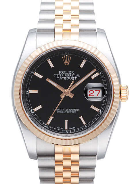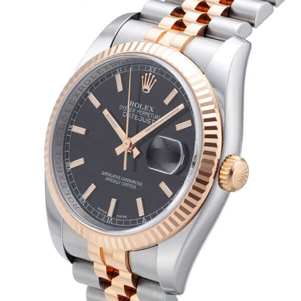 Gehäuse Edelstahl poliert und satiniert, Gehäusedurchmesser 36 mm, geriffelte Lünette 18 kt Roségold Everose, Jubilé Armband in Edelstahl / 18 kt Roségold Everose poliert und satiniert mit Faltschließe, schwarzes Zifferblatt mit aufgesetzten roségoldenen Indexen, roségoldene Zeiger, Automatikwerk, Chronometer mit C.O.S.C. Zertifizierung, Rolex Manufakturkaliber 3135 mit 31 Steine, 28.800 A/h, Datumsanzeige, kratzfestes Saphirglas, verschraubbare Krone 18 kt Roségold Everose, Edelstahlboden verschraubt, Wasserdicht bis zu 10 bar.