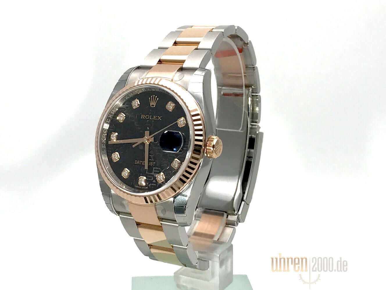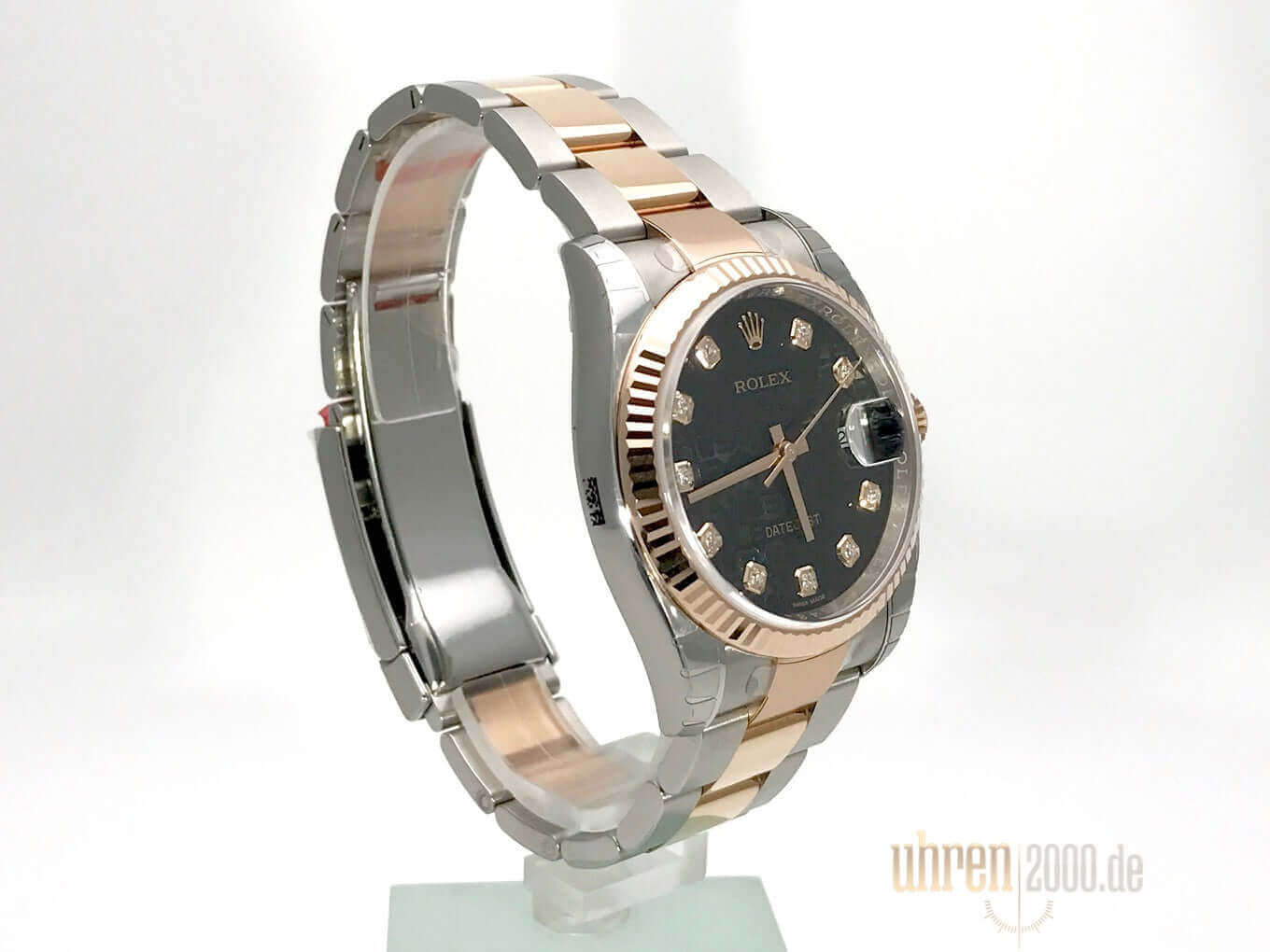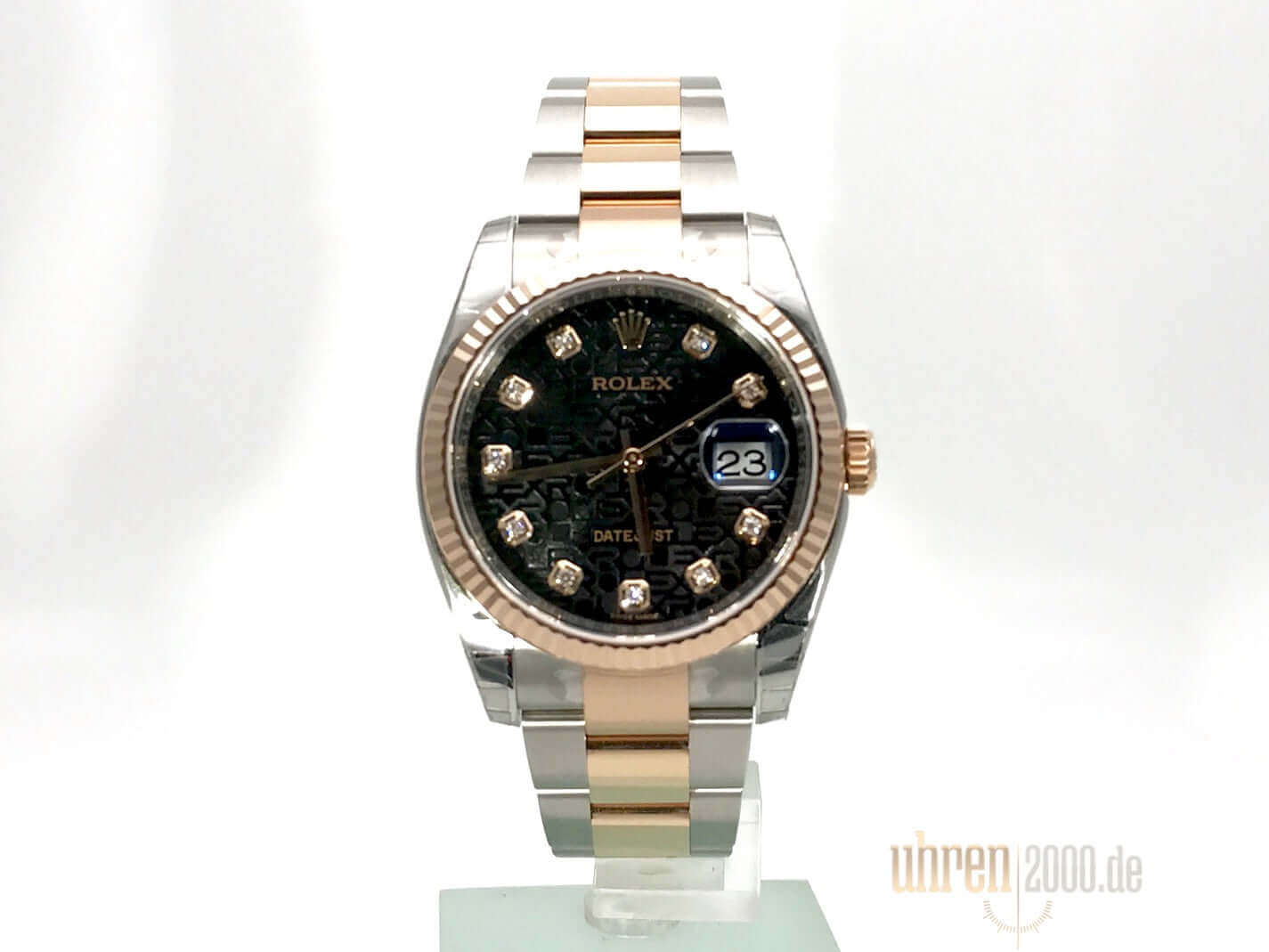 Gehäuse aus Edelstahl poliert und satiniert, Gehäusedurchmesser 36 mm, geriffelte Lünette aus 18 kt Roségold Everose, Oyster Armband in Edelstahl / 18 kt Roségold Everose poliert und satiniert mit Faltschließe, schwarzes Jubilé Zifferblatt mit 10 aufgesetzten Diamanten, roségoldene Zeiger, roségoldene Zeiger, Automatikwerk, Chronometer mit C.O.S.C. Zertifizierung, Rolex Manufakturkaliber 3135 mit 31 Steine, 28.800 A/h, Datumsanzeige, kratzfestes Saphirglas, verschraubbare Krone 18 kt Roségold Everose, Edelstahlboden verschraubt, Wasserdicht bis zu 10 bar.