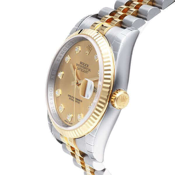 Gehäuse Edelstahl poliert und satiniert, Gehäusedurchmesser 36 mm, Gehäusehöhe 11,4 mm, 18 kt Gelbgold Lünette geriffelt, Jubilé Edelstahl / 18 kt Gelbgold Armband poliert und satiniert mit Faltschließe, Zifferblatt champagnerfarben mit 10 aufgesetzten Diamanten, goldene Zeiger, Automatikwerk, Chronometer mit C.O.S.C. Zertifikat, Rolex Manufakturkaliber 3135 mit 31 Steine, Schwingung 28.800 A/h, Datumsanzeige, kratzfestes Saphirglas, verschraubte Krone aus 18 kt Gelbgold, verschraubter Edelstahlboden, Wasserdicht bis 10 bar.