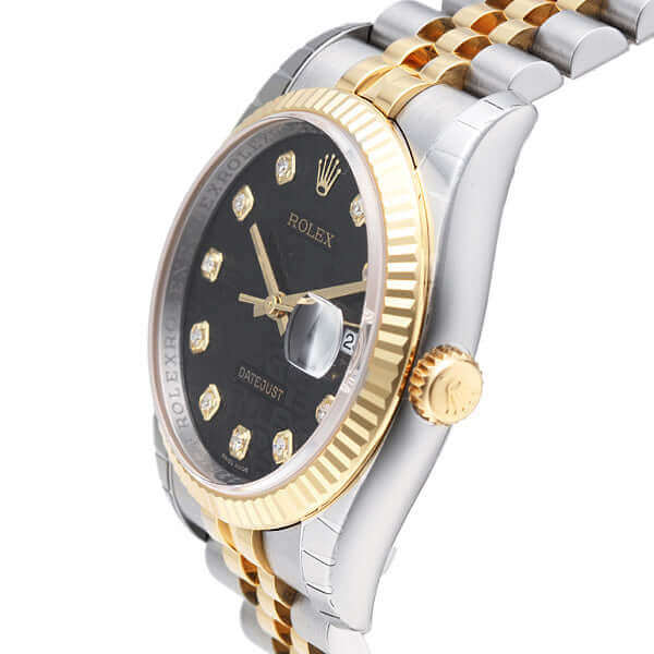 Gehäuse aus Edelstahl poliert und satiniert, Gehäusedurchmesser 36 mm, Gehäusehöhe 11,4 mm, Lünette aus 18 kt Gelbgold geriffelt, Jubilé Armband Edelstahl / 18 kt Gelbgold poliert und satiniert mit Faltschließe, schwarzes Jubilé Zifferblatt mit 10 aufgesetzten Diamanten, goldene Zeiger, Automatikwerk, Chronometer, Rolex Manufakturkaliber 3135 mit 31 Steine, Schwingung 28.800 A/h, Datumsanzeige, kratzfestes Saphirglas, Krone aus 18 kt Gelbgold verschraubbar, verschraubter Edelstahlboden, Wasserdicht bis 10 bar.