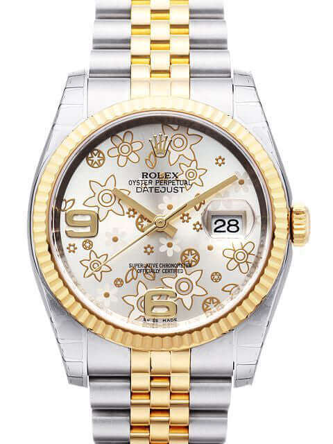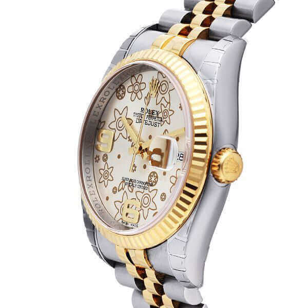 Gehäuse aus Edelstahl poliert und satiniert, Gehäusedurchmesser 36 mm, Gehäusehöhe 11,4 mm, 18 kt Gelbgold Lünette geriffelt, Jubilé Edelstahl / 18 kt Gelbgold Armband poliert und satiniert mit Faltschließe, Zifferblatt Silberfarben mit Floral Dekor, goldene Zeiger, Automatikwerk, Chronometer mit C.O.S.C. Zertifikat, Rolex Manufakturkaliber 3135 mit 31 Steine, Schwingung 28.800 A/h, Datumsanzeige, kratzfestes Saphirglas, Krone aus 18 kt Gelbgold verschraubbar, verschraubter Edelstahlboden, Wasserdicht bis 10 bar.