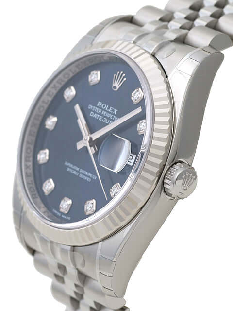 Gehäuse aus Edelstahl poliert und satiniert, Gehäusedurchmesser 36 mm, Gehäusehöhe 11,7 mm, Lünette aus 18 kt Weißgold geriffelt, Jubilé Edelstahl Armband poliert und satiniert mit Faltschließe, blaues Zifferblatt mit 10 aufgesetzten Diamanten, Uhrwerk Automatik, COSC Chronometer mit Zeugnis, Rolex Manufakturkaliber 3135 mit 31 Steine, 28.800 A/h, Datumsanzeige, Saphirglas kratzfest, Krone verschraubbar, Edelstahlboden verschraubt, Wasserdicht bis zu 10 bar.