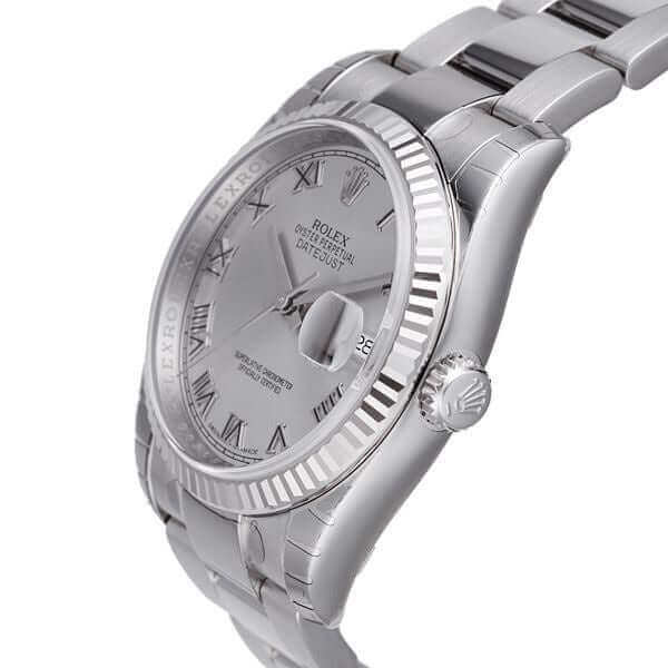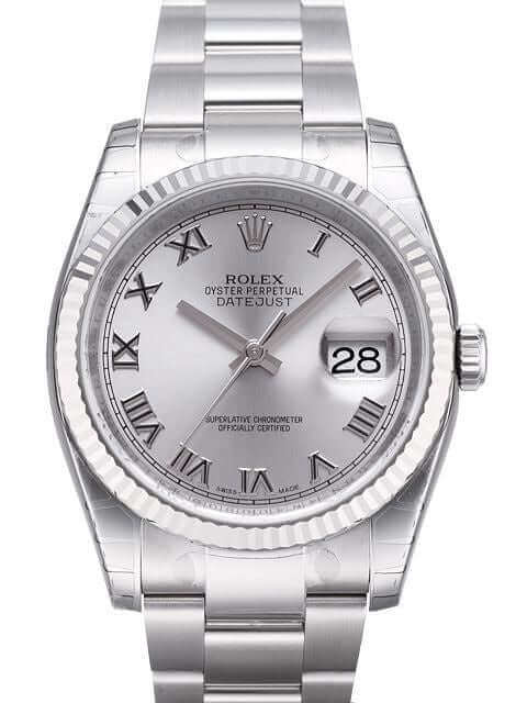 Gehäuse aus Edelstahl poliert und satiniert, Gehäusedurchmesser 36 mm, Gehäusehöhe 11,7 mm, 18 kt Weißgold Lünette geriffelt, Oyster Edelstahl Armband poliert und satiniert mit Sicherheitsfaltschließe, Zifferblatt Rhodium mit aufgesetzten römischen Ziffern, Uhrwerk Automatik, COSC Chronometer mit Zeugnis, Rolex Manufakturkaliber 3135 mit 31 Steine, 28.800 A/h, Datumsanzeige, Saphirglas kratzfest, Krone verschraubt, Edelstahlboden verschraubt, Wasserdicht bis zu 10 bar.