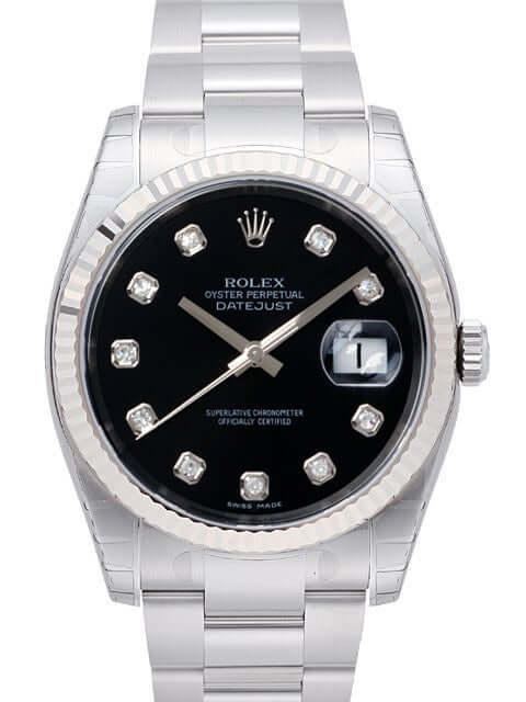 Gehäuse aus Edelstahl poliert und satiniert, Gehäusedurchmesser 36 mm, Gehäusehöhe 11,7 mm, Lünette aus 18kt Weißgold geriffelt, Oyster Edelstahl Armband poliert und satiniert mit Faltschließe, schwarzes Zifferblatt mit 10 aufgesetzten Diamanten, Uhrwerk Automatik, COSC Chronometer mit Zeugnis, Rolex Manufakturkaliber 3135 mit 31 Steine, 28.800 A/h, Datumsanzeige, Saphirglas kratzfest, Krone verschraubbar, Edelstahlboden verschraubt, Wasserdicht bis zu 10 bar.