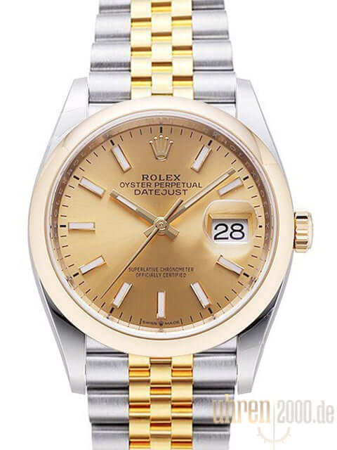 Gehäuse aus Edelstahl / Gelbgold poliert und satiniert, Gehäusedurchmesser 36 mm, polierte 18 kt Gelbgold Lünette, Jubilé Armband aus Edelstahl / 18 kt Gelbgold poliert und satiniert mit Faltschließe, Champagnerfarbenes Zifferblatt mit aufgesetzten goldenen Indizes, Gelbgold Zeiger, Automatikwerk, Rolex Manufakturkaliber 3235 mit 31 Steine, 28.800 A/h, 70 Stunden Gangreserve, Datumsanzeige, Chronometer, kratzfestes Saphirglas, verschraubte 18 kt Gelbgold Krone, Edelstahlboden verschraubt, Wasserdicht bis zu 10 bar.