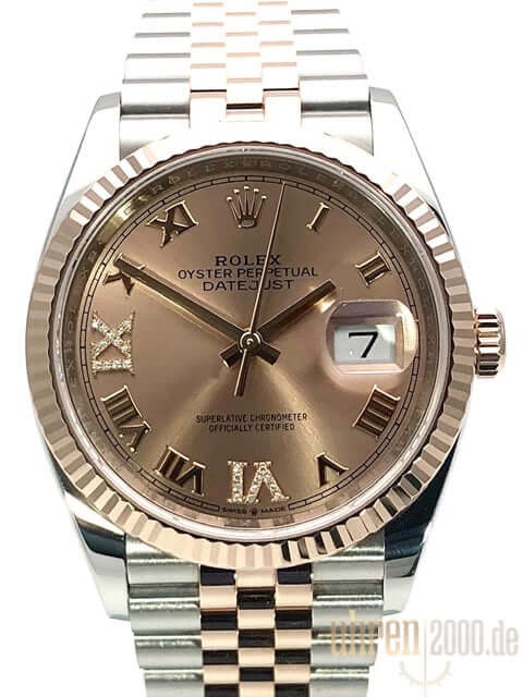 Gehäuse aus Edelstahl / Everose-Gold poliert und satiniert, Gehäusedurchmesser 36 mm, geriffelte 18 kt Everose-Gold Lünette, Jubile Armband aus Edelstahl / 18 kt Everose-Gold poliert und satiniert mit Faltschließe, Roséfarbenes Diamantzifferblatt mit römischen Ziffern, Automatikwerk, Rolex Manufakturkaliber 3235 mit 31 Steine, 28.800 A/h, 70 Stunden Gangreserve, Datumsanzeige, Chronometer, kratzfestes Saphirglas, verschraubte 18 kt Everose-Gold Krone, Edelstahlboden verschraubt, Wasserdicht bis zu 10 bar.