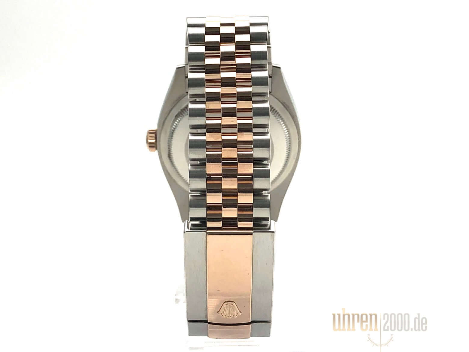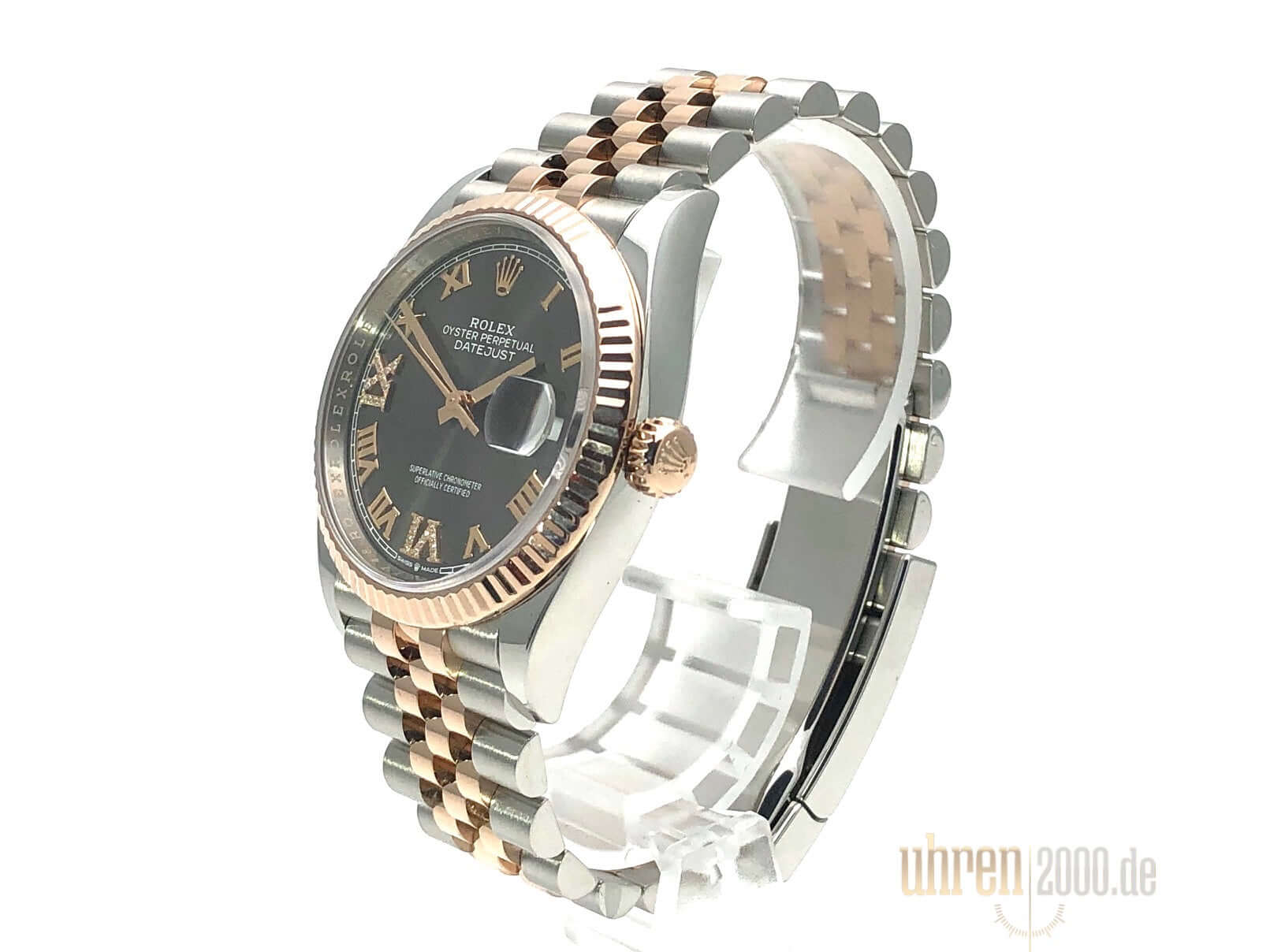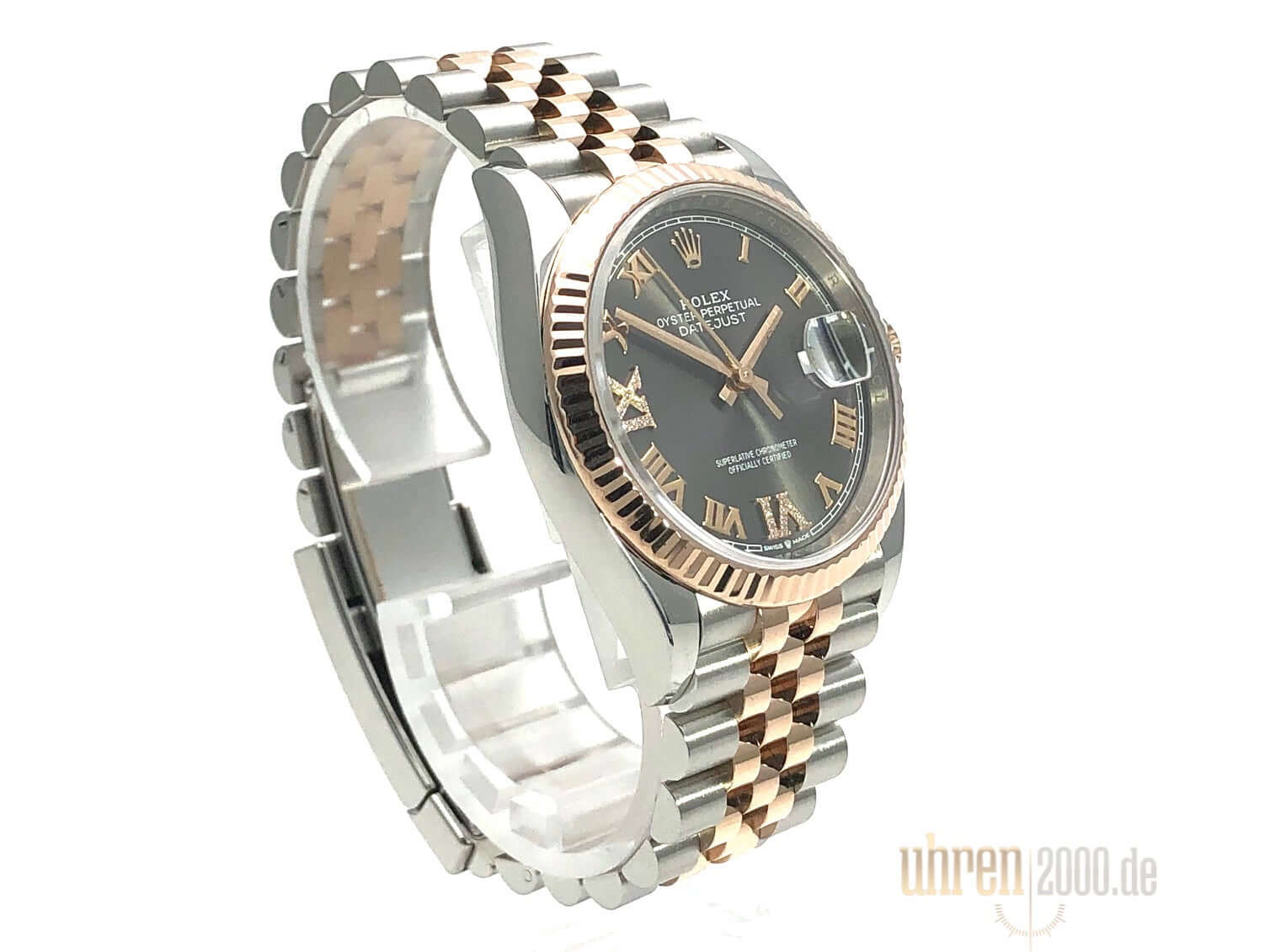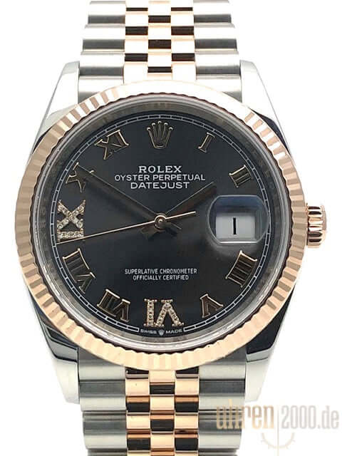Gehäuse aus Edelstahl / Everose-Gold poliert und satiniert, Gehäusedurchmesser 36 mm, geriffelte 18 kt Everose-Gold Lünette, dunkles Rhodium Diamantzifferblatt mit römischen Ziffern, Jubile Armband aus Edelstahl / 18 kt Everose-Gold poliert und satiniert mit Faltschließe, Automatikwerk, Rolex Manufakturkaliber 3235 mit 31 Steine, 28.800 A/h, 70 Stunden Gangreserve, Datumsanzeige, Chronometer, verschraubte 18 kt Everose-Gold Krone, kratzfestes Saphirglas, Edelstahlboden verschraubt, Wasserdicht bis zu 10 bar.
