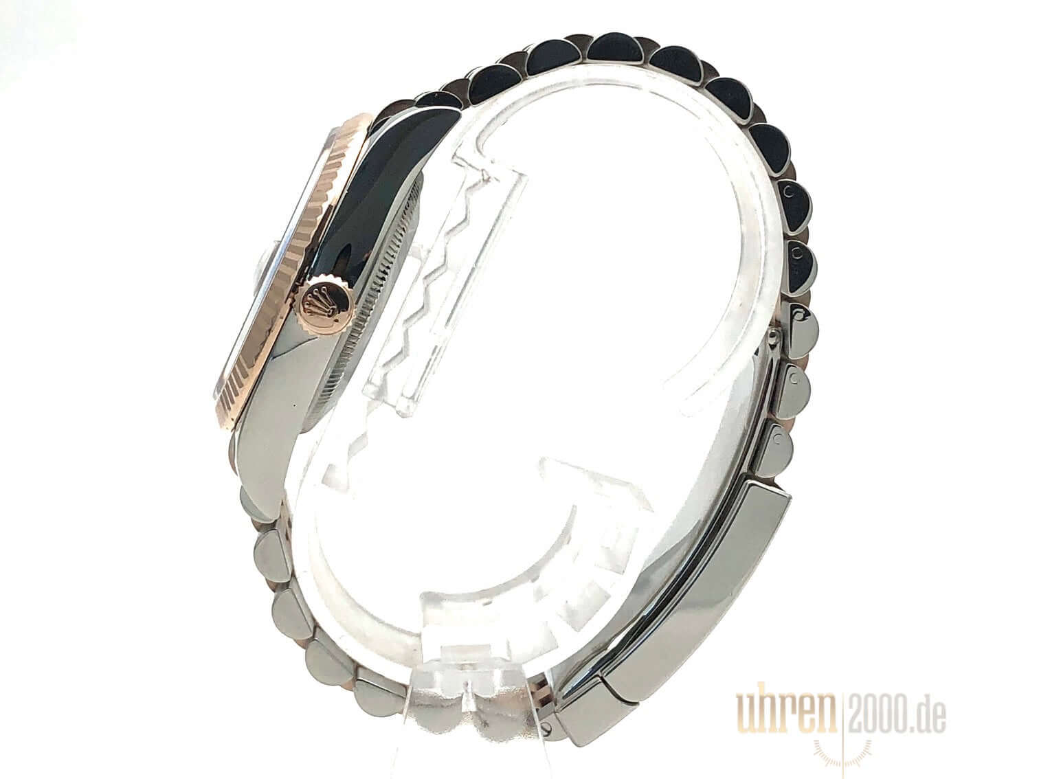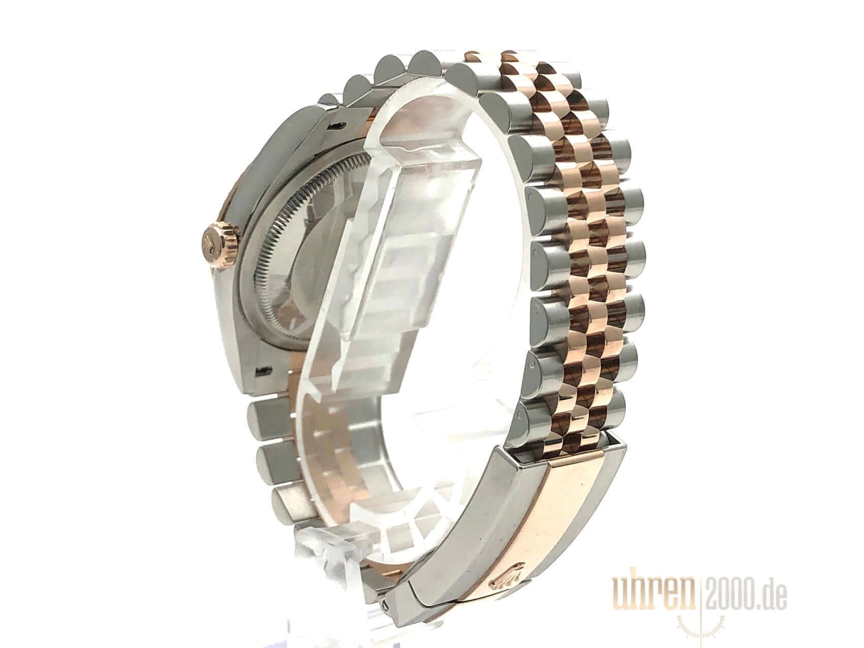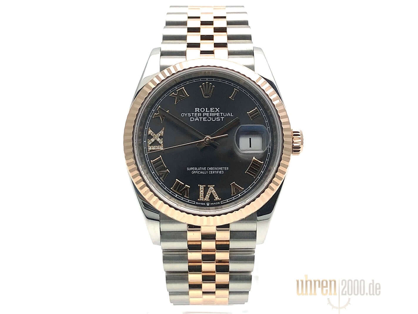 Gehäuse aus Edelstahl / Everose-Gold poliert und satiniert, Gehäusedurchmesser 36 mm, geriffelte 18 kt Everose-Gold Lünette, dunkles Rhodium Diamantzifferblatt mit römischen Ziffern, Jubile Armband aus Edelstahl / 18 kt Everose-Gold poliert und satiniert mit Faltschließe, Automatikwerk, Rolex Manufakturkaliber 3235 mit 31 Steine, 28.800 A/h, 70 Stunden Gangreserve, Datumsanzeige, Chronometer, verschraubte 18 kt Everose-Gold Krone, kratzfestes Saphirglas, Edelstahlboden verschraubt, Wasserdicht bis zu 10 bar.