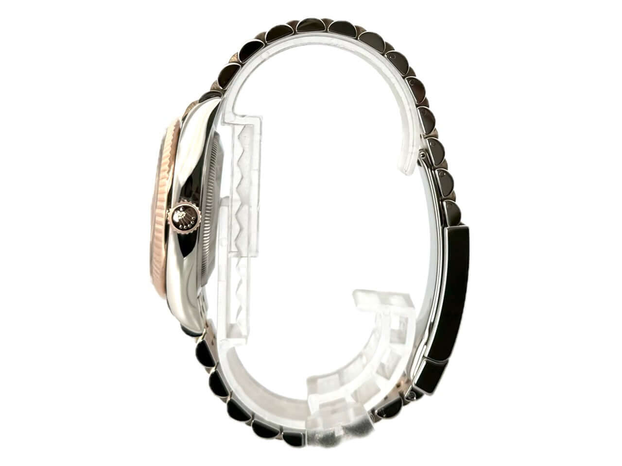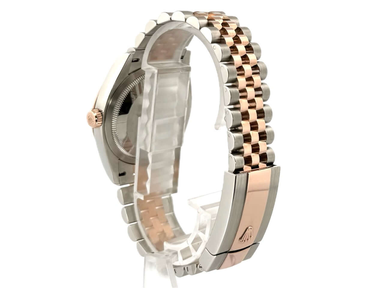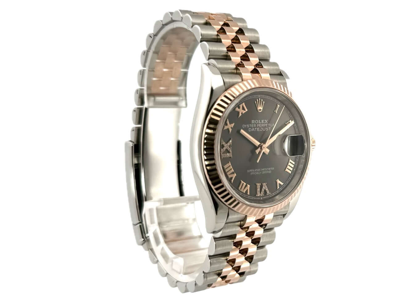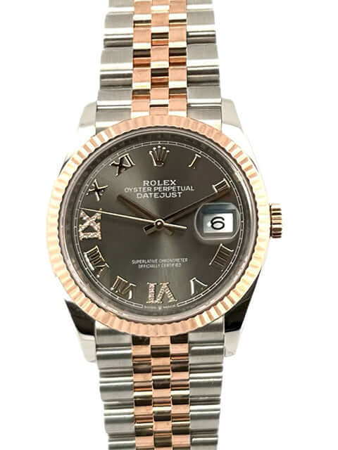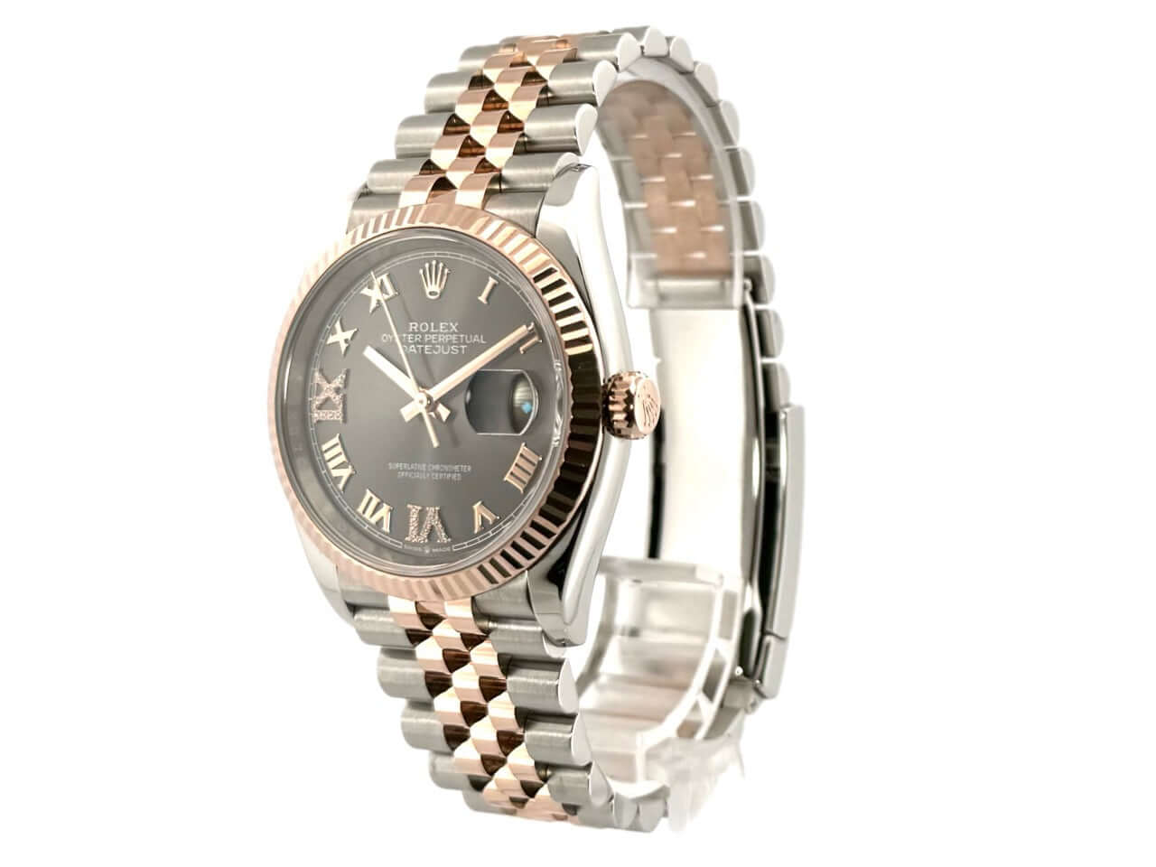 Gehäuse aus Edelstahl / Everose-Gold poliert und satiniert, Gehäusedurchmesser 36 mm, geriffelte 18 kt Everose-Gold Lünette, Jubile Armband aus Edelstahl / 18 kt Everose-Gold poliert und satiniert mit Faltschließe, dunkles Rhodium Diamantzifferblatt mit römischen Ziffern, Automatikwerk, Rolex Manufakturkaliber 3235 mit 31 Steine, 28.800 A/h, 70 Stunden Gangreserve, Datumsanzeige, Chronometer, kratzfestes Saphirglas, verschraubte 18 kt Everose-Gold Krone, Edelstahlboden verschraubt, Wasserdicht bis zu 10 bar.
