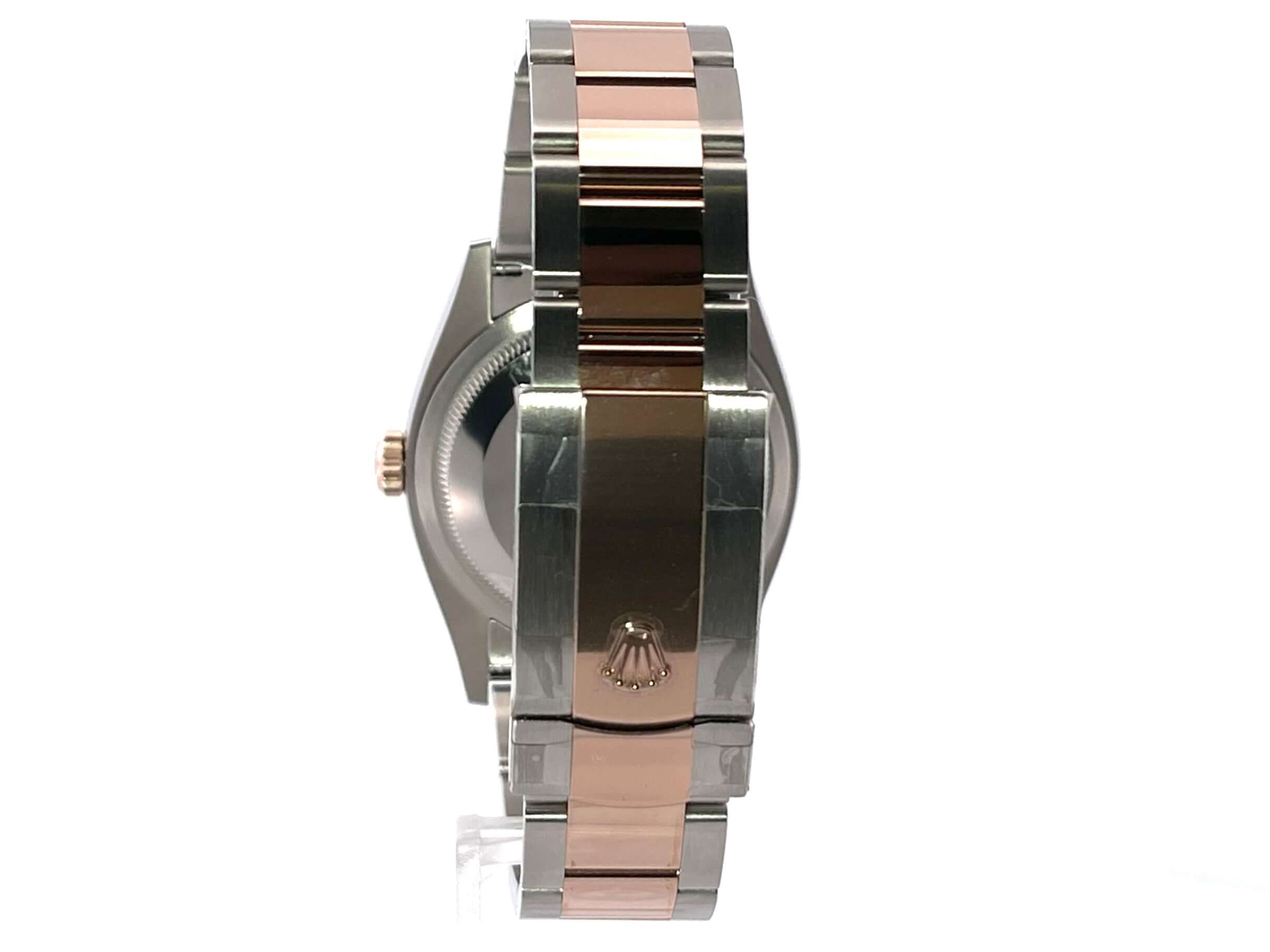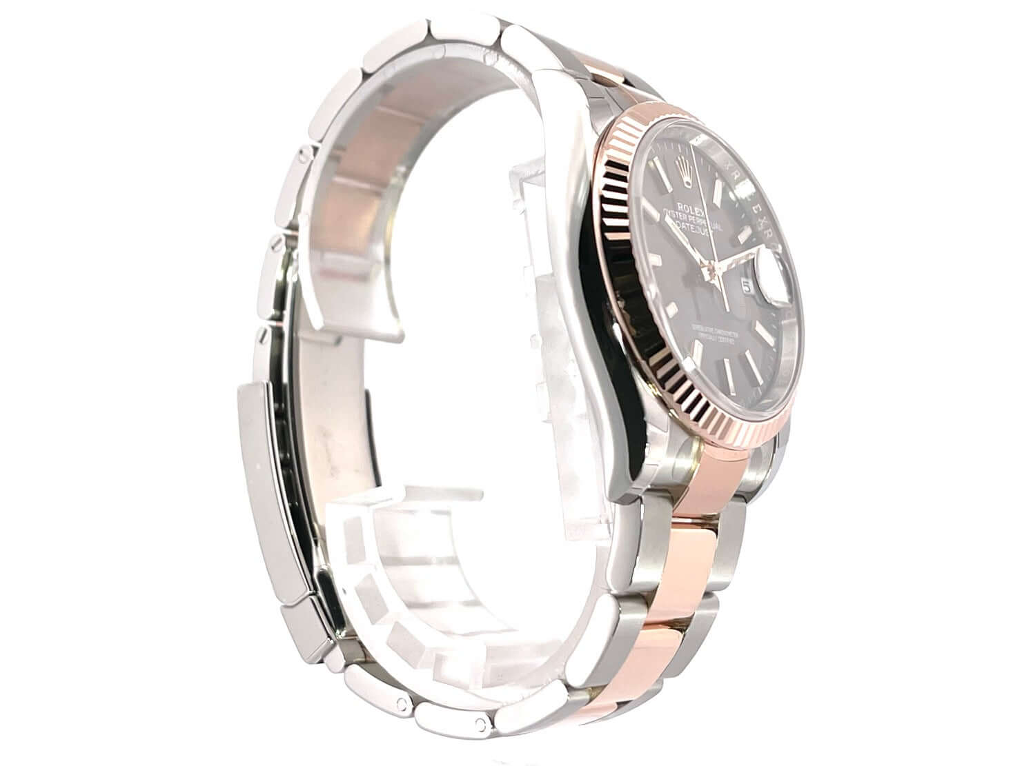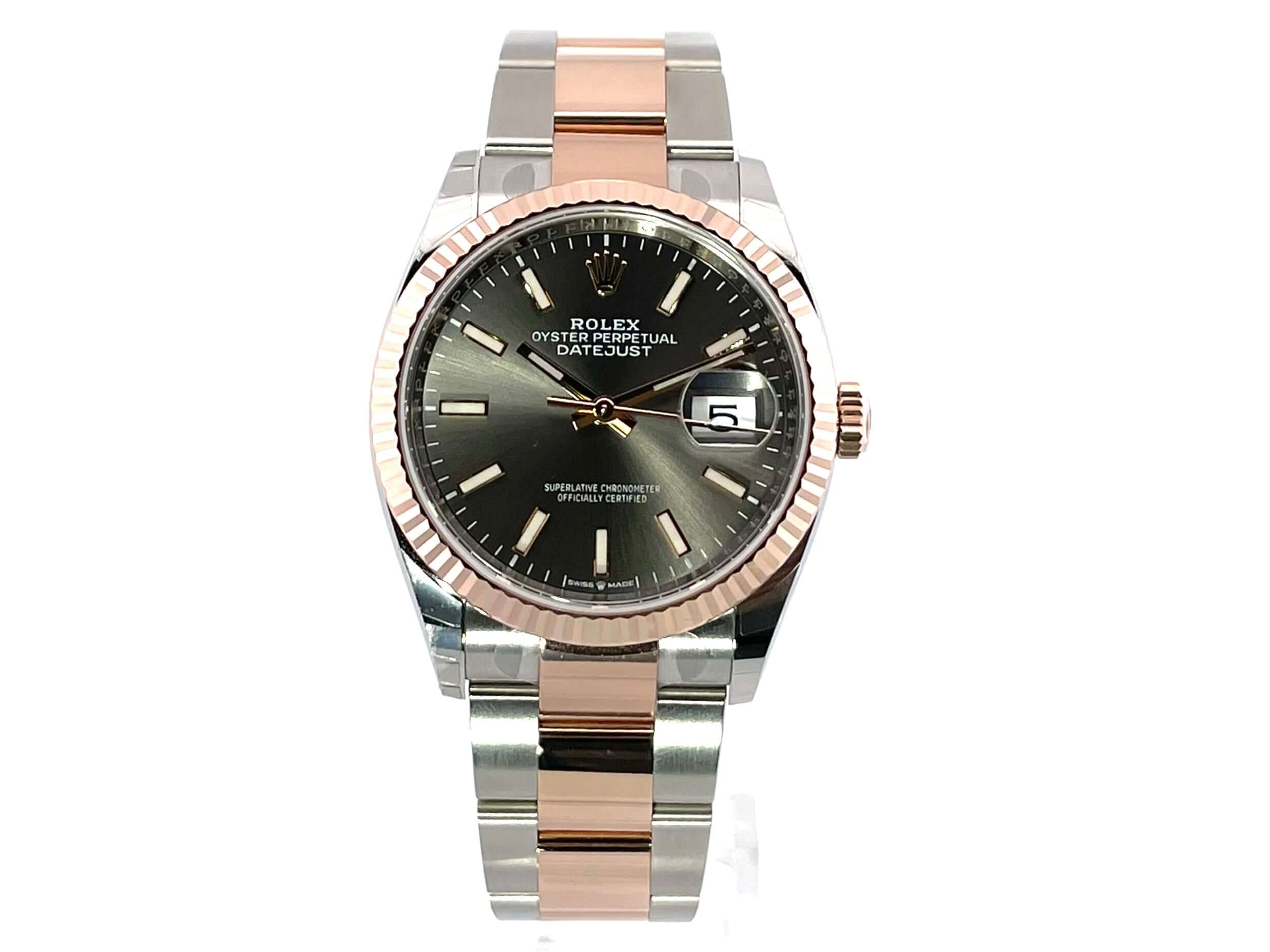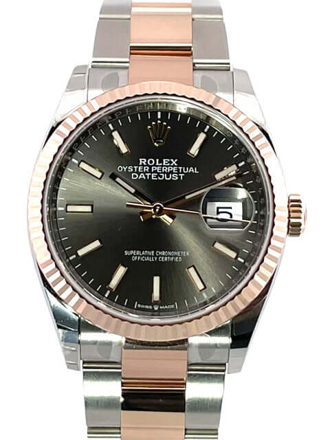Gehäuse aus Edelstahl / Everose-Gold poliert und satiniert, Gehäusedurchmesser 36 mm, geriffelte 18 kt Everose-Gold Lünette, Oyster Armband aus Edelstahl / 18 kt Everose-Gold poliert und satiniert mit Faltschließe, dunkles Rhodium Zifferblatt mit aufgesetzten roségoldenen Indizes, roségoldene Zeiger, Automatikwerk, Rolex Manufakturkaliber 3235 mit 31 Steine, 28.800 A/h, 70 Stunden Gangreserve, Datumsanzeige, Chronometer, kratzfestes Saphirglas, verschraubte 18 kt Everose-Gold Krone, Edelstahlboden verschraubt, Wasserdicht bis zu 10 bar.