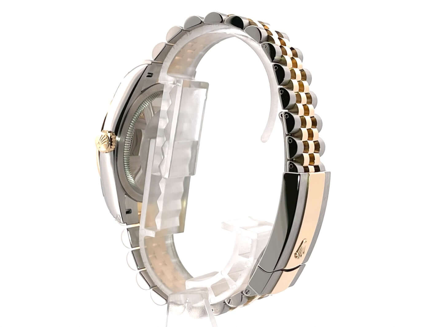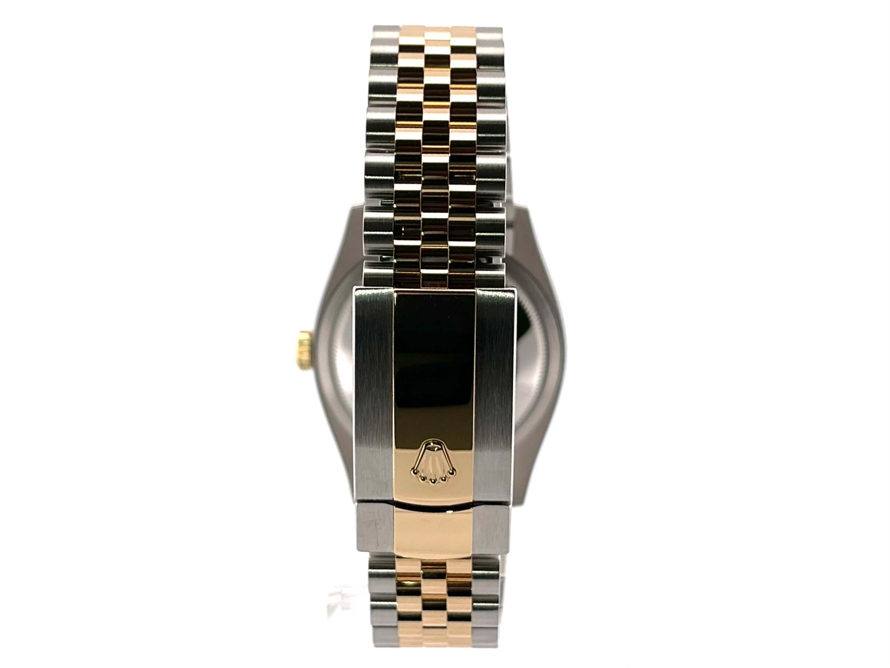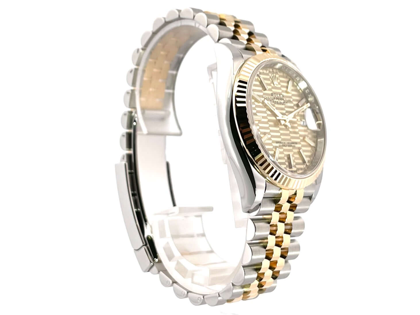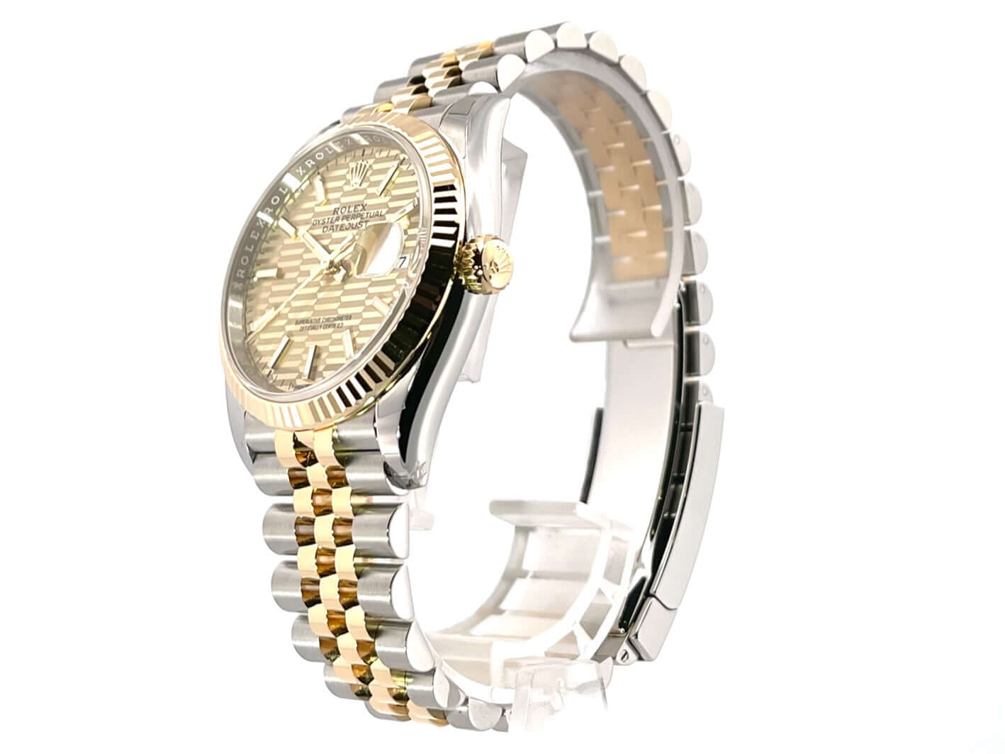 Gehäuse aus Edelstahl / Gelbgold poliert und satiniert, Gehäusedurchmesser 36 mm, geriffelte 18 kt Gelbgold Lünette, Jubilé Armband aus Edelstahl / 18 kt Gelbgold poliert und satiniert mit Faltschließe, goldfarbenes Riffelmuster Zifferblatt mit aufgesetzten Leuchtindizes, Gelbgold Zeiger, Automatikwerk, Rolex Manufakturkaliber 3235 mit 31 Steine, 28.800 A/h, 70 Stunden Gangreserve, Datumsanzeige, Chronometer, kratzfestes Saphirglas, verschraubte 18 kt Gelbgold Krone, Edelstahlboden verschraubt, wasserdicht bis zu 10 bar.