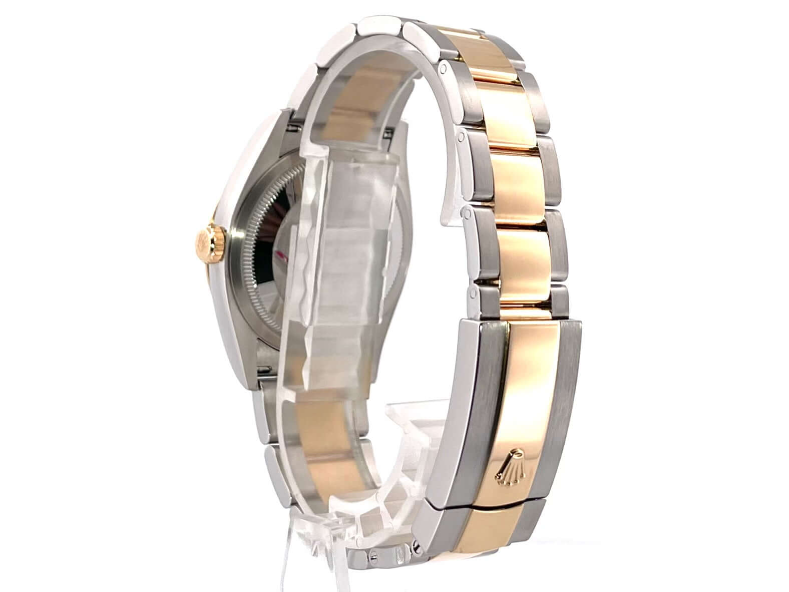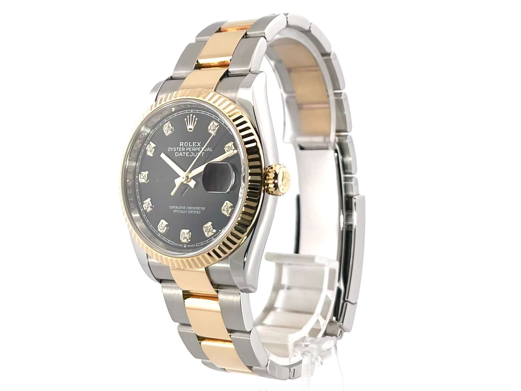 Gehäuse aus Edelstahl / Gelbgold poliert und satiniert, Gehäusedurchmesser 36 mm, geriffelte 18 kt Gelbgold Lünette, Oyster Armband aus Edelstahl / 18 kt Gelbgold poliert und satiniert mit Faltschließe, schwarzes Diamantzifferblatt, Gelbgold Zeiger, Automatikwerk, Rolex Manufakturkaliber 3235 mit 31 Steine, 28.800 A/h, 70 Stunden Gangreserve, Datumsanzeige, Chronometer, kratzfestes Saphirglas, verschraubte 18 kt Gelbgold Krone, Edelstahlboden verschraubt, Wasserdicht bis zu 10 bar.