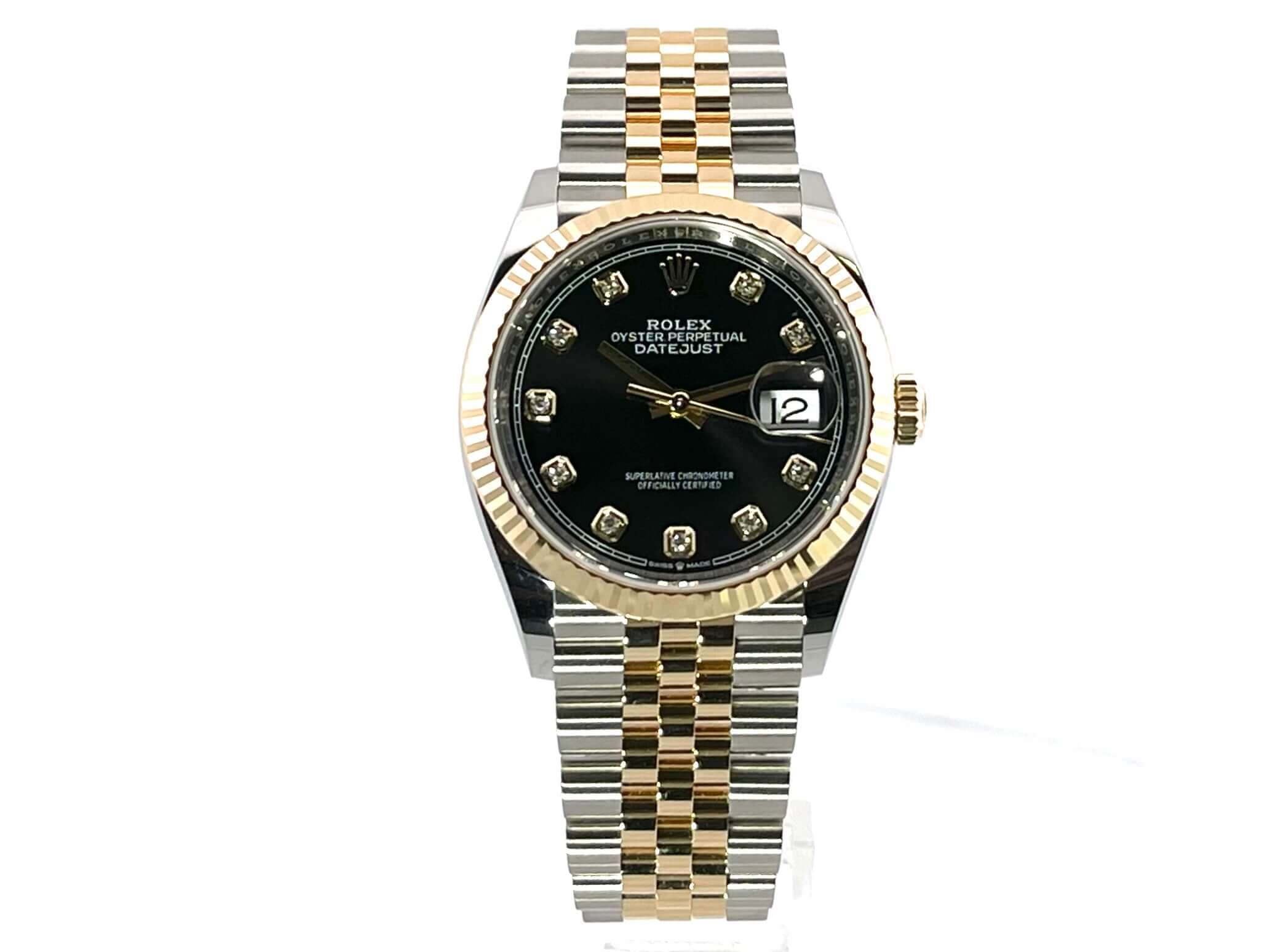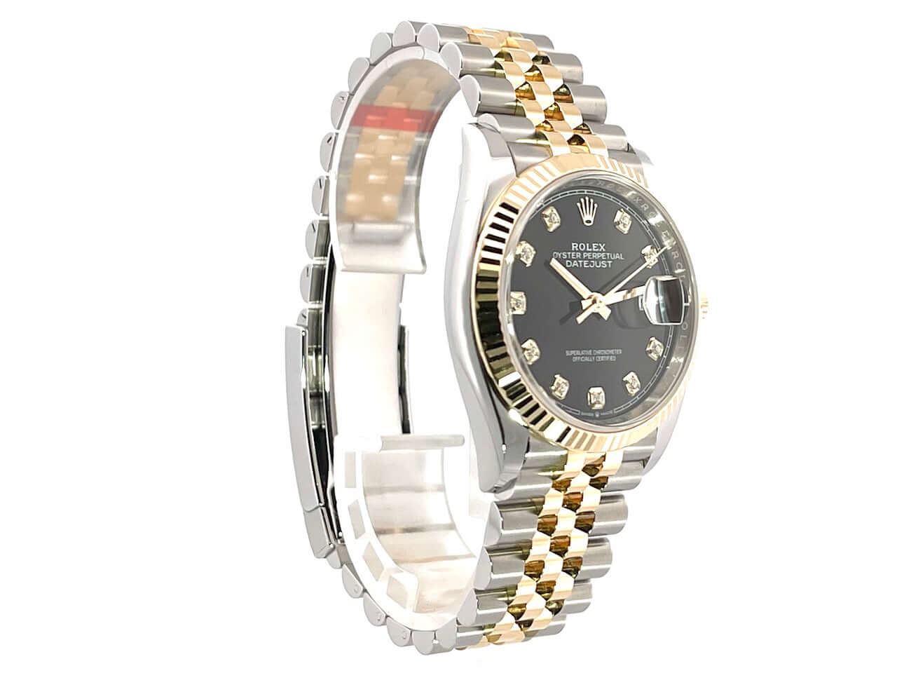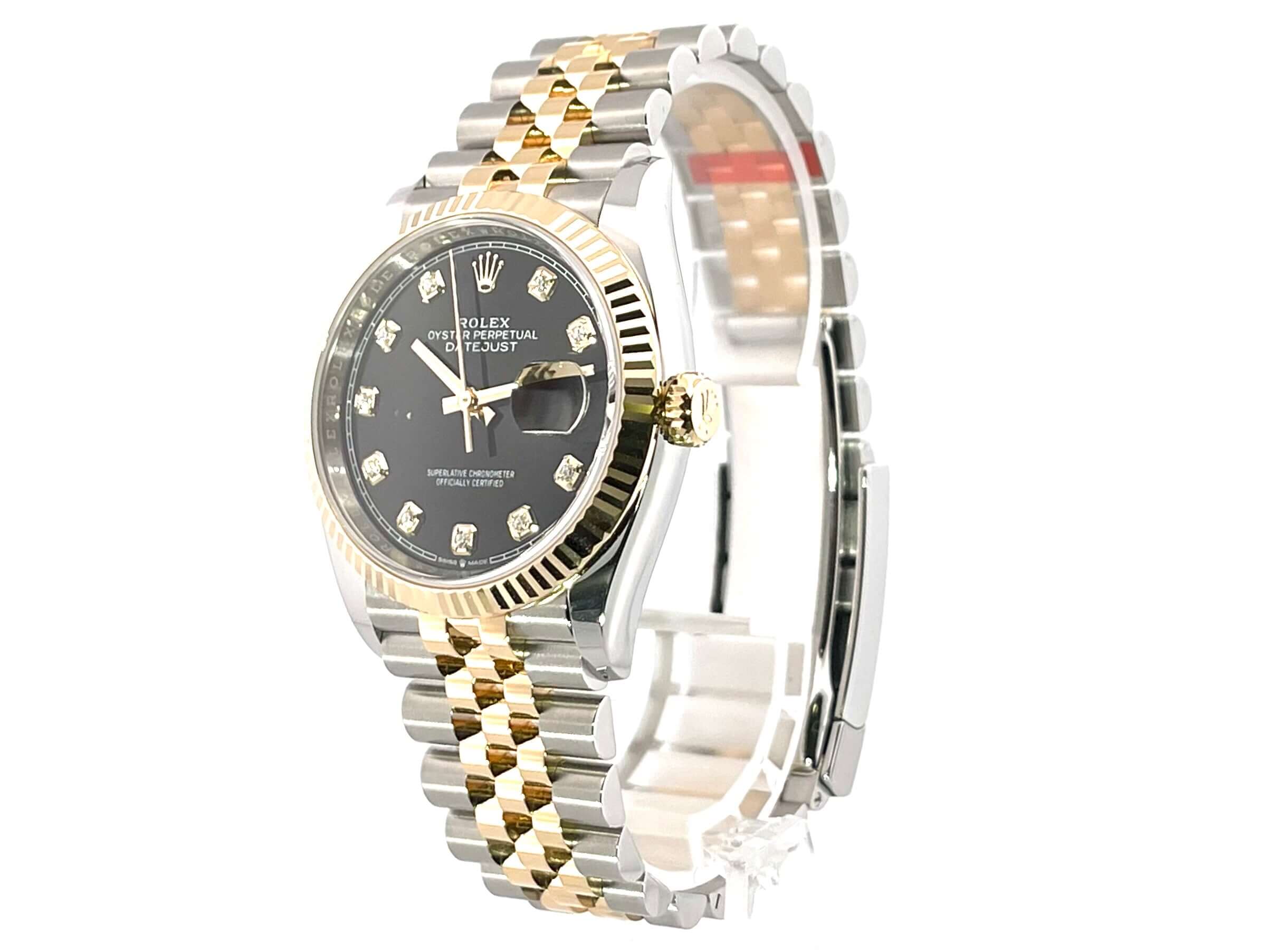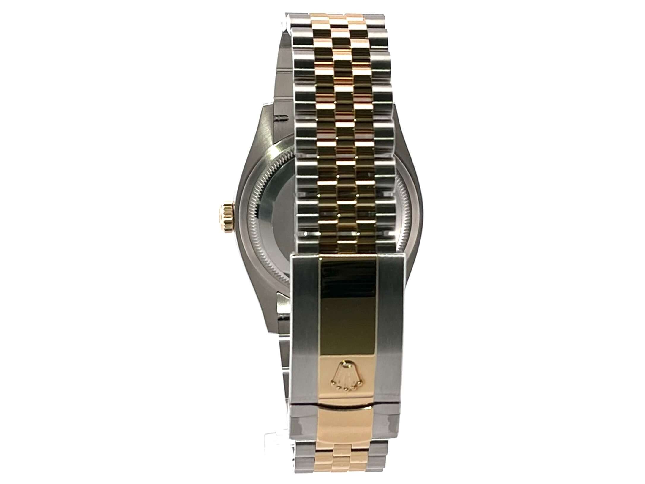 Gehäuse aus Edelstahl / Gelbgold poliert und satiniert, Gehäusedurchmesser 36 mm, geriffelte 18 kt Gelbgold Lünette, Jubilé Armband aus Edelstahl / 18 kt Gelbgold poliert und satiniert mit Faltschließe, schwarzes Diamantzifferblatt, Gelbgold Zeiger, Automatikwerk, Rolex Manufakturkaliber 3235 mit 31 Steine, 28.800 A/h, 70 Stunden Gangreserve, Datumsanzeige, Chronometer, kratzfestes Saphirglas, verschraubte 18 kt Gelbgold Krone, Edelstahlboden verschraubt, Wasserdicht bis zu 10 bar.