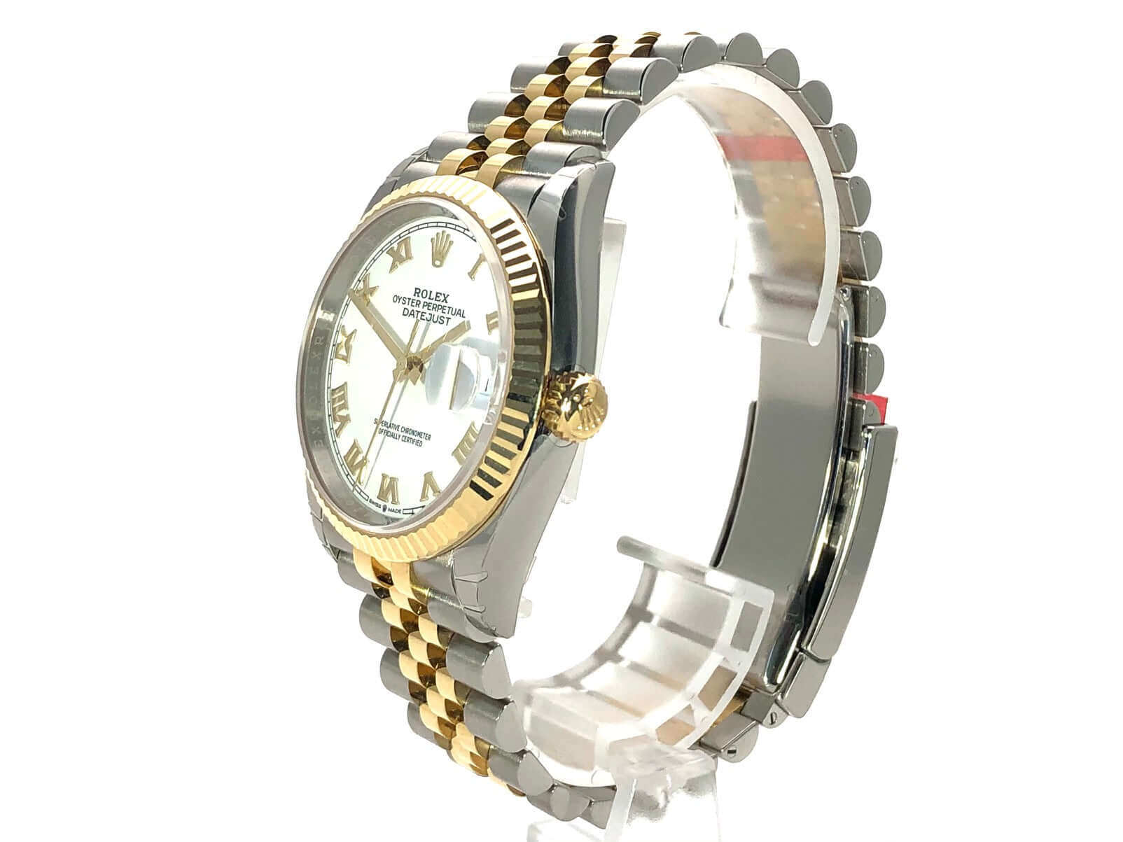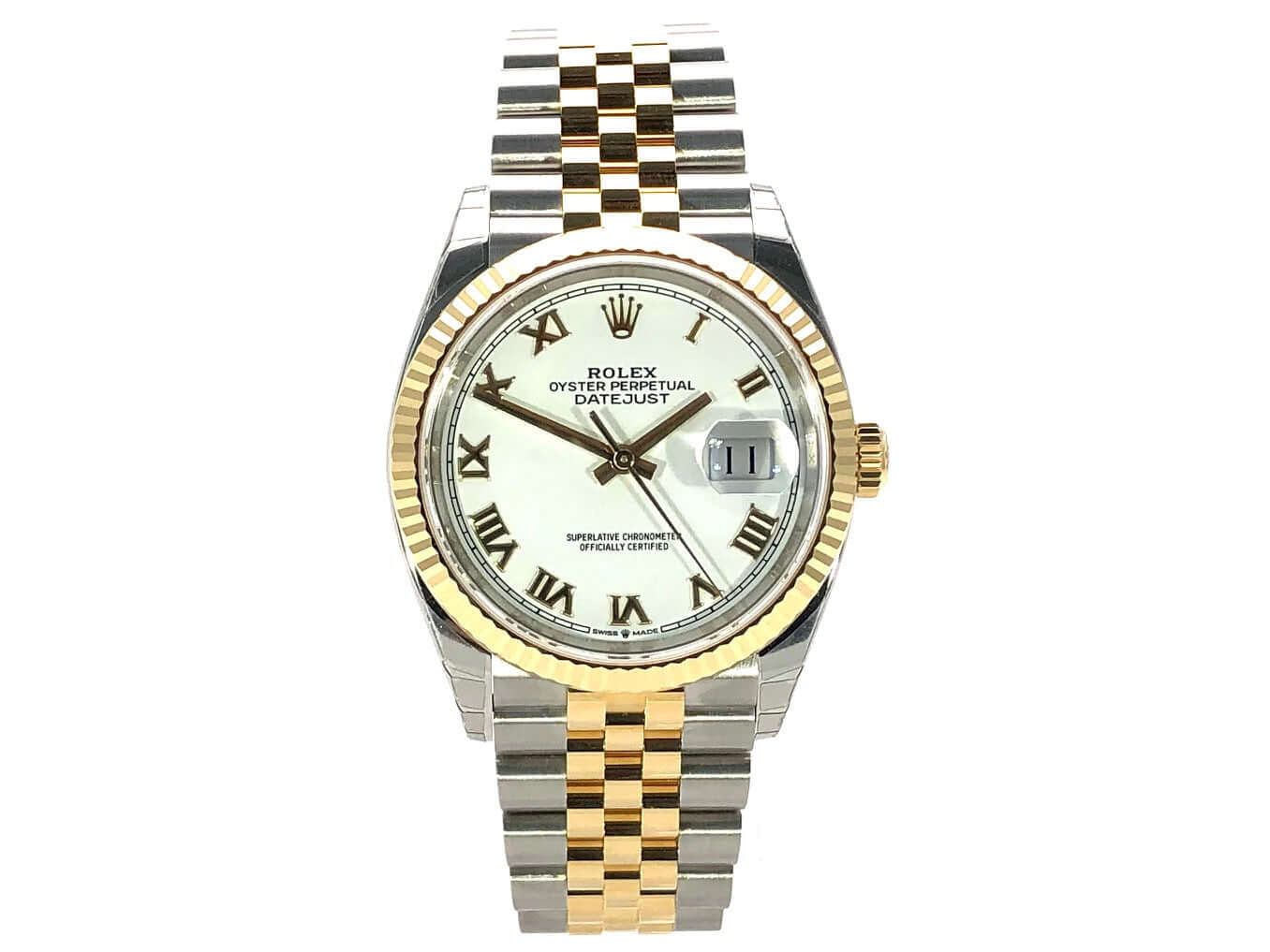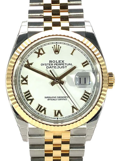 Gehäuse aus Edelstahl / Gelbgold poliert und satiniert, Gehäusedurchmesser 36 mm, geriffelte 18 kt Gelbgold Lünette, Jubilé Armband aus Edelstahl / 18 kt Gelbgold poliert und satiniert mit Faltschließe, weißes Zifferblatt mit aufgesetzten goldenen römischen Ziffern, goldene Zeiger, Automatikwerk, Rolex Manufakturkaliber 3235 mit 31 Steine, 28.800 A/h, 70 Stunden Gangreserve, Datumsanzeige, Chronometer, kratzfestes Saphirglas, verschraubte 18 kt Gelbgold Krone, Edelstahlboden verschraubt, Wasserdicht bis zu 10 bar.