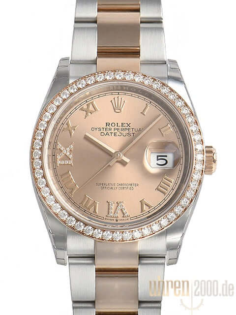 Gehäuse aus Edelstahl / Everose-Gold poliert und satiniert, Gehäusedurchmesser 36 mm, Diamantlünette aus 18 kt Everose-Gold, Oyster Armband aus Edelstahl / 18 kt Everose-Gold poliert und satiniert mit Faltschließe, Pinkfarbenes Zifferblatt mit römischen Ziffern und Diamanten, roségoldene Zeiger, Automatikwerk, Rolex Manufakturkaliber 3235 mit 31 Steine, 28.800 A/h, 70 Stunden Gangreserve, Datumsanzeige, Chronometer, kratzfestes Saphirglas, verschraubte 18 kt Everose-Gold Krone, Edelstahlboden verschraubt, Wasserdicht bis zu 10 bar.