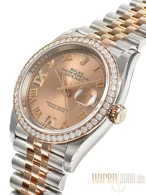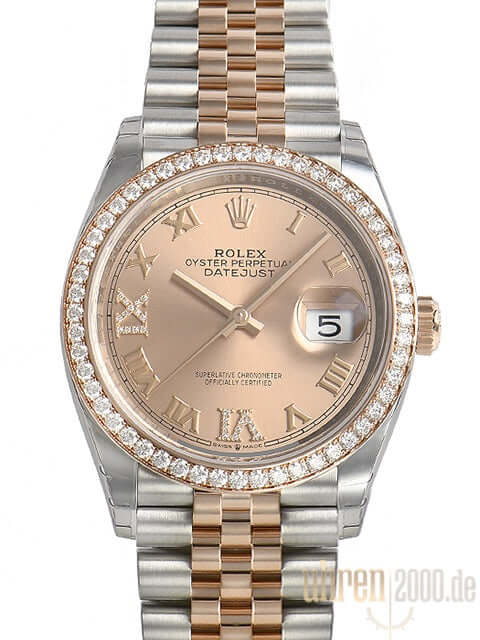 Gehäuse aus Edelstahl / Everose-Gold poliert und satiniert, Gehäusedurchmesser 36 mm, Diamantlünette aus 18 kt Everose-Gold, Jubile Armband aus Edelstahl / 18 kt Everose-Gold poliert und satiniert mit Faltschließe, Pinkfarbenes Zifferblatt mit römischen Ziffern und Diamanten, roségoldene Zeiger, Automatikwerk, Rolex Manufakturkaliber 3235 mit 31 Steine, 28.800 A/h, 70 Stunden Gangreserve, Datumsanzeige, Chronometer, kratzfestes Saphirglas, verschraubte 18 kt Everose-Gold Krone, Edelstahlboden verschraubt, Wasserdicht bis zu 10 bar.