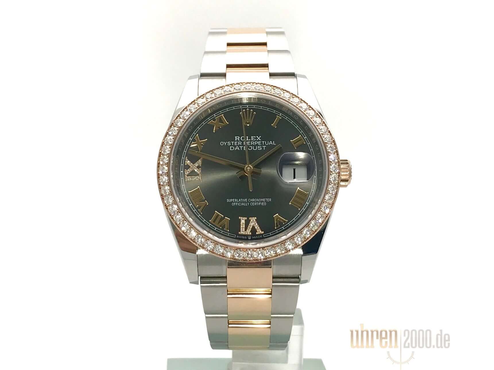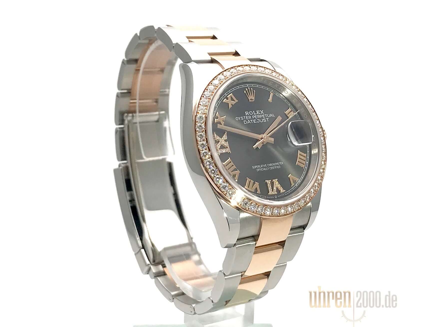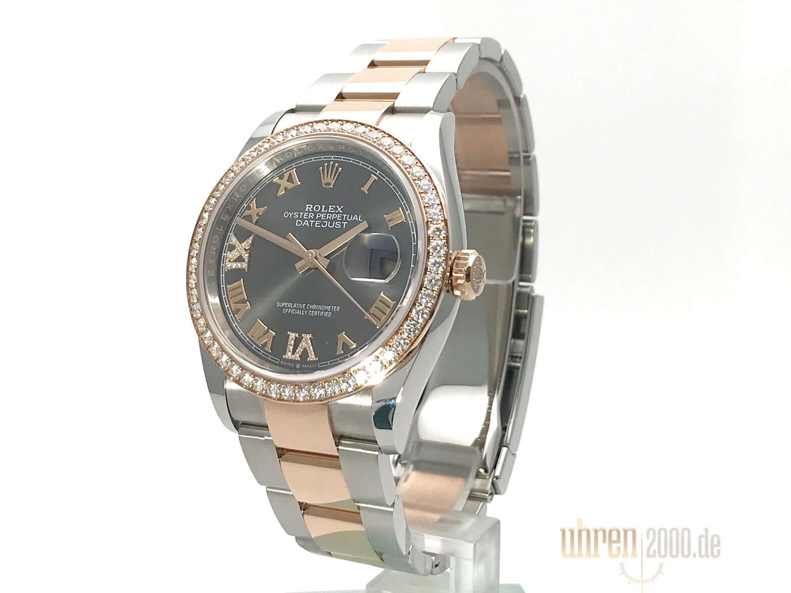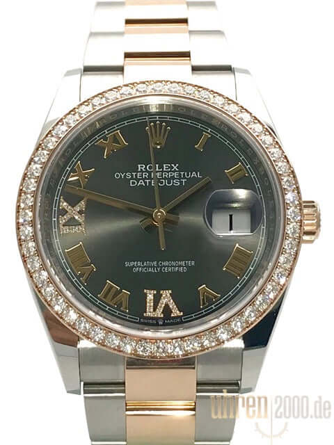 Gehäuse aus Edelstahl / Everose-Gold poliert und satiniert, Gehäusedurchmesser 36 mm, Diamantlünette aus 18 kt Everose-Gold, Oyster Armband aus Edelstahl / 18 kt Everose-Gold poliert und satiniert mit Faltschließe, dunkles Rhodium Zifferblatt mit römischen Ziffern und Diamanten, roségoldene Zeiger, Automatikwerk, Rolex Manufakturkaliber 3235 mit 31 Steine, 28.800 A/h, 70 Stunden Gangreserve, Datumsanzeige, Chronometer, kratzfestes Saphirglas, verschraubte 18 kt Everose-Gold Krone, Edelstahlboden verschraubt, Wasserdicht bis zu 10 bar.