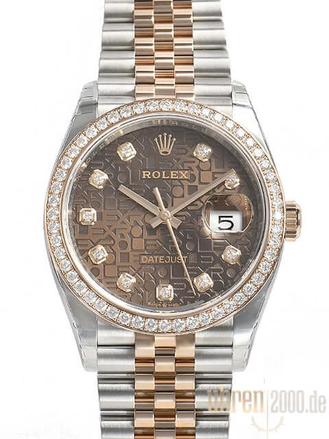Gehäuse aus Edelstahl / Everose-Gold poliert und satiniert, Gehäusedurchmesser 36 mm, Diamantlünette aus 18 kt Everose-Gold, Jubilé Armband aus Edelstahl / 18 kt Everose-Gold poliert und satiniert mit Faltschließe, braunes Jubile Diamantzifferblatt, roségoldene Zeiger, Automatikwerk, Rolex Manufakturkaliber 3235 mit 31 Steine, 28.800 A/h, 70 Stunden Gangreserve, Datumsanzeige, Chronometer, kratzfestes Saphirglas, verschraubte 18 kt Everose-Gold Krone, Edelstahlboden verschraubt, Wasserdicht bis zu 10 bar.