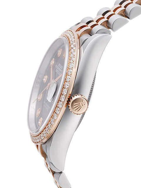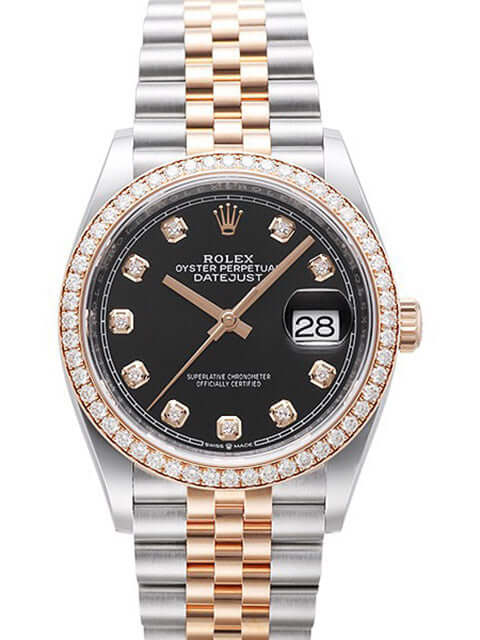 Gehäuse aus Edelstahl / Everose-Gold poliert und satiniert, Gehäusedurchmesser 36 mm, Diamantlünette aus 18 kt Everose-Gold, Jubilé Armband aus Edelstahl / 18 kt Everose-Gold poliert und satiniert mit Faltschließe, schwarzes Diamantzifferblatt, roségoldene Zeiger, Automatikwerk, Rolex Manufakturkaliber 3235 mit 31 Steine, 28.800 A/h, 70 Stunden Gangreserve, Datumsanzeige, Chronometer, kratzfestes Saphirglas, verschraubte 18 kt Everose-Gold Krone, Edelstahlboden verschraubt, Wasserdicht bis zu 10 bar.