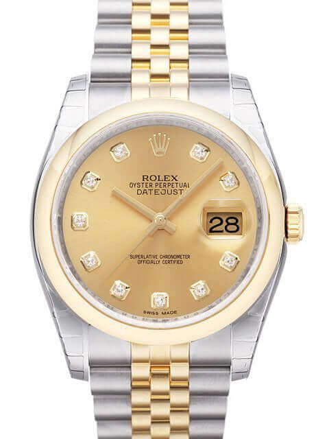 Gehäuse aus Edelstahl poliert und satiniert, Gehäusedurchmesser 36 mm, Gehäusehöhe 11,4 mm, glatte 18 kt Gelbgold Lünette poliert, Jubilé Edelstahl / 18 kt Gelbgold Armband poliert und satiniert mit Faltschließe, Champagner Zifferblatt mit 10 aufgesetzten Diamanten, goldene Zeiger, Automatikwerk, Chronometer, Rolex Manufakturkaliber 3135 mit 31 Steine, Schwingung 28.800 A/h, Datumsanzeige, kratzfestes Saphirglas, Krone aus 18 kt Gelbgold verschraubbar, verschraubter Edelstahlboden, Wasserdicht bis 10 bar.