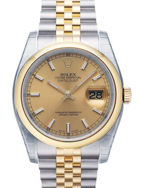 Gehäuse aus Edelstahl poliert und satiniert, Gehäusedurchmesser 36 mm, Gehäusehöhe 11,4 mm, glatte 18 kt Gelbgold Lünette poliert, Jubilé Edelstahl / 18 kt Gelbgold Armband poliert und satiniert mit Faltschließe, Champagner Zifferblatt mit aufgesetzten goldenen Leuchtindizes, goldene Leuchtzeiger, Automatikwerk, Chronometer, Rolex Manufakturkaliber 3135 mit 31 Steine, Schwingung 28.800 A/h, kratzfestes Saphirglas, Datumsanzeige, Krone aus 18 kt Gelbgold verschraubbar, verschraubter Edelstahlboden, Wasserdicht bis 10 bar.
