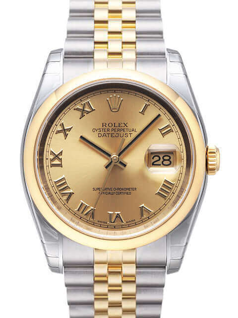Gehäuse aus Edelstahl poliert und satiniert, Gehäusedurchmesser 36 mm, Gehäusehöhe 11,4 mm, glatte 18 kt Gelbgold Lünette poliert, Jubilé Edelstahl / 18 kt Gelbgold Armband poliert und satiniert mit Faltschließe, Champagner Zifferblatt mit aufgesetzten goldenen römischen Ziffern, goldene Zeiger, Automatikwerk, Chronometer, Rolex Manufakturkaliber 3135 mit 31 Steine, Schwingung 28.800 A/h, kratzfestes Saphirglas, Datumsanzeige, Krone aus 18 kt Gelbgold verschraubbar, verschraubter Edelstahlboden, Wasserdicht bis 10 bar.