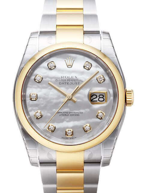 Gehäuse aus Edelstahl poliert und satiniert, Gehäusedurchmesser 36 mm, Gehäusehöhe 11,4 mm, glatte 18 kt Gelbgold Lünette poliert, Oyster Edelstahl / 18 kt Gelbgold Armband poliert und satiniert mit Faltschließe, Perlmutt Zifferblatt mit 10 aufgesetzten Diamanten, goldene Zeiger, Automatikwerk, Rolex Manufakturkaliber 3135 mit 31 Steine, Schwingung 28.800 A/h, Chronometer, Datumsanzeige, Krone aus 18 kt Gelbgold verschraubbar, kratzfestes Saphirglas, verschraubter Edelstahlboden, Wasserdicht bis 10 bar.